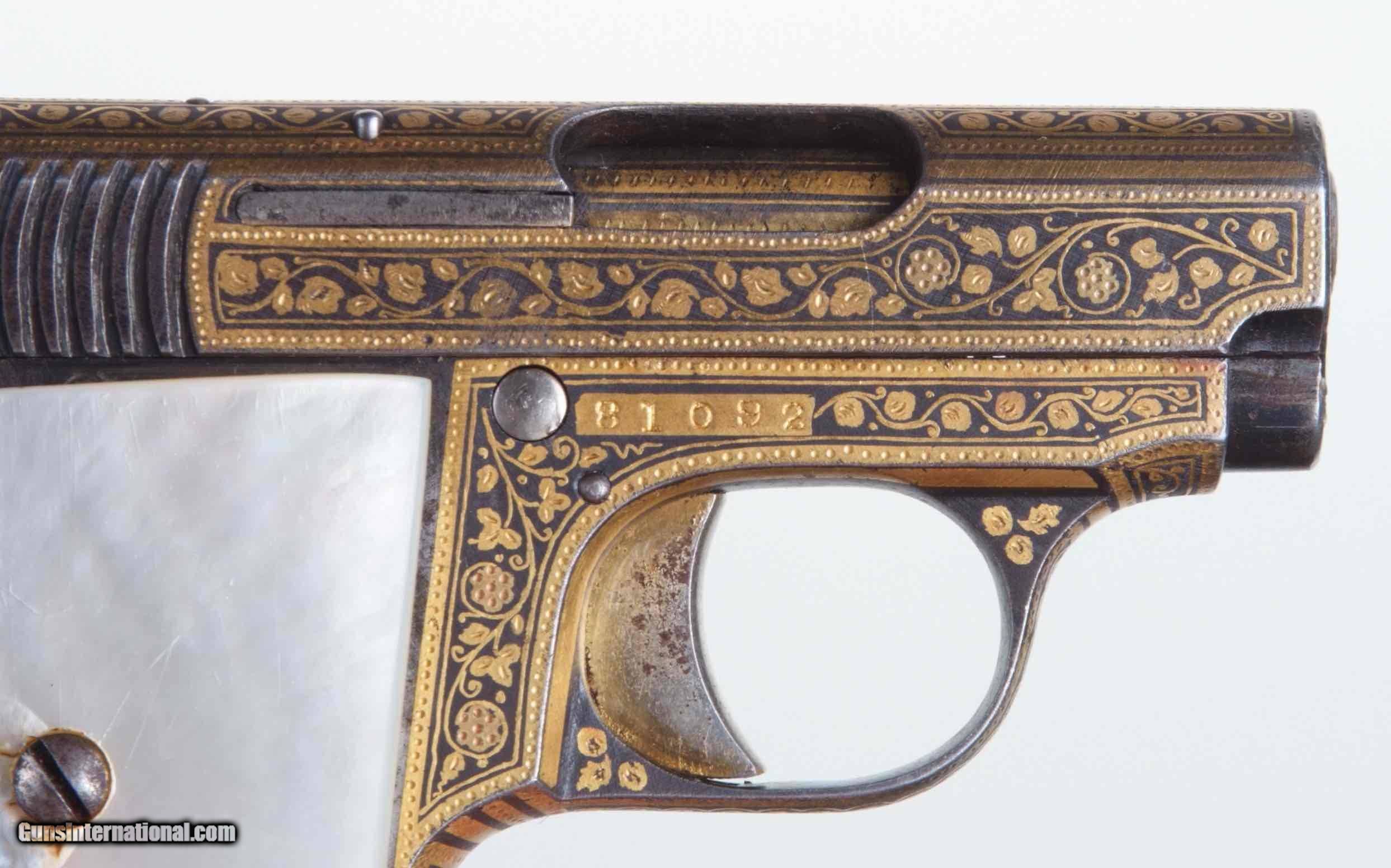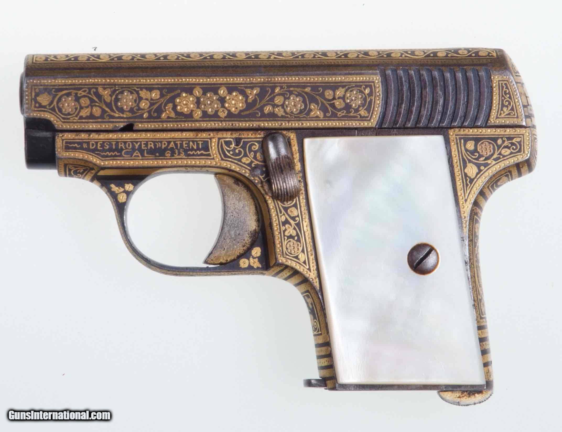 Standard configuration Destroyer with fixed front and rear sight and 2.25” barrel measuring 4.5” length and 3” height. Left frame marked “DESTROYER PATENT/CAL. 6.35.” Full Serial number on right side of frame. Damascening applied in a floral/scroll pattern with accented border over most surfaces, including the exposed portion of the barrel hood, with classic Eibar-inspired dragon on backstrap. Magazine floorplate and screwheads are also damascened with a gold wash having been applied to the thumb safety, trigger, and magazine release. In fact, the only portions of this pistol not embellished are the front of the muzzle, the inside of the trigger guard and the bottom of the frame. Smooth mother-of-pearl grips. Blued magazine body with five indicator holes and damascened floorplate. Disassembly shows major parts with matching assembly number “336”.