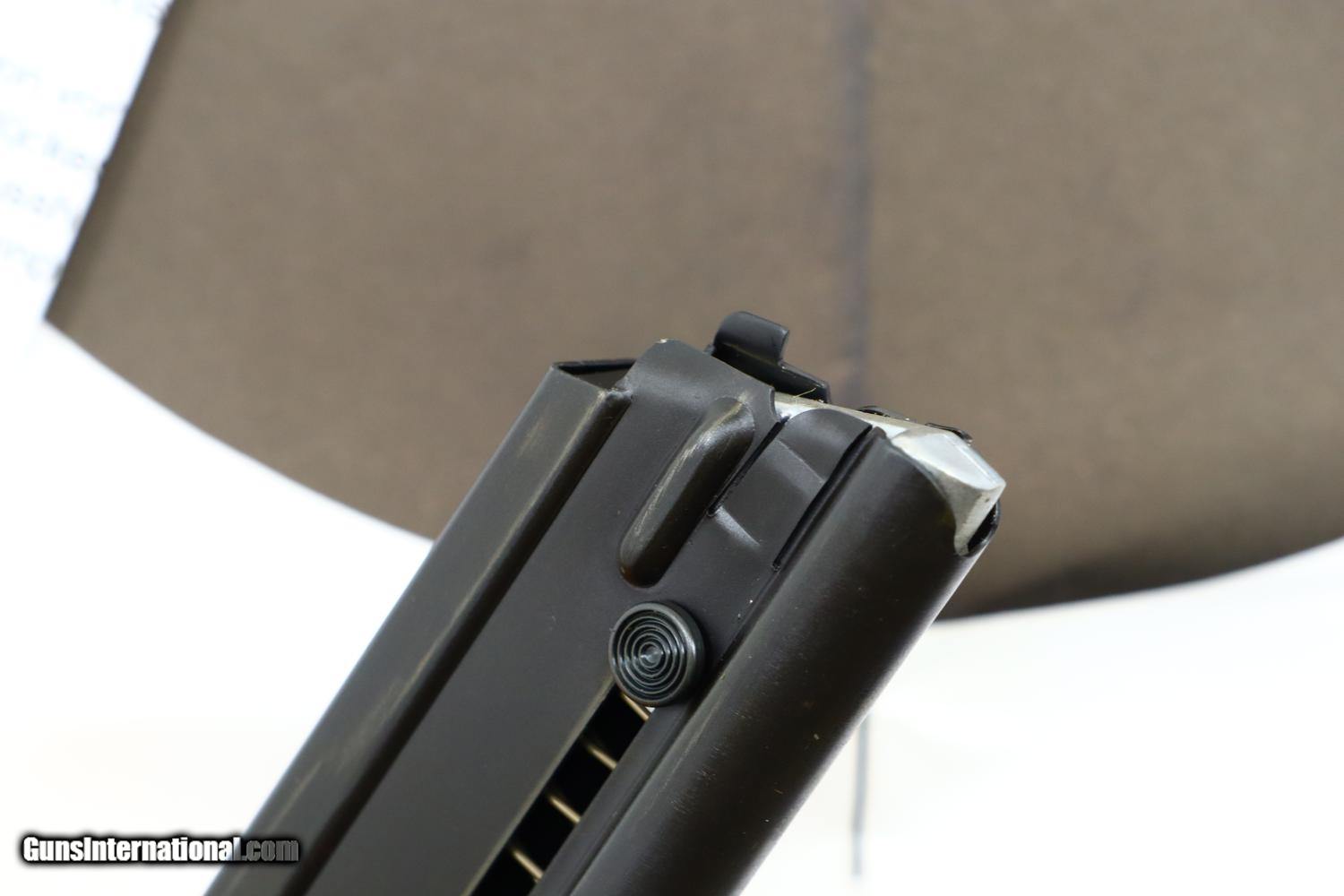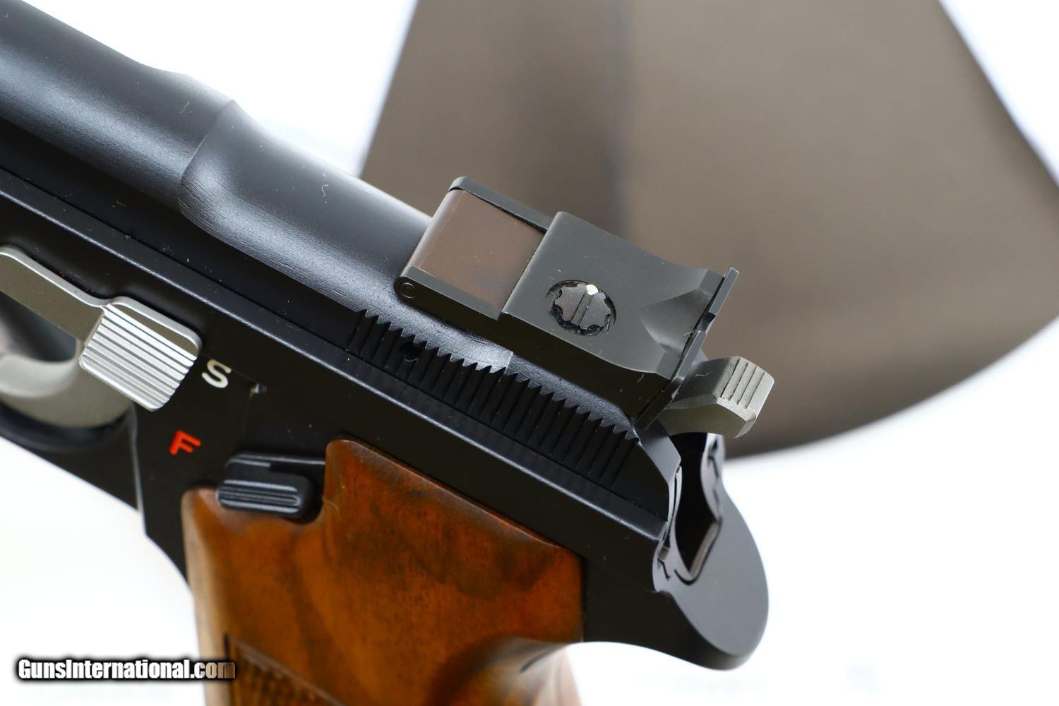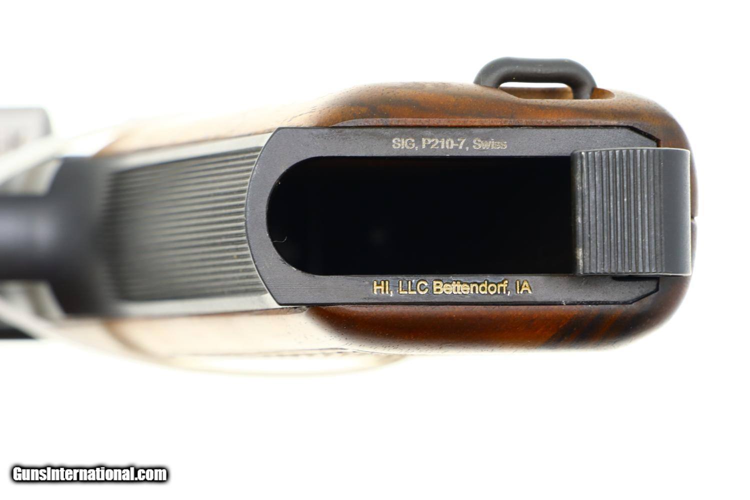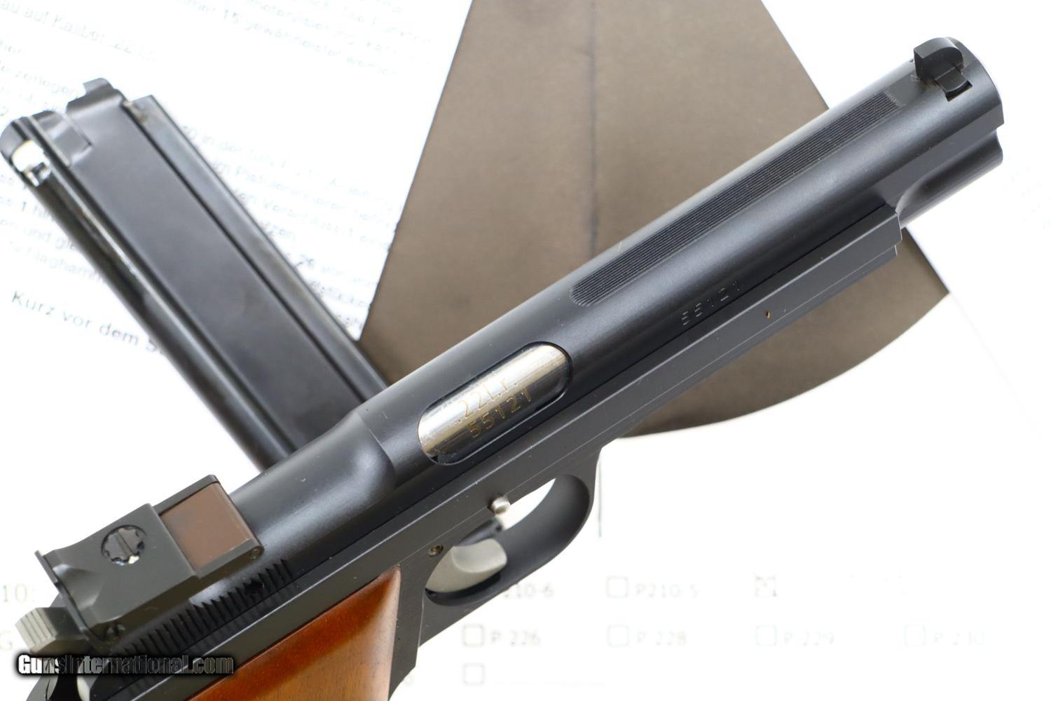 Late production SIG P210-7 dedicated target pistol with patridge front sight and fully adjustable rear sight. Late, scalloped slide configuration. Major parts matte finished with brightly polished barrel and matte in-the-white hammer, slide release, and trigger. Checkered wood grips, .22 LR dedicated magazine with blued body. Undated, matching Swiss Arms target and SIG Arms multilingual sheet detailing .22 LR conversion kit. Sold in a black SIG Sauer carrying case.