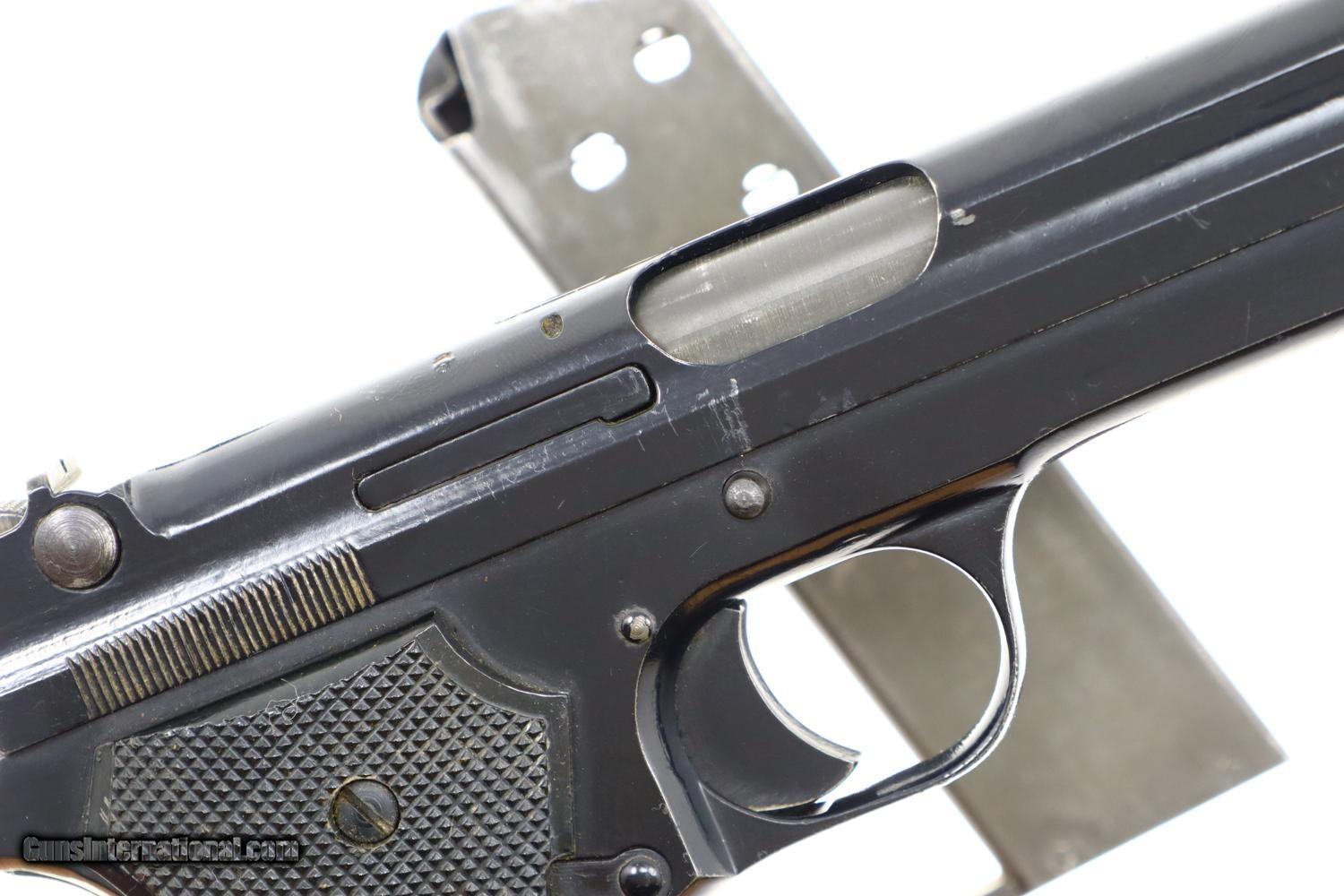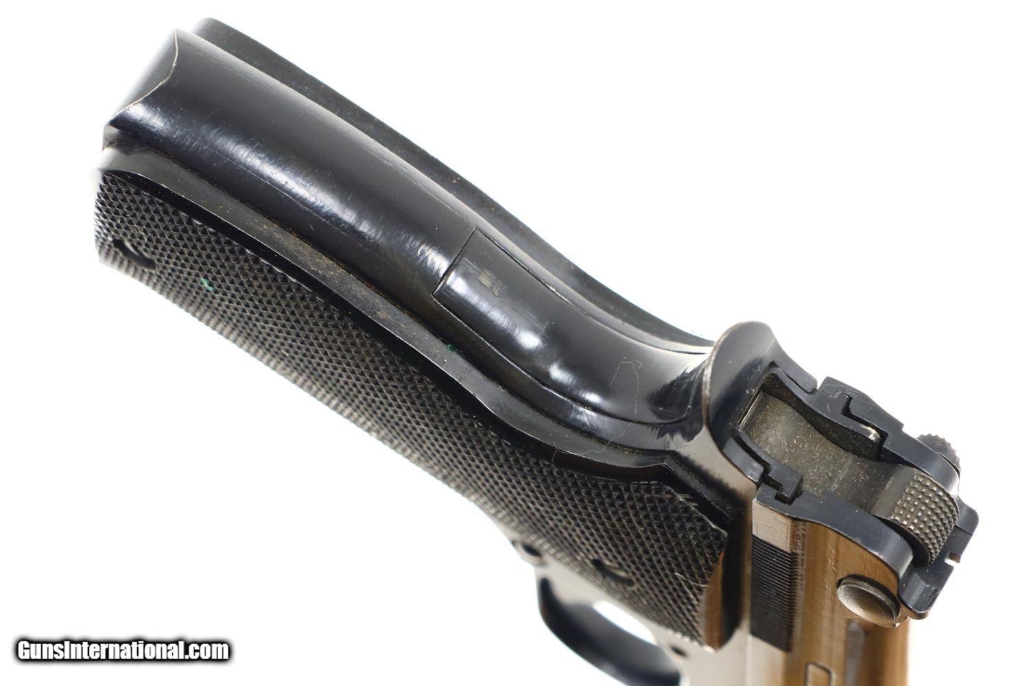 Description: Excellent example of French 1935A pistol, cal 7.65mm French Long, with loaded indicator as issued to the Germans during WWII. Typical black painted finish with waffenamt acceptance breaking through the finish on left side of frame. Black molded grips with fine checkering and narrow border. Original unmarked magazine with phosphated body and black painted floorplate. Synopsis: French, 1935A, WWII, German Military Pistol, C1882A, A-1855 Condition: Excellent with minimal sharp edge wear, holster rub marks under trigger guard, on frontstrap and lower portion of detachable hammer group on backstrap. Excellent grips and magazine. Near mirror bore. Slide hold open a little sticky, likely from congealed grease. A wonderful, classic pistol used by the Germans in WWII, later serving as a model for the SIG P210/P49 series of pistols ~~Insured shipping fee of $55; most packages shipped using FedEx 2nd Day.~~ SOLD Manufacturer: French Serial Number: C1882A Caliber Info: 7.65 mmL |