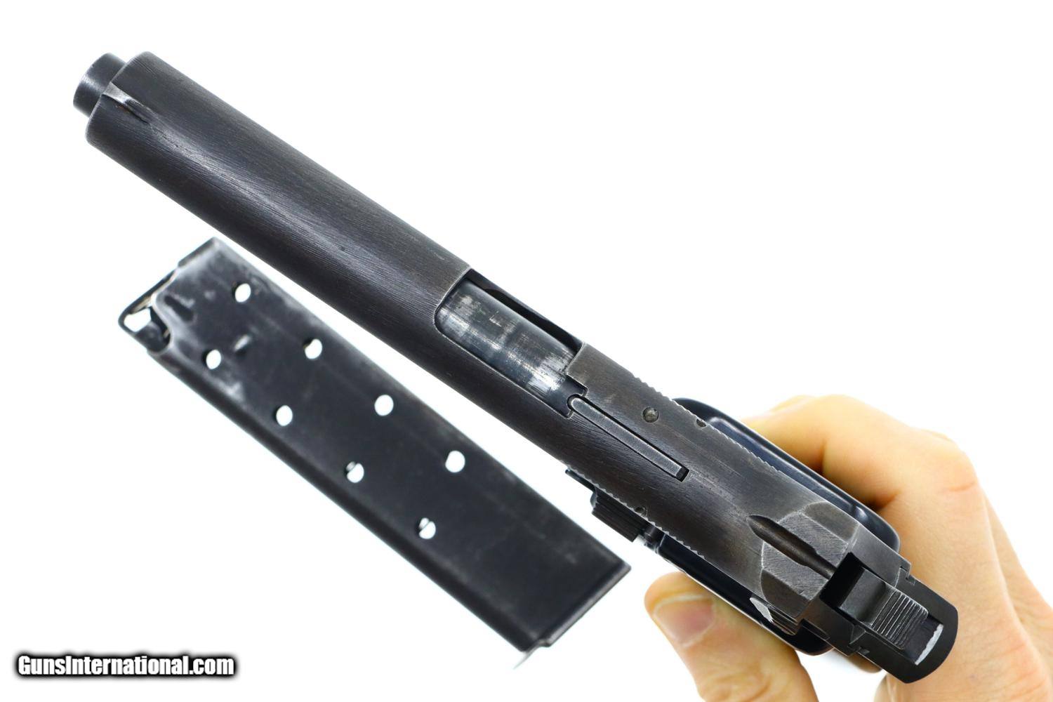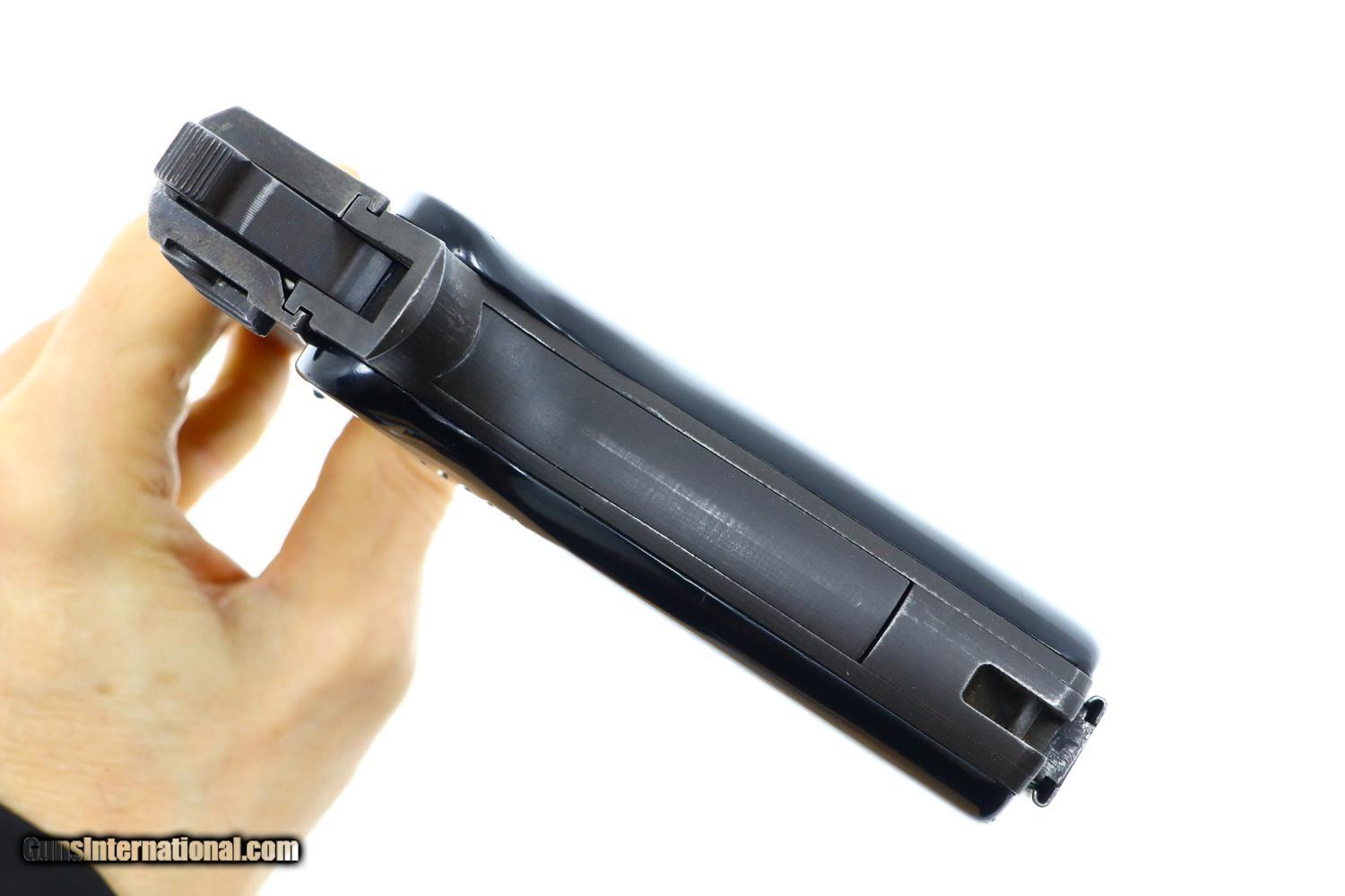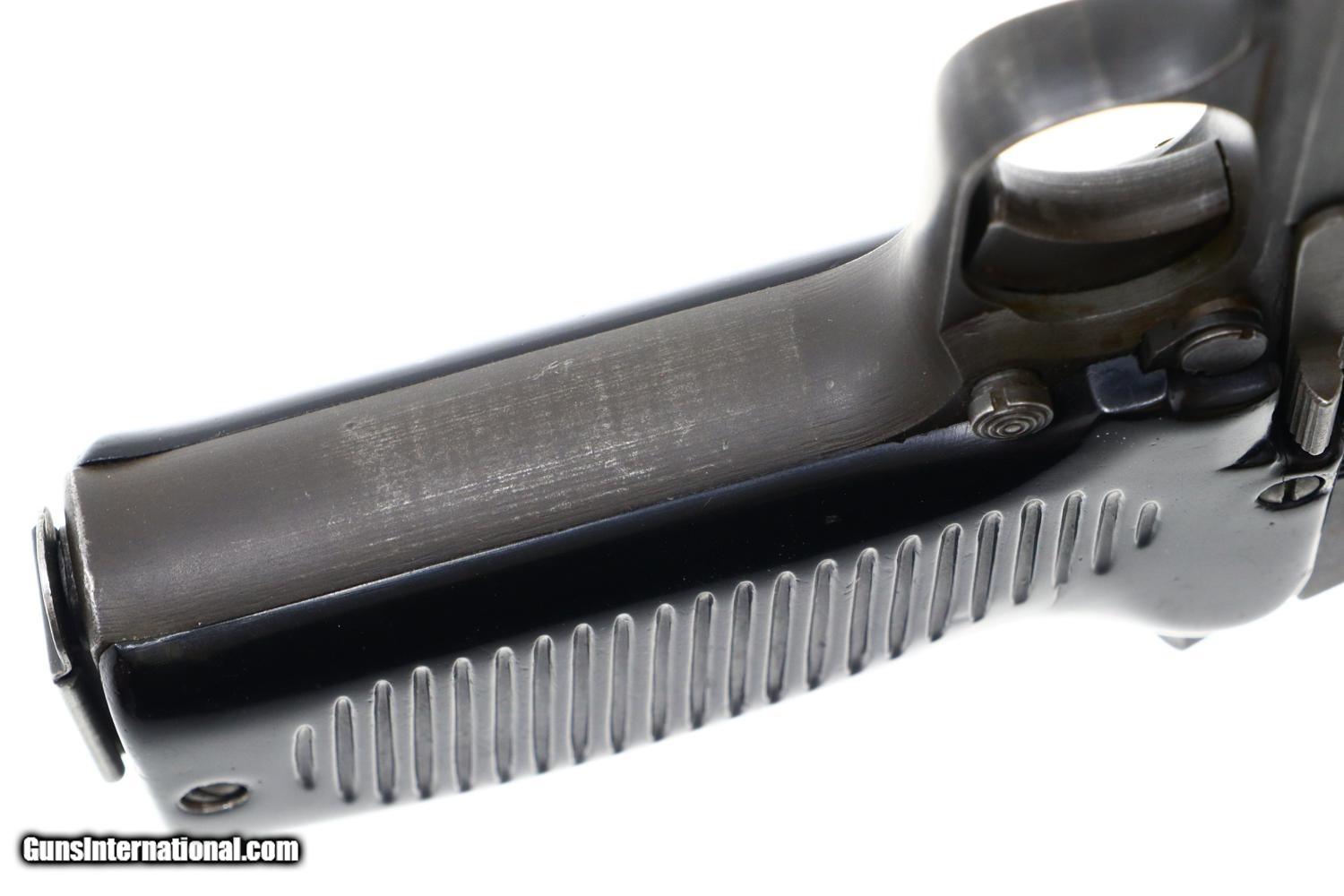 VG+ with original parkerizing showing thinning in places one might expect from a service pistol having had light/moderate use. Comparable condition grips, with scattered handling marks, but no cracks. Slightly dull bore with sharp rifling. Perfect manual mechanics. A classic French military pistol made in large quantity over approximately 20 years by 2 manufacturers, but seldom available for sale in the United States.