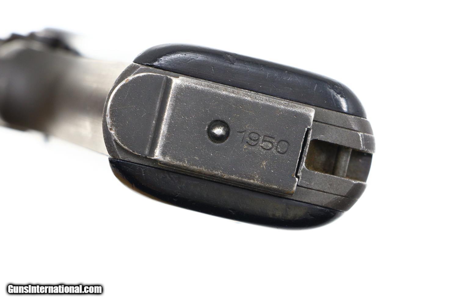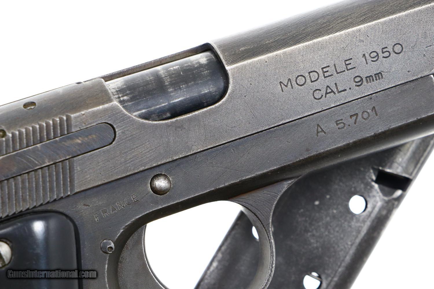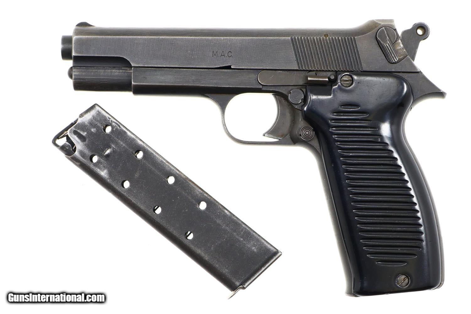 Standard configuration Model 1950, 9 mmP, as made by Manufacture d'armes de Châtellerault (MAC) whose production began in 1953 and continued to 1963 before being transfered to MAS. This particular gun, in the 'A block', was number 7140 of the first batch of pistols. Influenced by the 1935 S, the pistol is larger and has a longer grip frame for a 9 shot in-line magazine. The left side of the slide is marked with the initials 'MAC.' The right side of the slide references the model and caliber. Serial number on the right side of the frame. As typical for many military pistols of this era, it is a single action, locked breech gun with a swinging link and easily detachable hammer group. Fixed front sight and notched rear sight with top mounted extractor. Fitted with black Backelite grips with horizontal serrations. Parkerized magazine with 8 indicator holes and a detachable floorplate marked 1950.