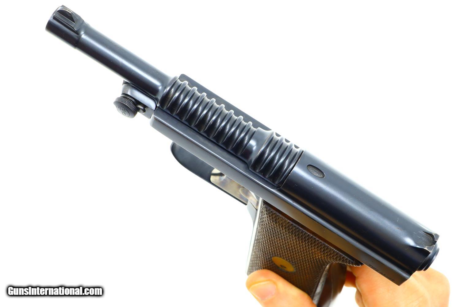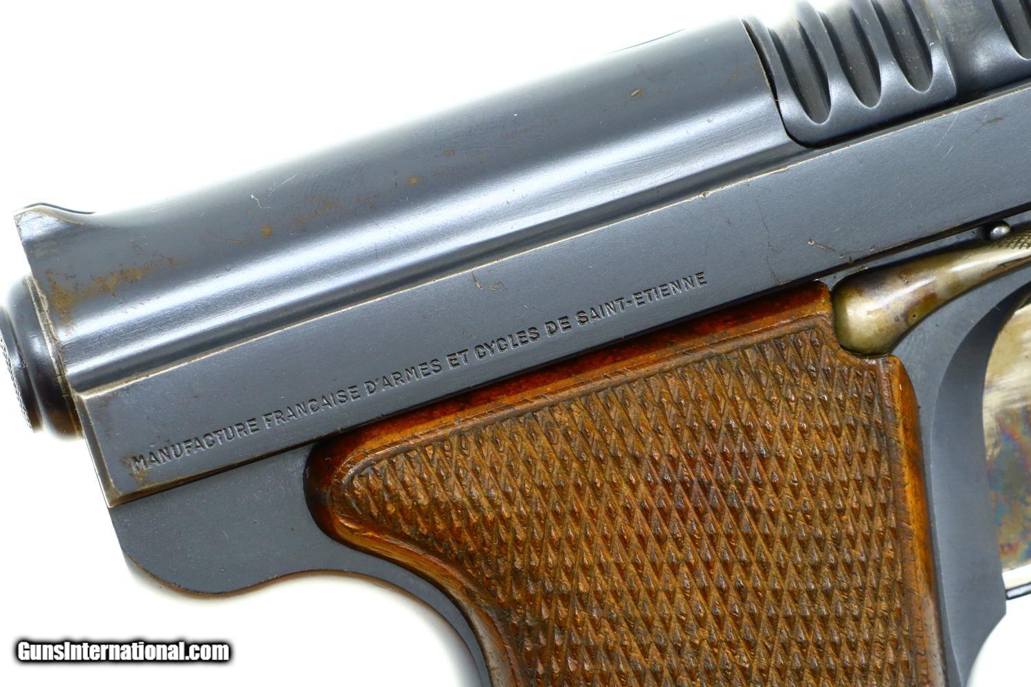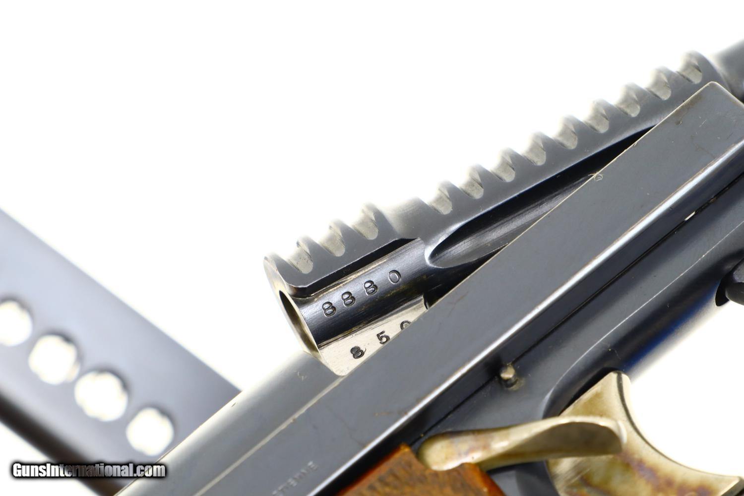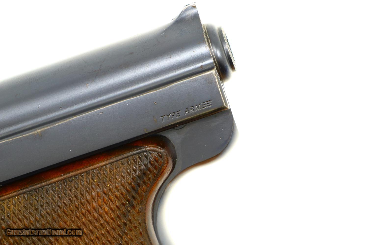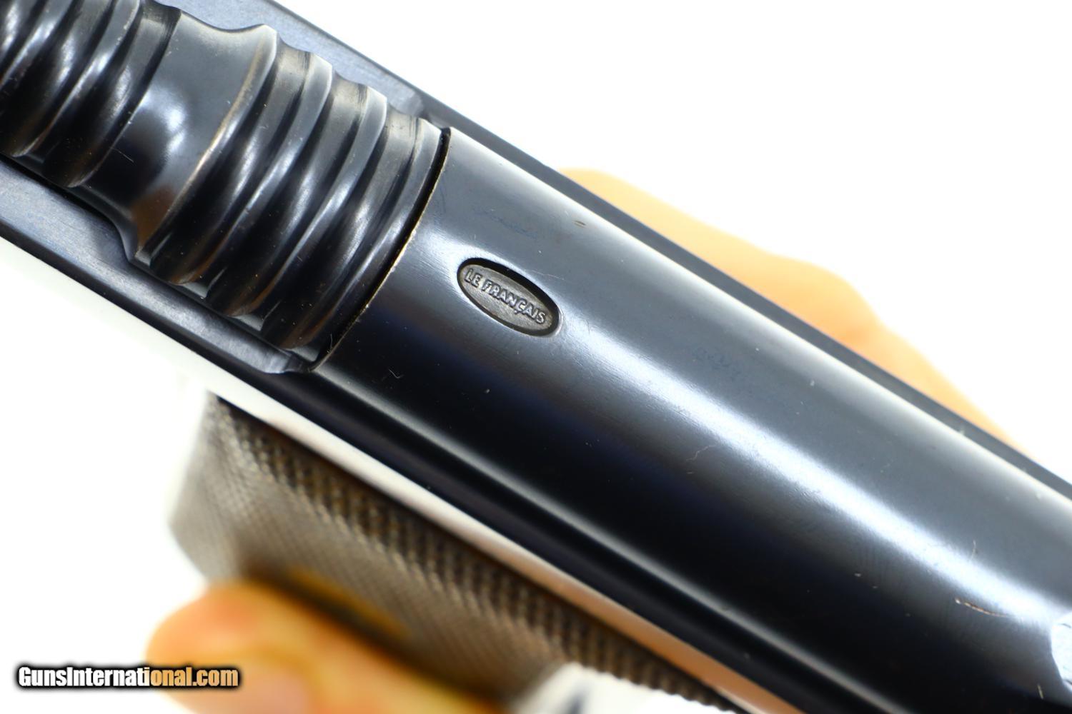 Description: Standard configuration Type Armee, Model 1928, with 5” finned barrel having fixed front and rear sight. Unique flip barrel. Double action only mechanism with correct magazine, this example with the spare cartridge loop and numbered with an encircled “6467”. Top of slide marked “Le Francais” in a small oval. Model notation “Type Armee” on the left side of the slide; manufacturer “MANUFACTURE FRANCAISE D-ARMES ET CYCLES DE SAINT-ETIENNE” on the right side of the slide. Major parts rust blued with beautifully case hardened trigger and release lever. European walnut checkered panels whose inserted discs retain the internally securing parts. Magazine with release at base having seven indicator holes. Synopsis: Manufrance, Mod 28, Finned Barrel, Armee Pistol, 8880, A-1872 Condition: At least 98% bright original rust blue, with minimal sharp edge wear in usual locations. Comparable condition case hardening. Generally excellent but oil darkened grips. Comparable condition magazine with insertional wear as photographed. Near mirror bright bore. Perfect manual mechanics. One of the most impressive and scarce large caliber pistols to have been tested by the French military. ~~Insured shipping fee of $75; most packages shipped using FedEx 2nd Day.~~ SOLD Manufacturer: Manufrance Serial Number: 8880 Caliber Info: 9mmBL |