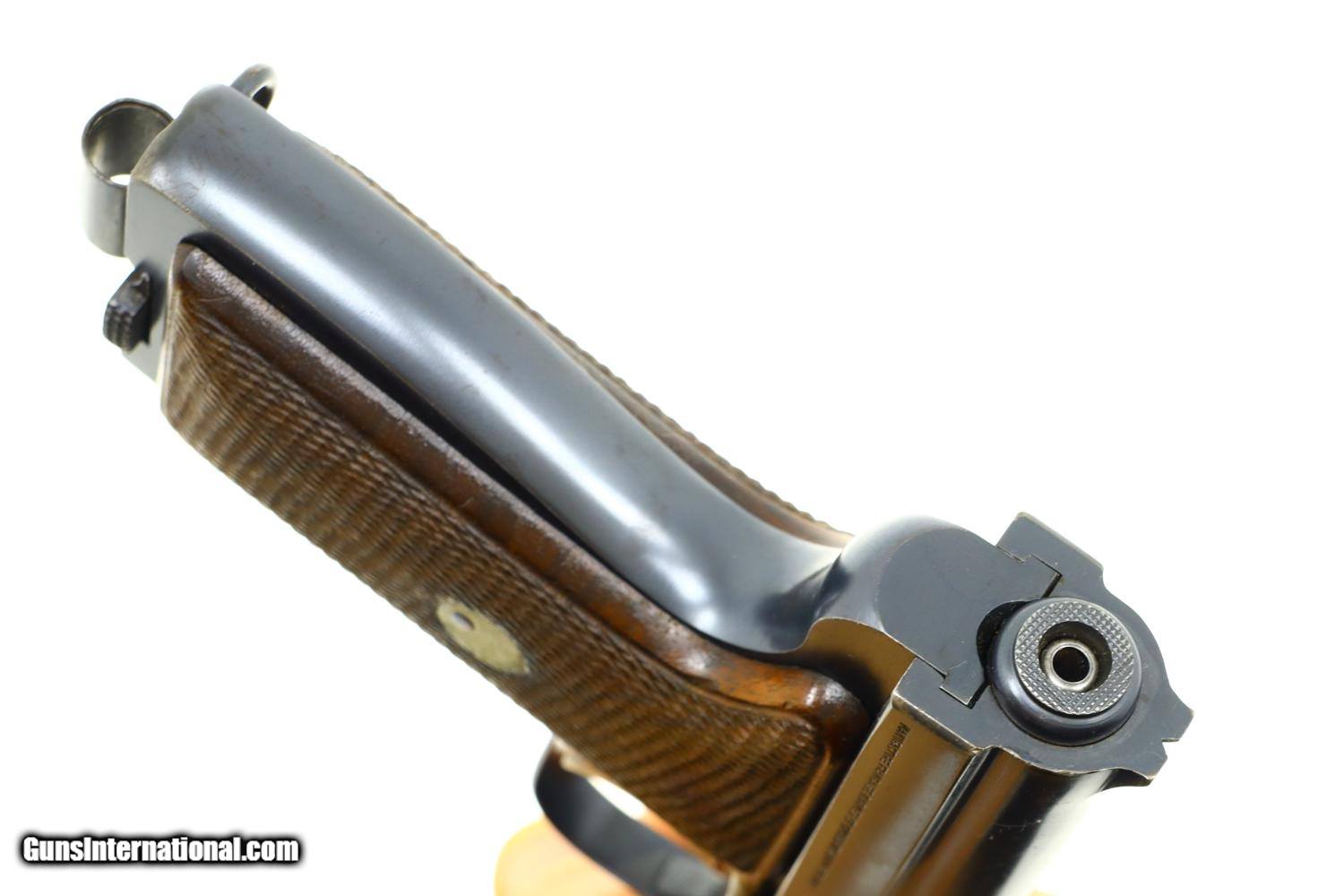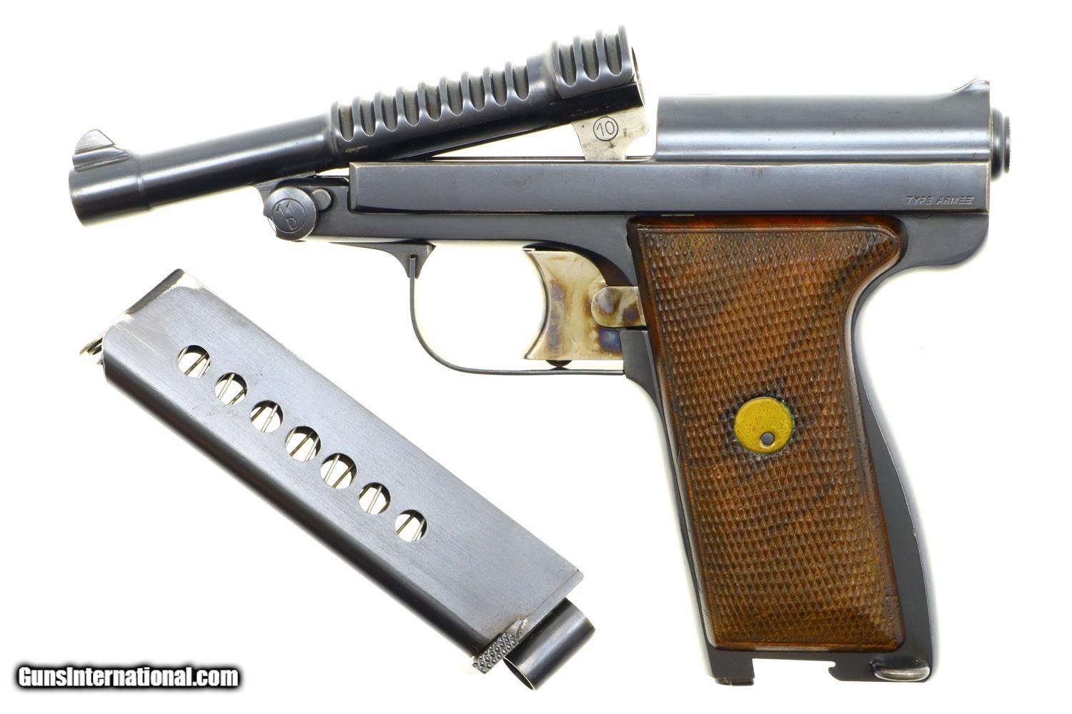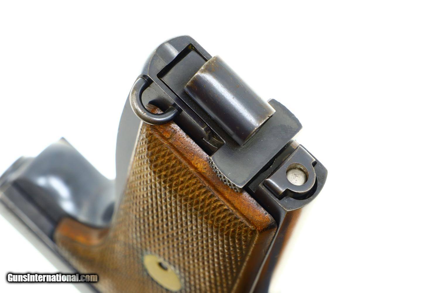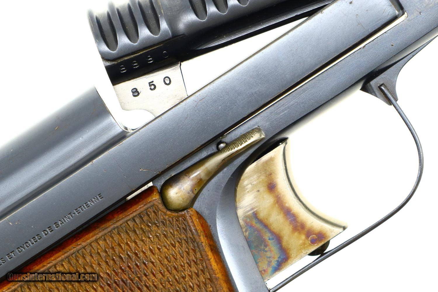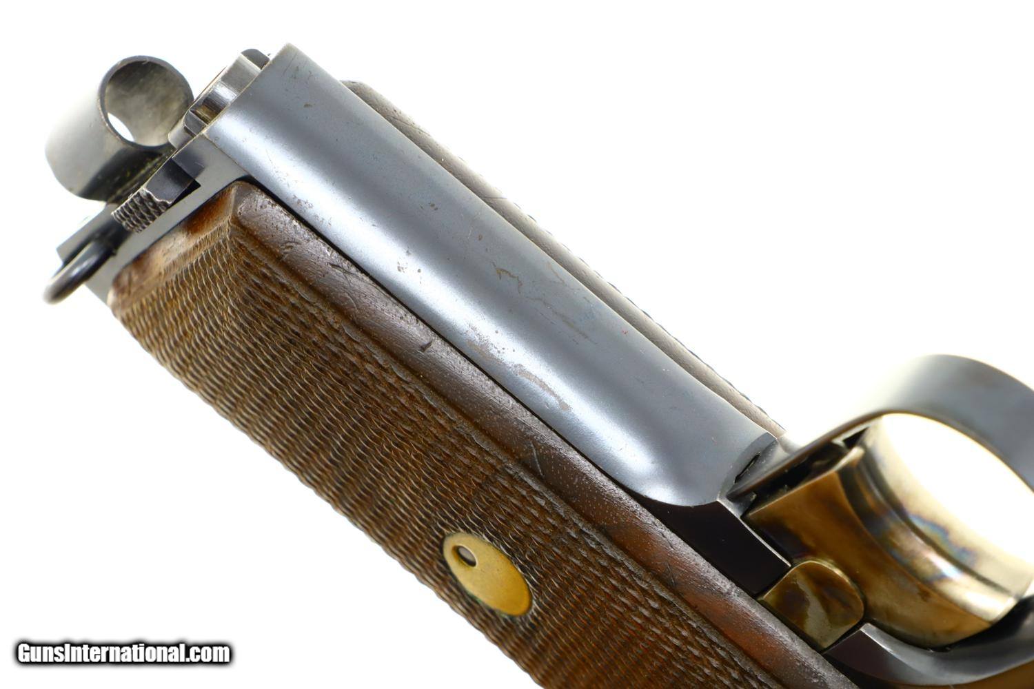 Description: Standard configuration Type Armee, Model 1928, with 5” finned barrel having fixed front and rear sight. Unique flip barrel. Double action only mechanism with correct magazine, this example with the spare cartridge loop and numbered with an encircled “6467”. Top of slide marked “Le Francais” in a small oval. Model notation “Type Armee” on the left side of the slide; manufacturer “MANUFACTURE FRANCAISE D-ARMES ET CYCLES DE SAINT-ETIENNE” on the right side of the slide. Major parts rust blued with beautifully case hardened trigger and release lever. European walnut checkered panels whose inserted discs retain the internally securing parts. Magazine with release at base having seven indicator holes. Synopsis: Manufrance, Mod 28, Finned Barrel, Armee Pistol, 8880, A-1872 Condition: At least 98% bright original rust blue, with minimal sharp edge wear in usual locations. Comparable condition case hardening. Generally excellent but oil darkened grips. Comparable condition magazine with insertional wear as photographed. Near mirror bright bore. Perfect manual mechanics. One of the most impressive and scarce large caliber pistols to have been tested by the French military. ~~Insured shipping fee of $75; most packages shipped using FedEx 2nd Day.~~ SOLD Manufacturer: Manufrance Serial Number: 8880 Caliber Info: 9mmBL |