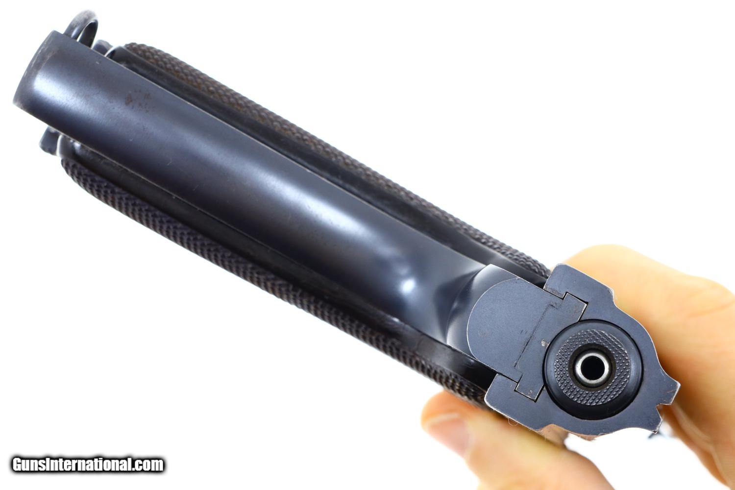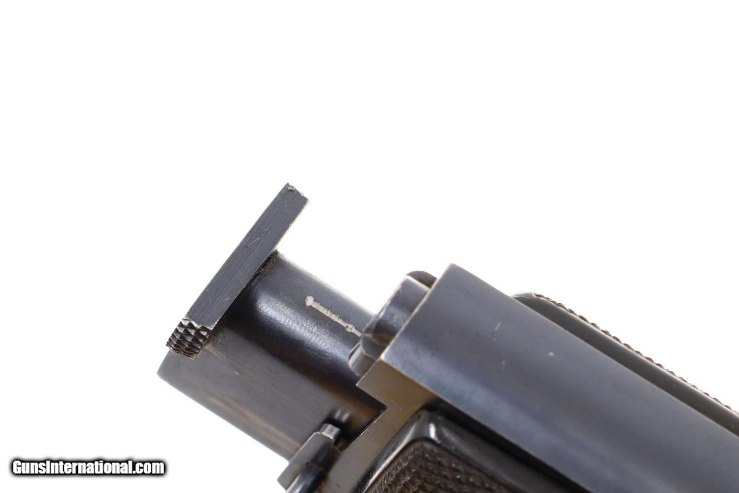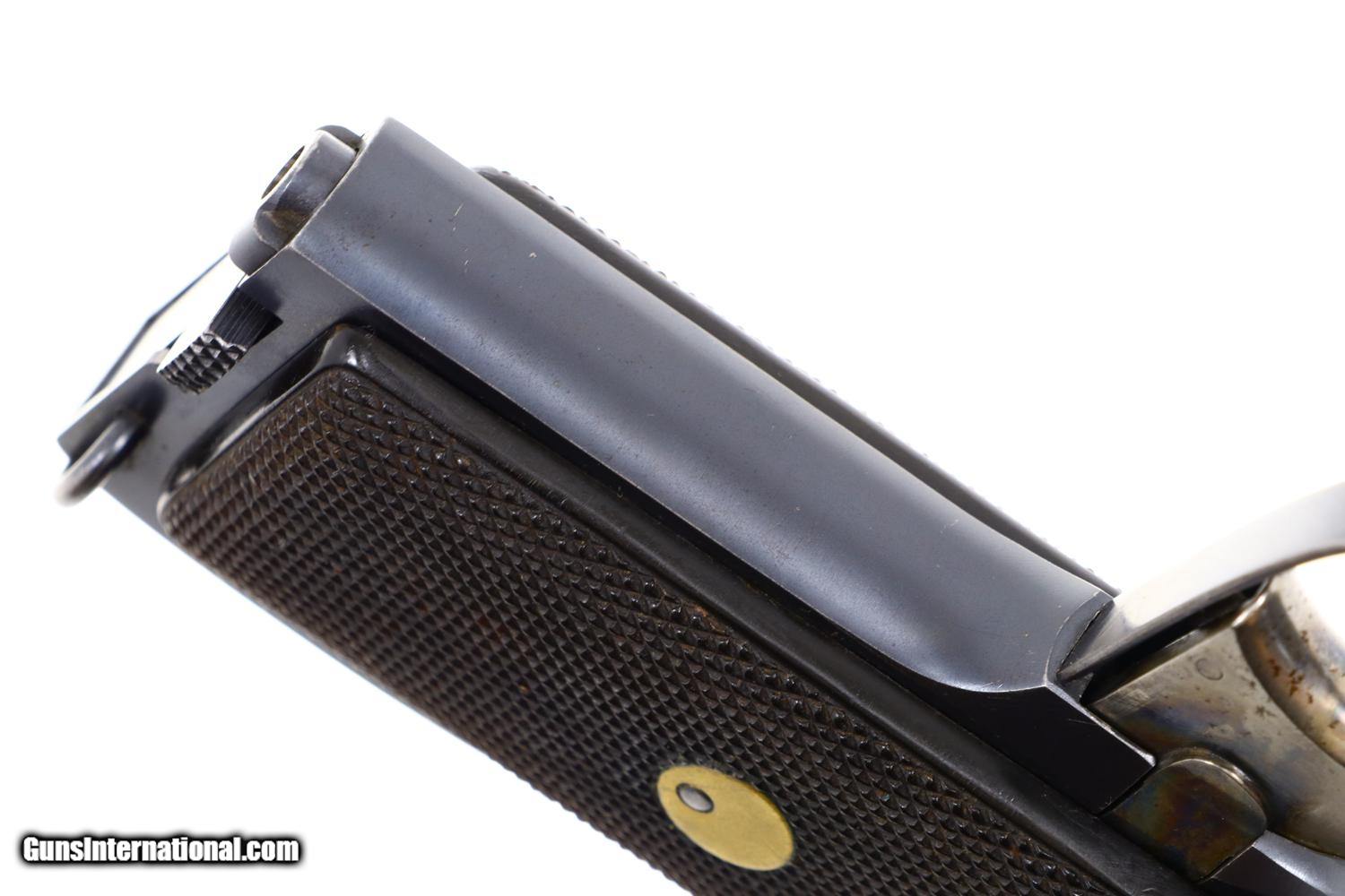 At least 97-98% bright original rust blue, with minimal sharp edge wear in usual locations. Comparable condition case hardening. Generally excellent but oil darkened grips. Comparable condition magazine with insertional wear as photographed. Mirror bright bore. Perfect manual mechanics. One of the most impressive and scarce large caliber pistols to have been tested by the French military.