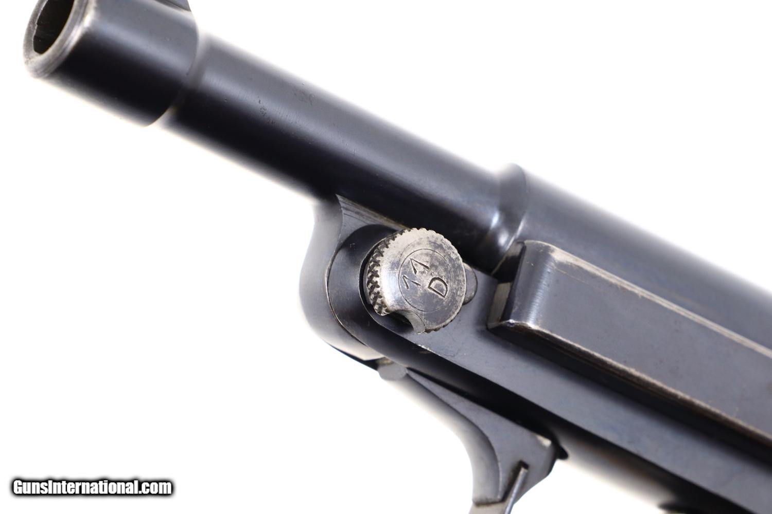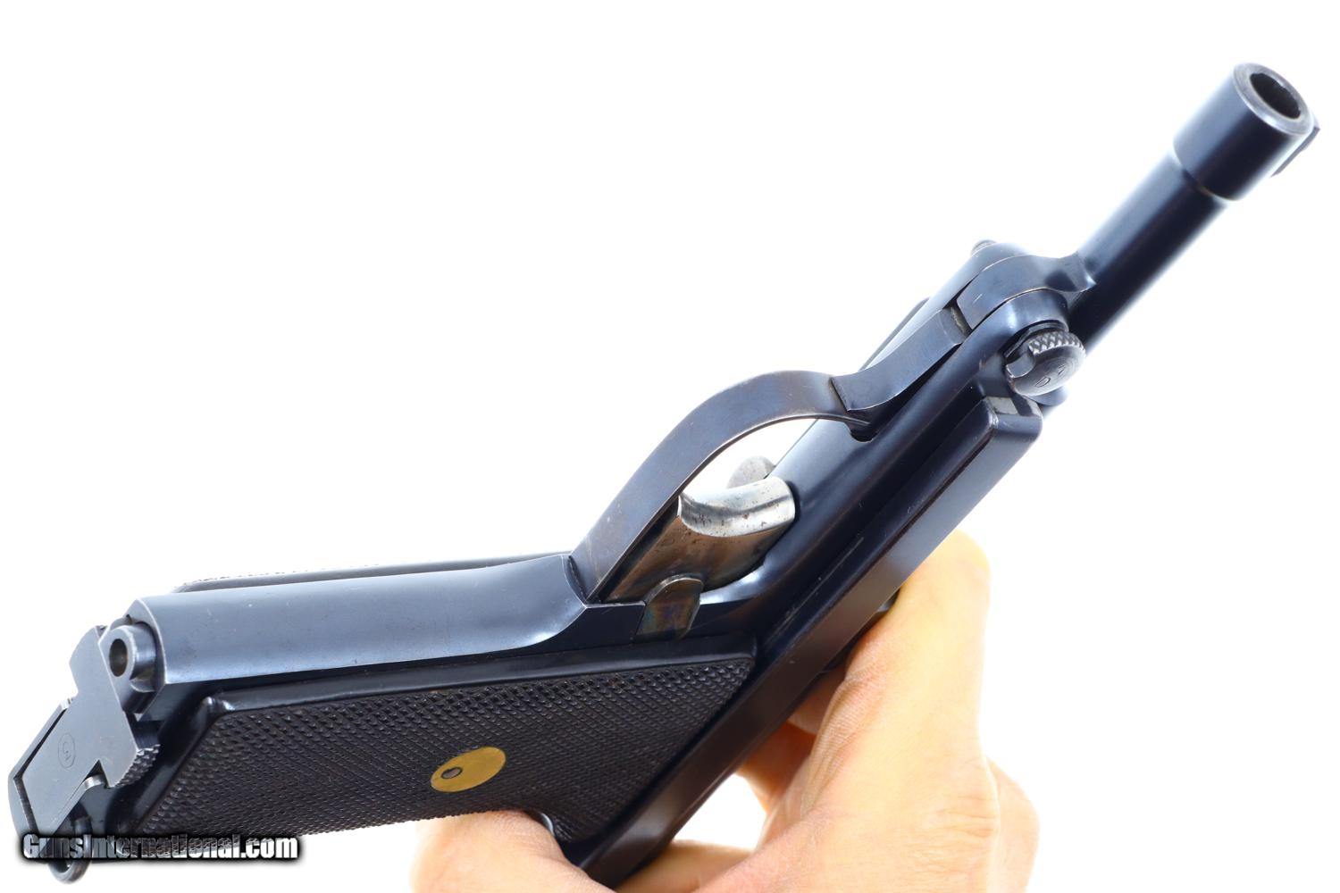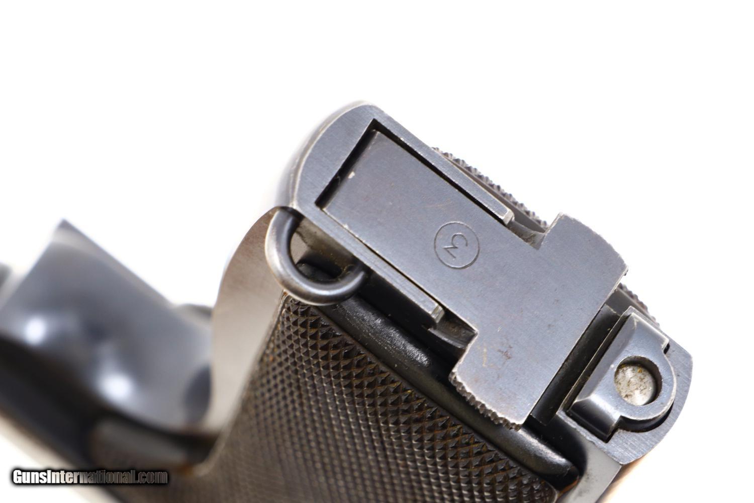 At least 97-98% bright original rust blue, with minimal sharp edge wear in usual locations. Comparable condition case hardening. Generally excellent but oil darkened grips. Comparable condition magazine with insertional wear as photographed. Mirror bright bore. Perfect manual mechanics. One of the most impressive and scarce large caliber pistols to have been tested by the French military.