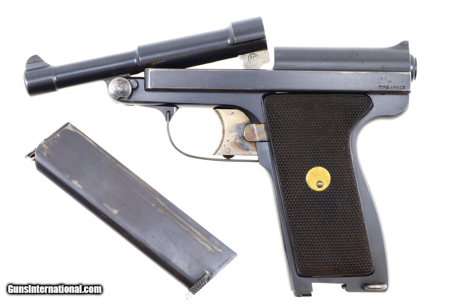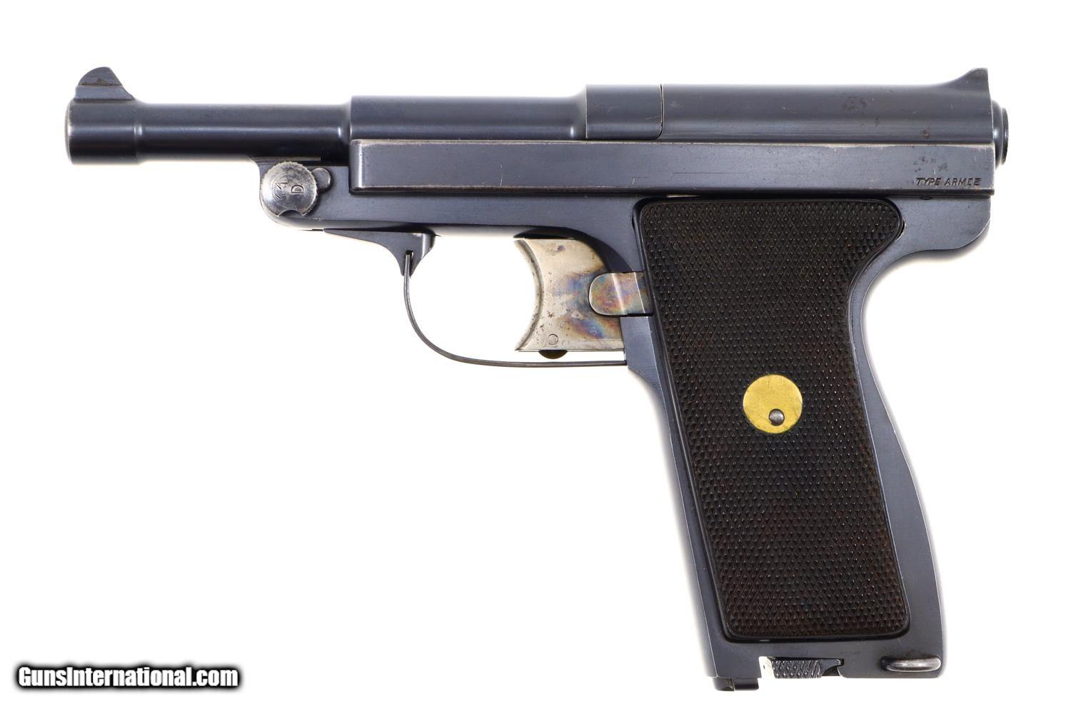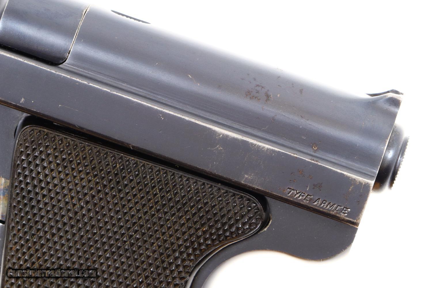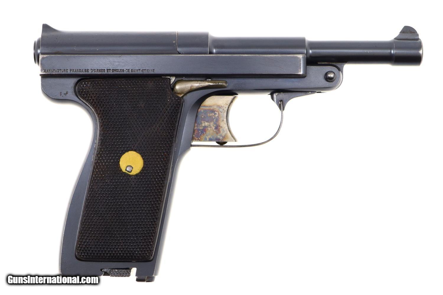 Standard configuration Type Armee, Model 1928, with 5” stepped barrel having fixed front and rear sight. Unique flip barrel. Double action only mechanism with correct magazine, this example without the spare cartridge loop and marked with an encircled “3” on the unnumbered base. Top of slide marked “Le Francais” in a small oval. Model notation “Type Armee” on the left side of the slide; manufacturer “MANUFACTURE FRANCAISE D-ARMES ET CYCLES DE SAINT-ETIENNE” on the right side of the slide. Major parts rust blued with beautifully case hardened trigger and release lever. European walnut checkered panels whose inserted discs retain the internally securing parts. Magazine with release at base having seven indicator holes.