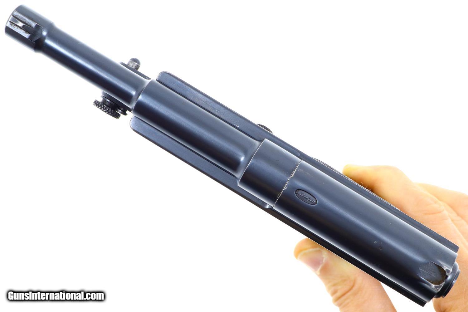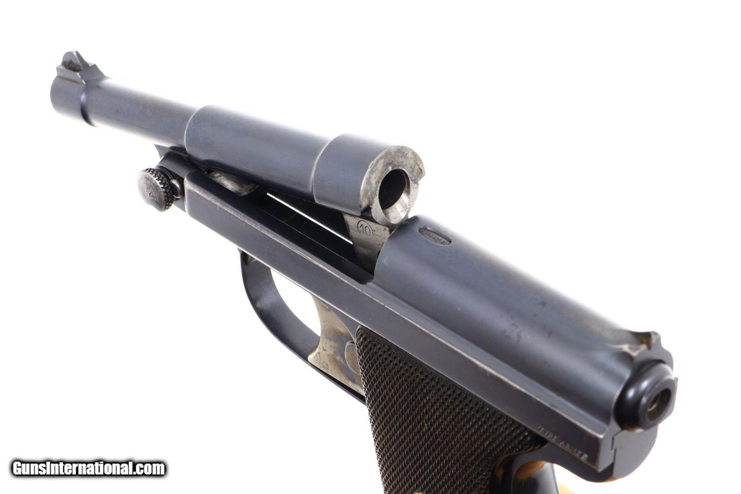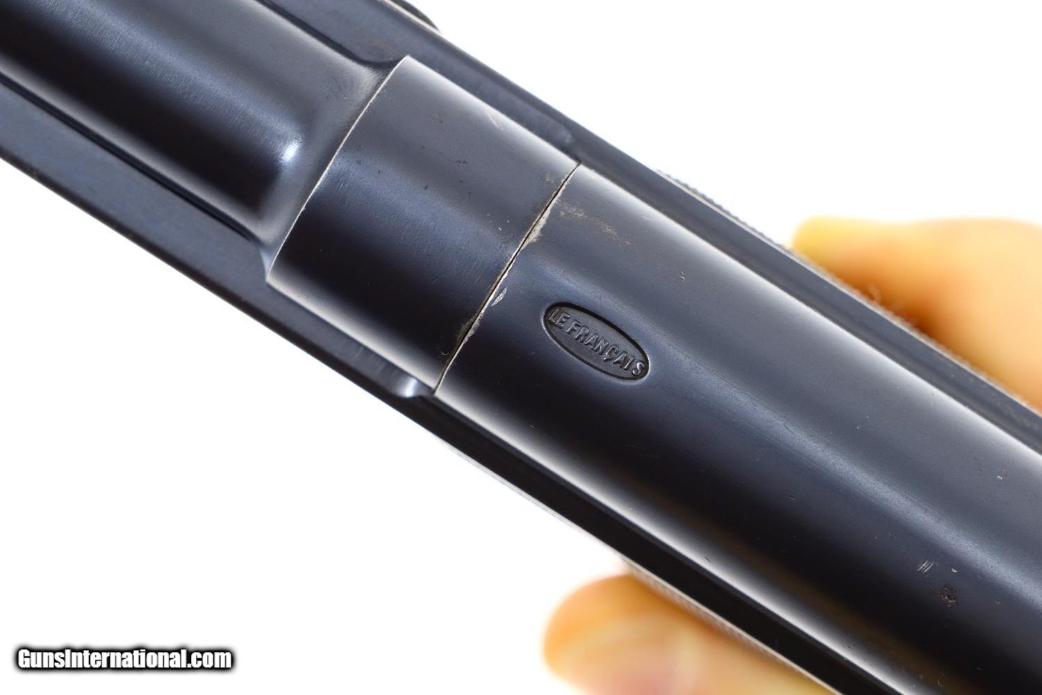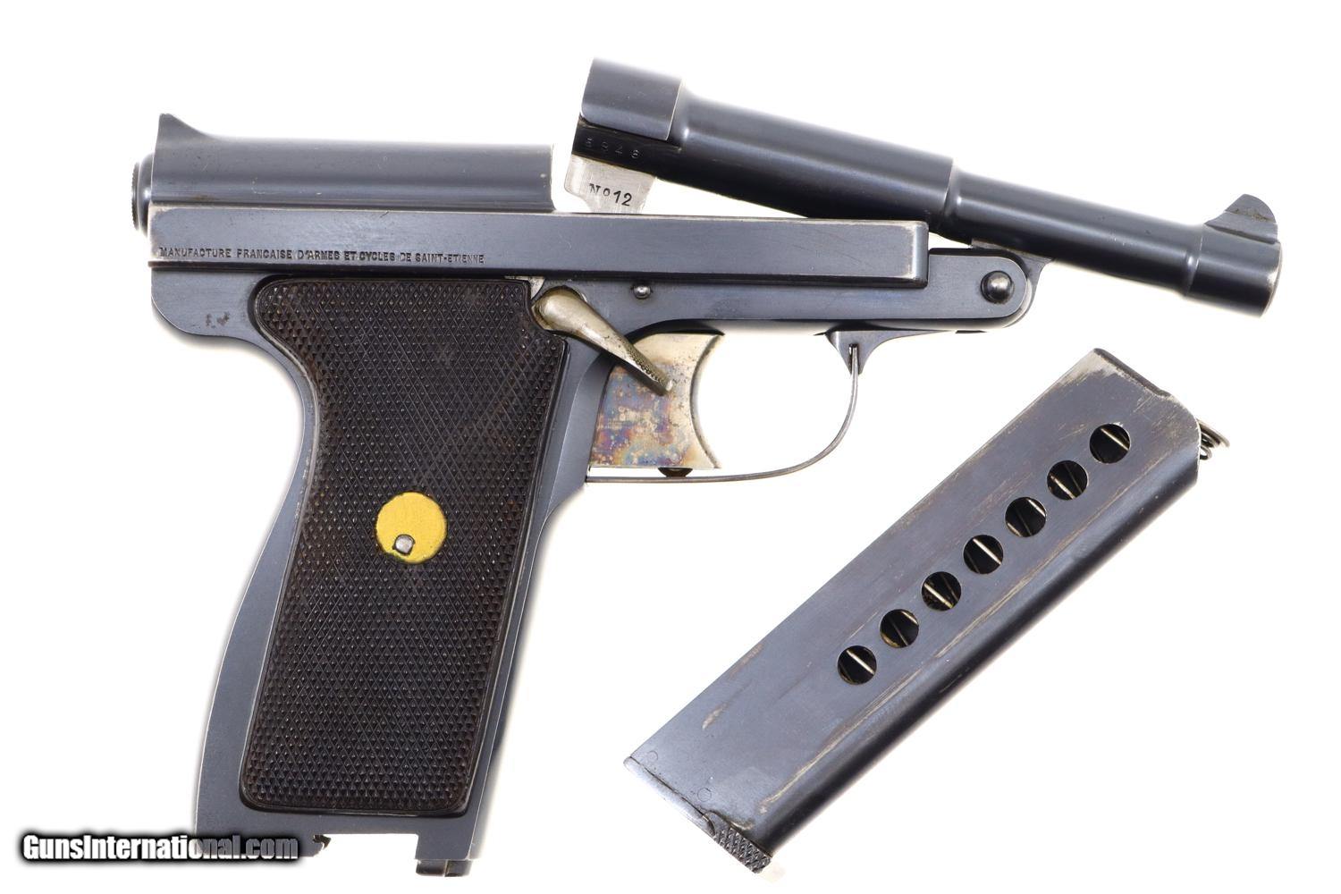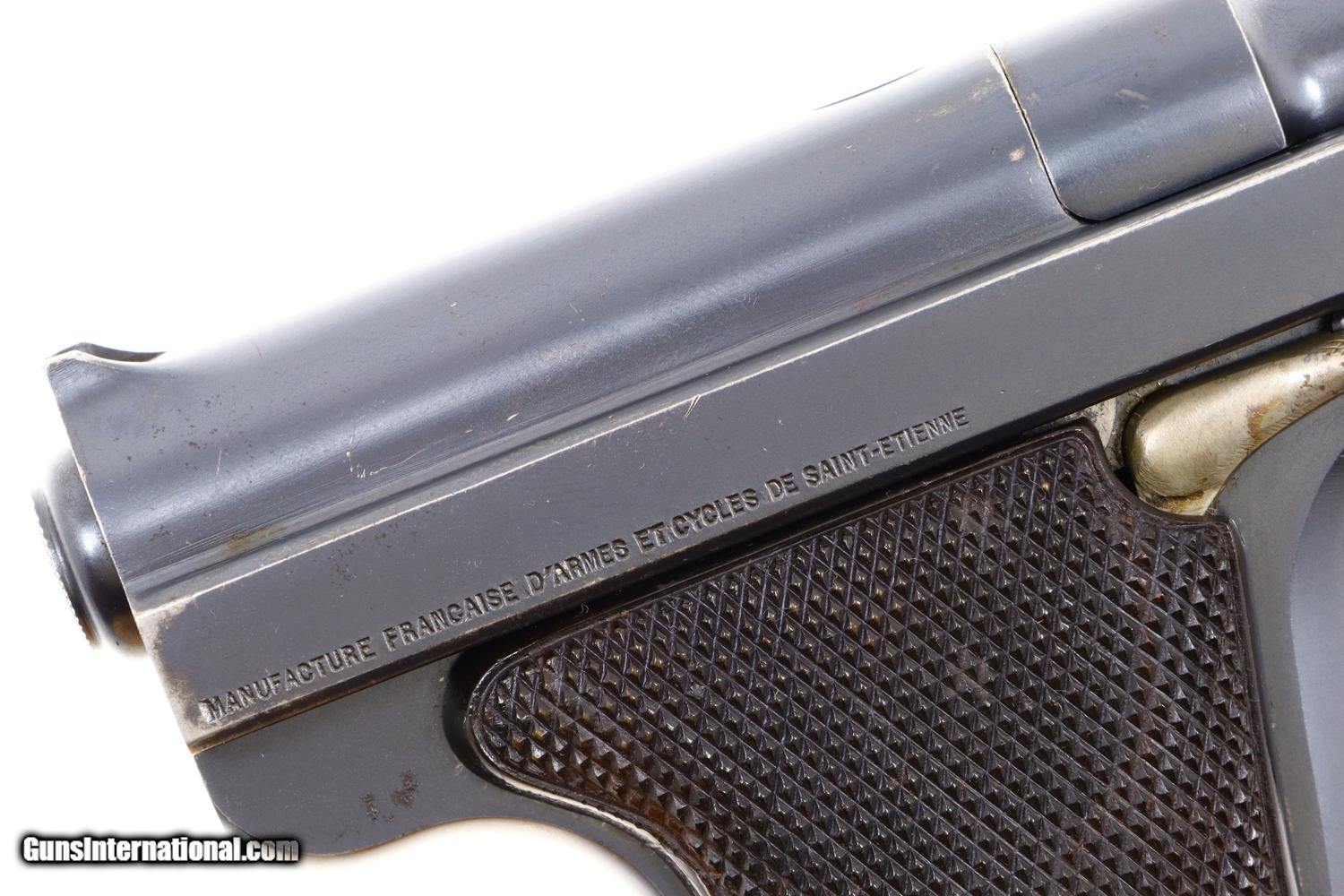 Standard configuration Type Armee, Model 1928, with 5” stepped barrel having fixed front and rear sight. Unique flip barrel. Double action only mechanism with correct magazine, this example without the spare cartridge loop and marked with an encircled “3” on the unnumbered base. Top of slide marked “Le Francais” in a small oval. Model notation “Type Armee” on the left side of the slide; manufacturer “MANUFACTURE FRANCAISE D-ARMES ET CYCLES DE SAINT-ETIENNE” on the right side of the slide. Major parts rust blued with beautifully case hardened trigger and release lever. European walnut checkered panels whose inserted discs retain the internally securing parts. Magazine with release at base having seven indicator holes.