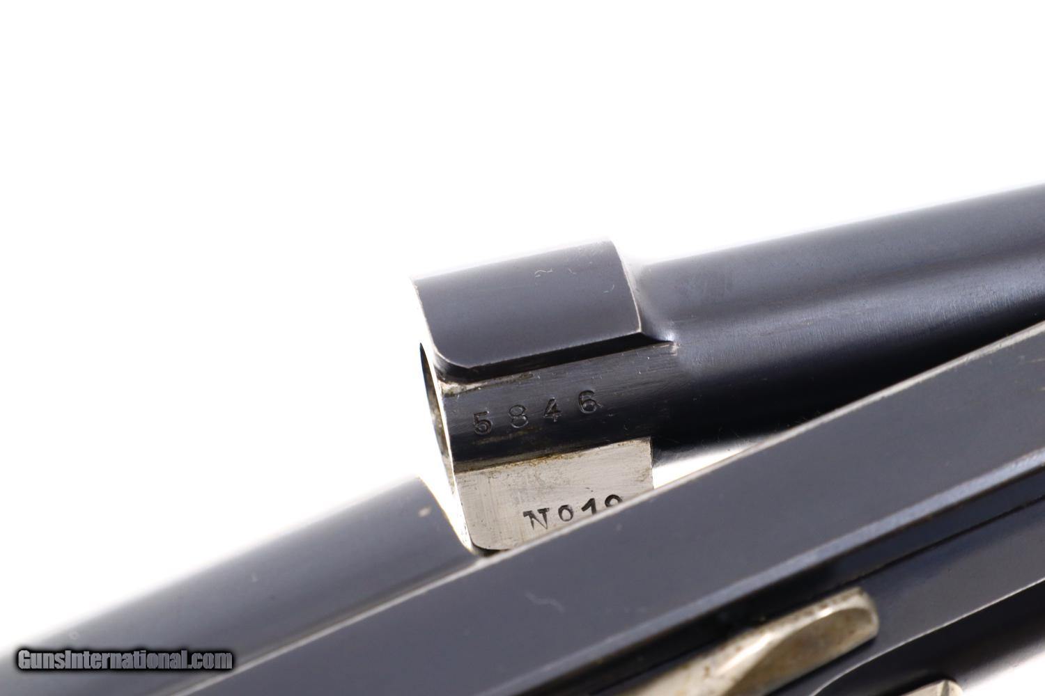 Description: Description: Standard configuration Type Armee, Model 1928, with 5” stepped barrel having fixed front and rear sight. Unique flip barrel. Double action only mechanism with correct magazine, this example without the spare cartridge loop and marked with an encircled “3” on the unnumbered base. Top of slide marked “Le Francais” in a small oval. Model notation “Type Armee” on the left side of the slide; manufacturer “MANUFACTURE FRANCAISE D-ARMES ET CYCLES DE SAINT-ETIENNE” on the right side of the slide. Major parts rust blued with beautifully case hardened trigger and release lever. European walnut checkered panels whose inserted discs retain the internally securing parts. Magazine with release at base having seven indicator holes. Synopsis: Scarce, massive and charismatic Le Francais 1928 Type Armee with stepped barrel and correct magazine. Condition: At least 97-98% bright original rust blue, with minimal sharp edge wear in usual locations. Comparable condition case hardening. Generally excellent but oil darkened grips. Comparable condition magazine with insertional wear as photographed. Mirror bright bore. Perfect manual mechanics. One of the most impressive and scarce large caliber pistols to have been tested by the French military. SOLD Manufacturer: Manufrance Serial Number: 5846 Caliber Info: 9mmBL |