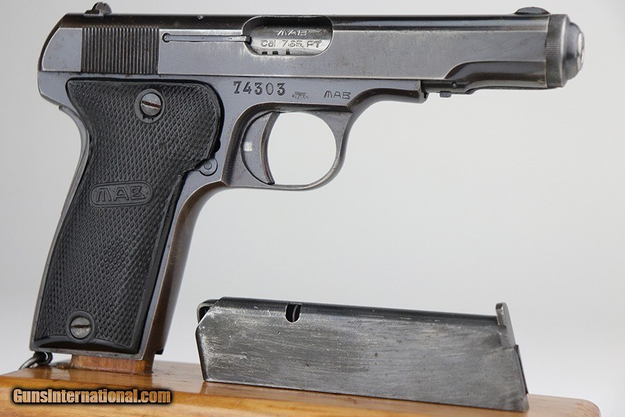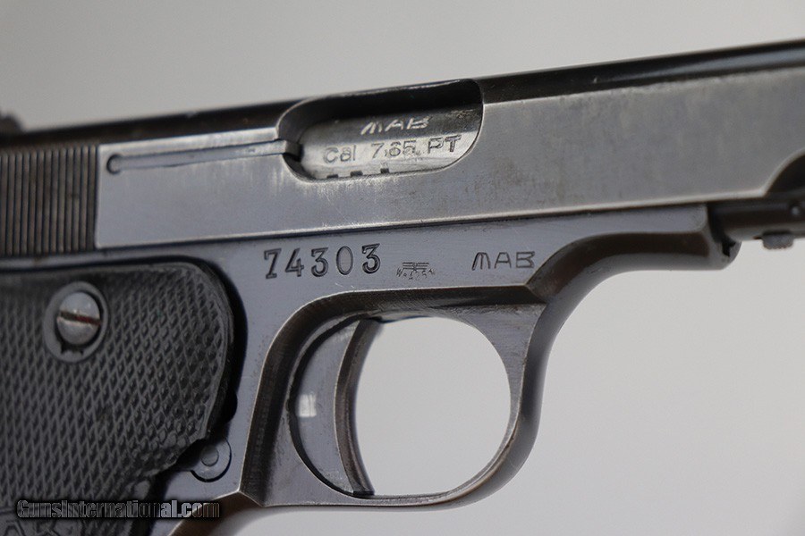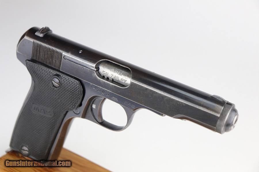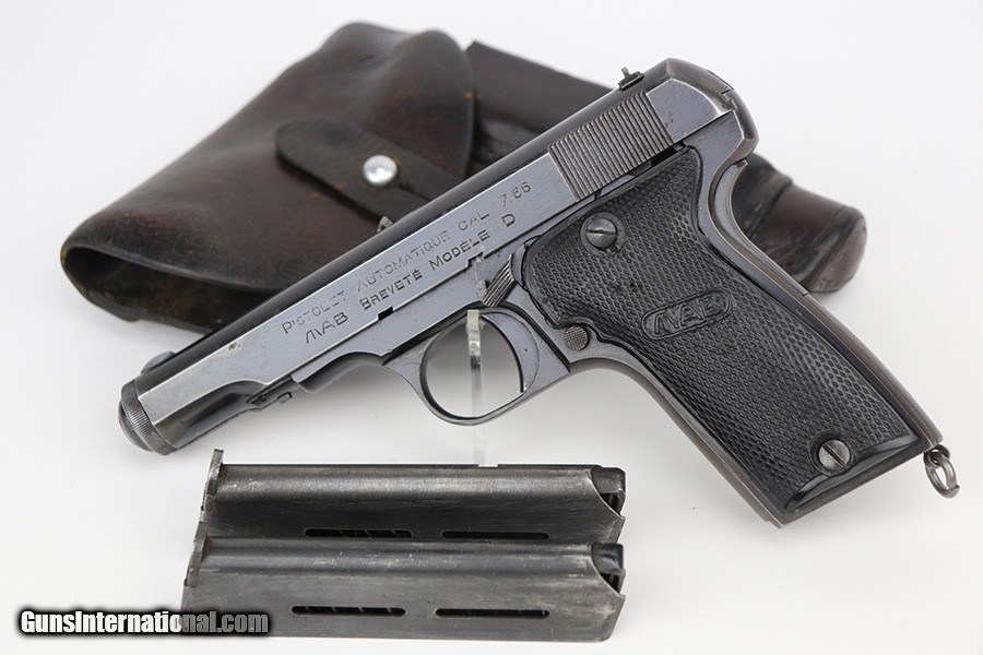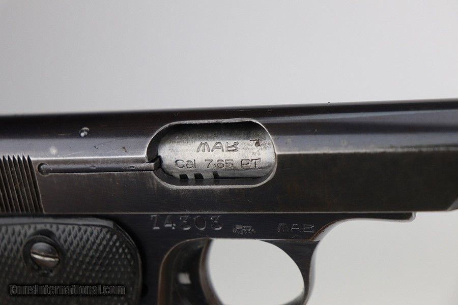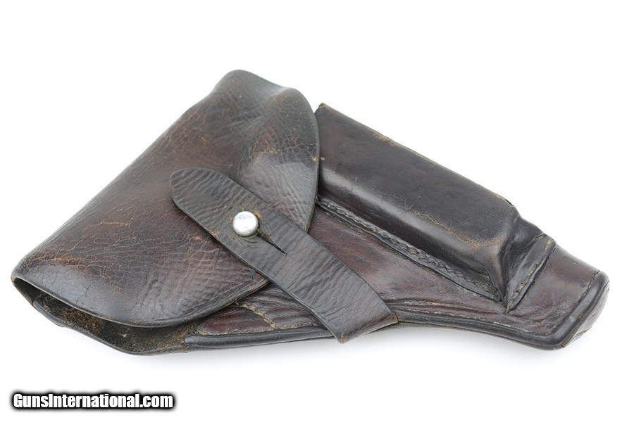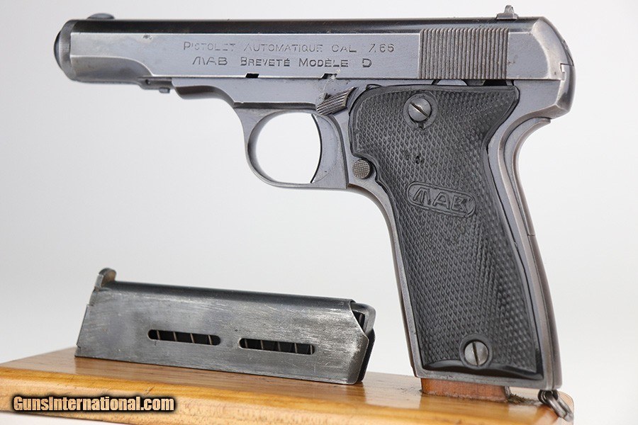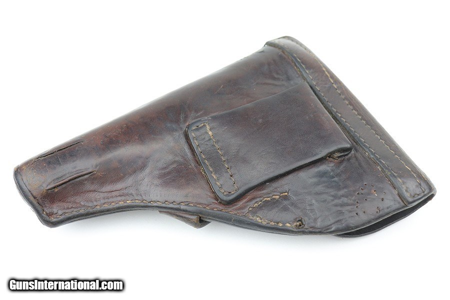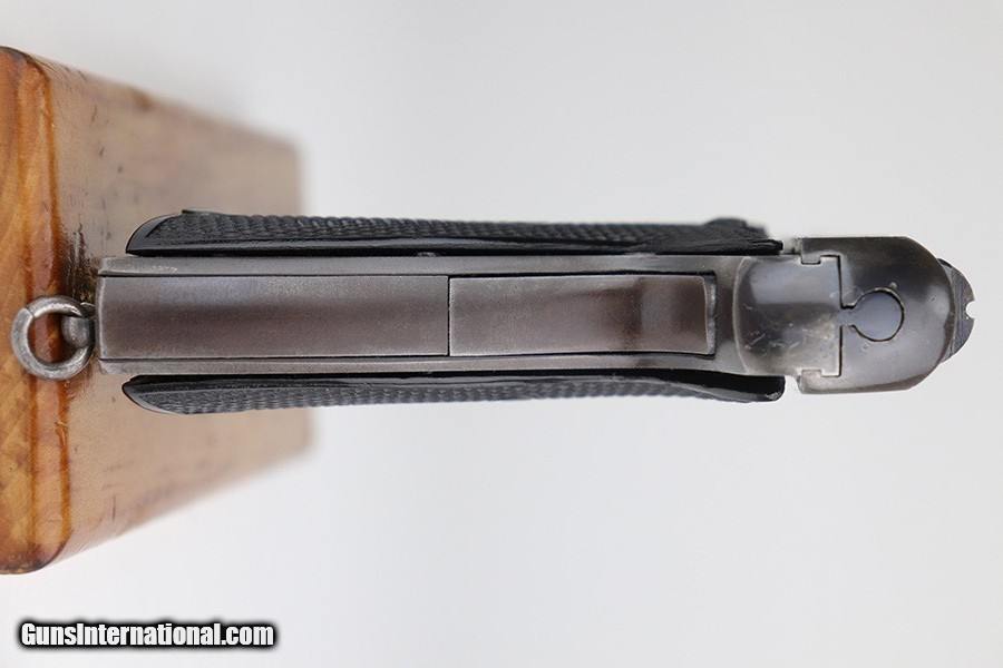 Description: This is a very nice example of a French Model D issued to the Nazi military during WW2. It is all matching, has the proper military test proof in the ejection port, and has the proper "Waffen 251" Nazi military acceptance proof on the right side of the frame. It comes as a rig with two period-correct magazines and a slightly worn period-correct brown leather holster (un-marked). The gun has retained about 85% of its finish. There is minor wear along the high edges, some discoloration around the muzzle, and spotty wear along the length of the right side of the slide. Some light brown patina on both grip straps. The original lanyard ring is intact. The grips are slightly warped around the edges, there is a small hole in the left grip, and there is a small chip in one of the corners on the right grip. The bore is mint. SOLD Curio/Relic: Yes Handgun Caliber: .32 ACP (7.65x17mm Browning SR) Bore: Mint Condition: ~85% |