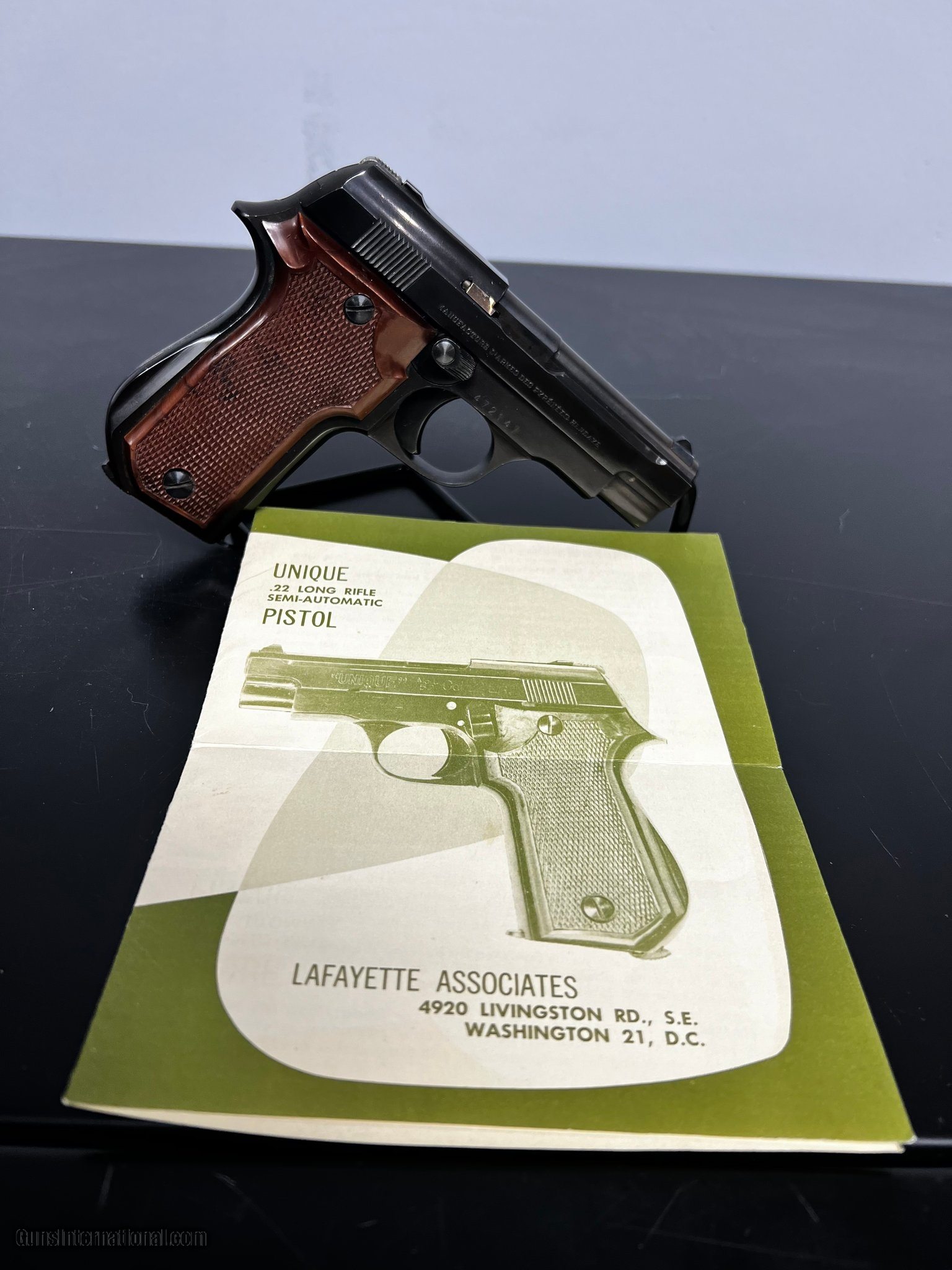 Description: Guns Listing ID: 1387207 UNIQUE MOD 52 22LR 3\"BLUED SEMI AUTO PISTOL / 10 RD MAG WOOD GRIPS / FACTORY MANUAL AWESOME VINTAGE RIMFIRE PISTOL THANKS FOR LOOKING SOLD Manufacturer: UNIQUE ARMES FRANCE Model: MOD 52 Caliber Info: .22 LR Condition: Used - Non-Certified Barrels: 3 BARREL Finish: BLUED |