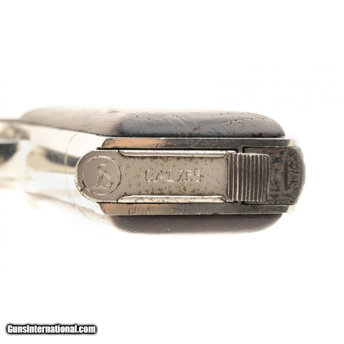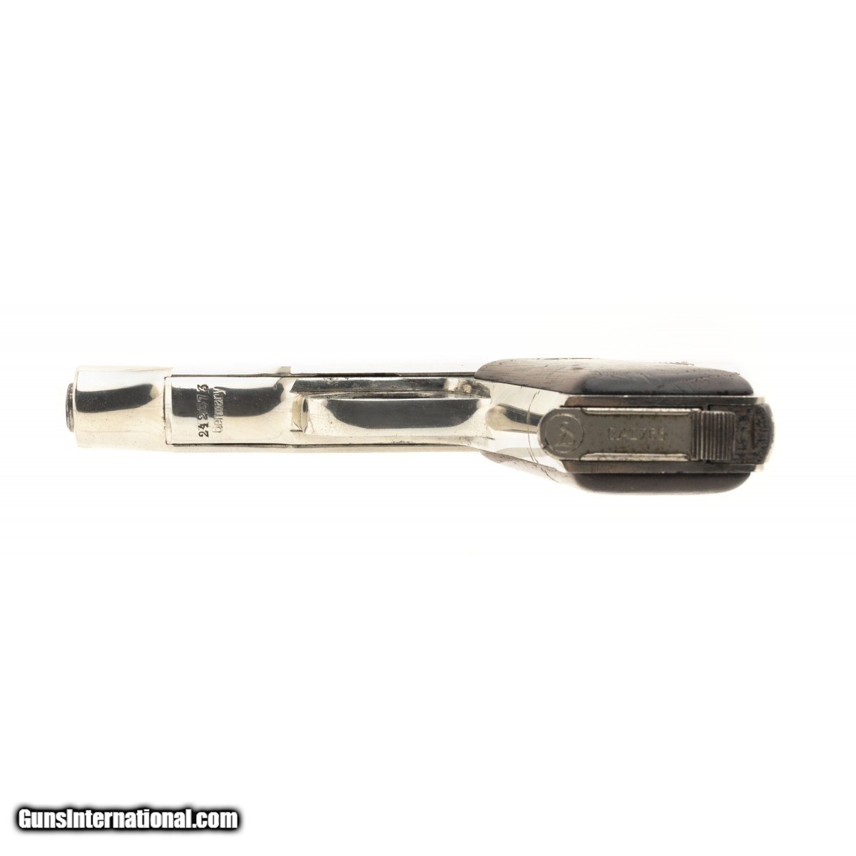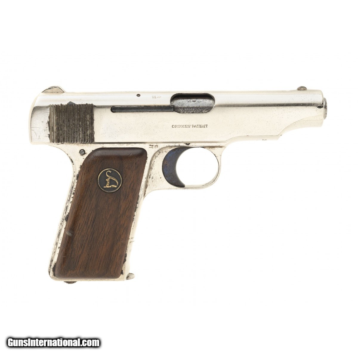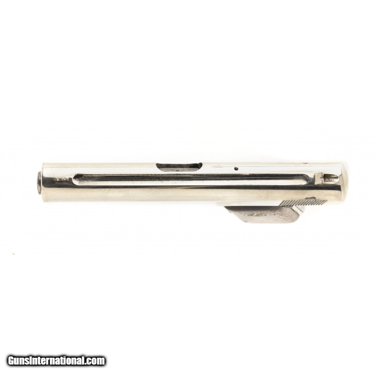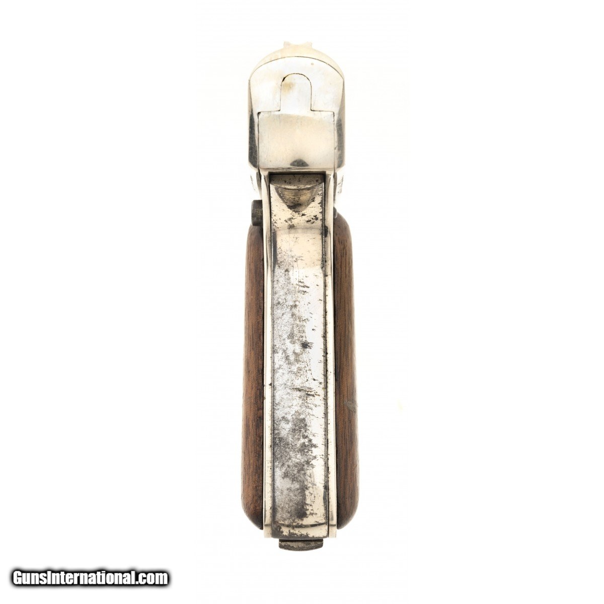 Description: " Pre-war German made auto made for export to the USA. Bore is very good with strong rifling. Metal has approximately 92% original nickel plate. Grips are good with some carry wear. Hard to find a factory nickel Ortgies. SOLD Curio/Relic: Yes |