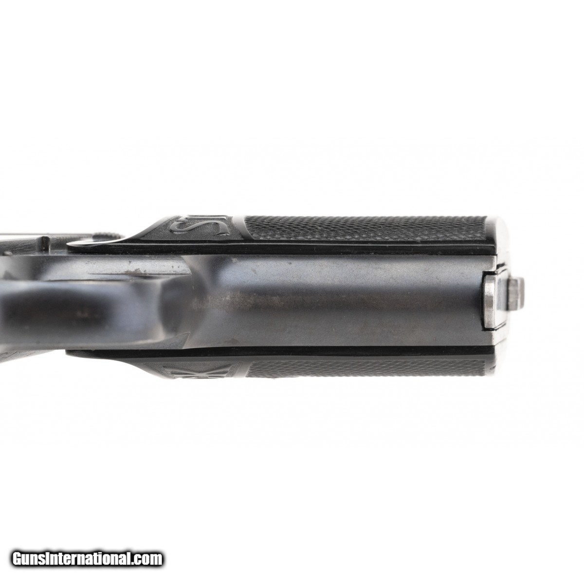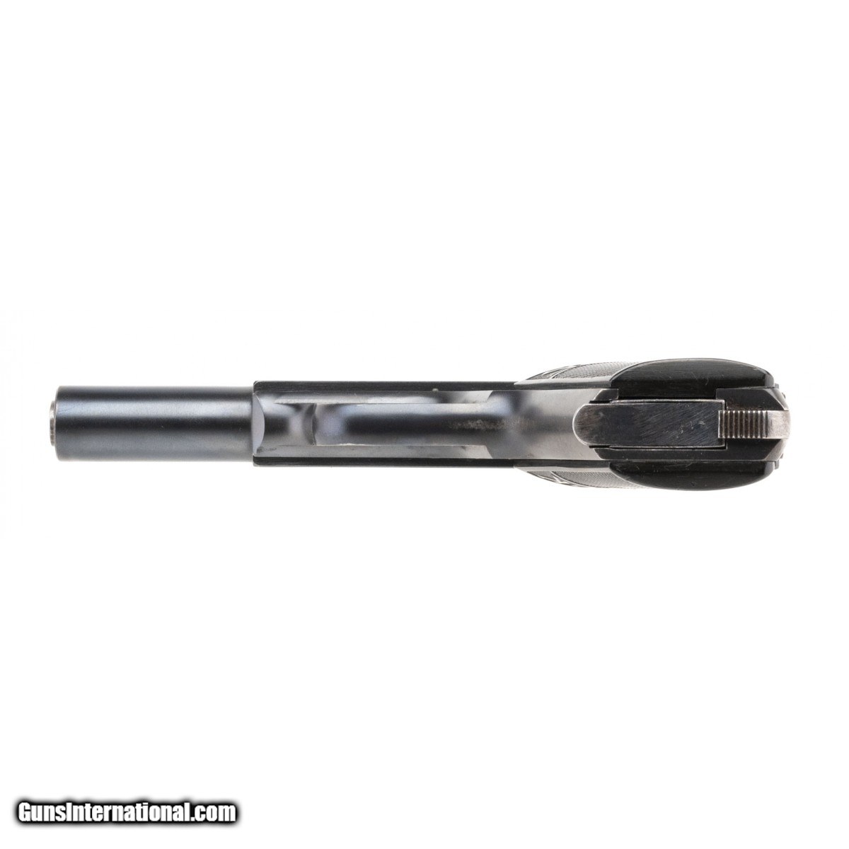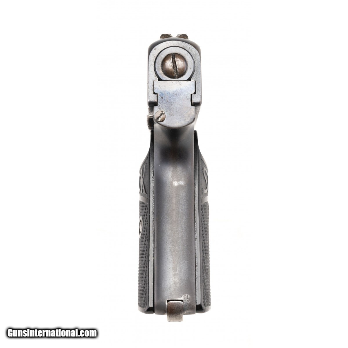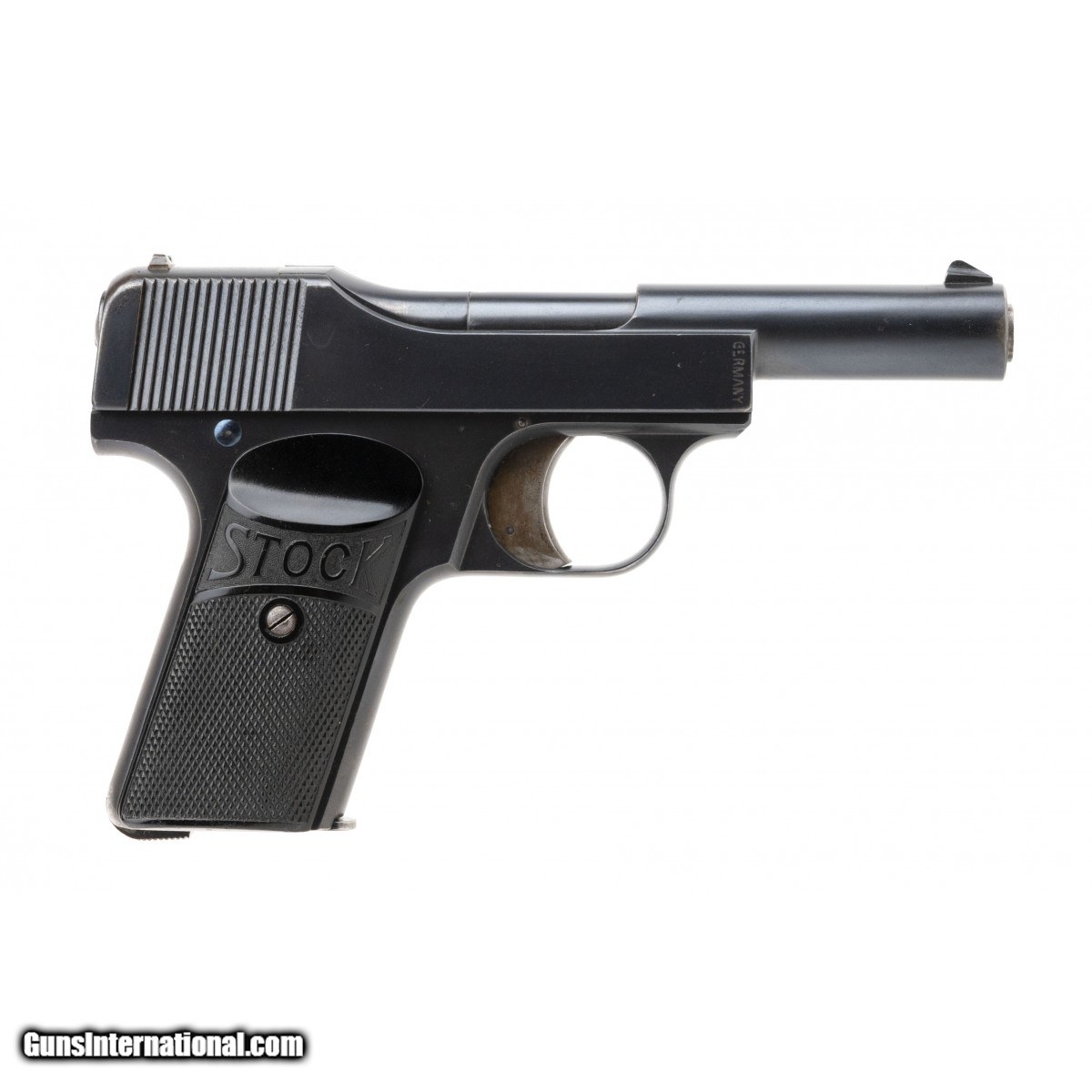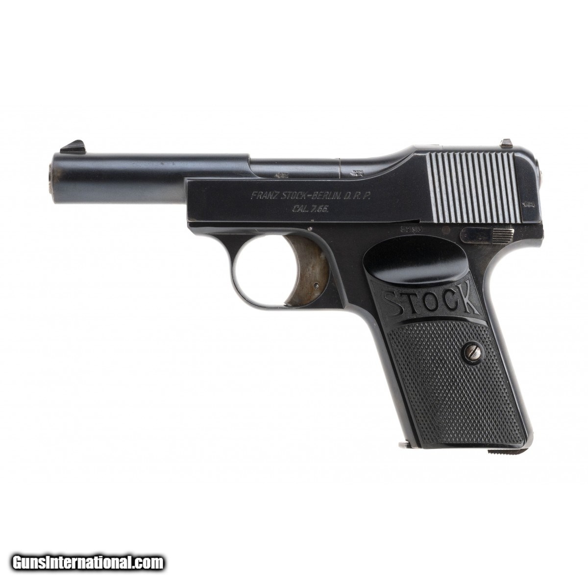 Description: " Franz Stock manufactured 7.65mm pistols from 1920 to 1940. This type 1 (square slide front), variation 1 (4"" barrel) pistol is circa early 1920s. The 4"" barrel has an excellent bore with bright, strong rifling. The pistol has approx. 98% blue. The left side of the slide is maked FRANZ STOCK - BERLIN D.R.P. over CAL. 7.65. The right forward side of the slide is marked GERMANY indicating that this pistol was intended for the export market. The breechbolt and rear of the slide have the German crown over N commercial proof marks. The checkered hard rubber grips, with STOCK at the top, are excellent with no cracks or chips. It is equipped with the correct magazine. The action functions correctly. This excellent Stock 7.65 pistol is reary for any pre-WWII semi-auto pistol collection. SOLD Curio/Relic: Yes |