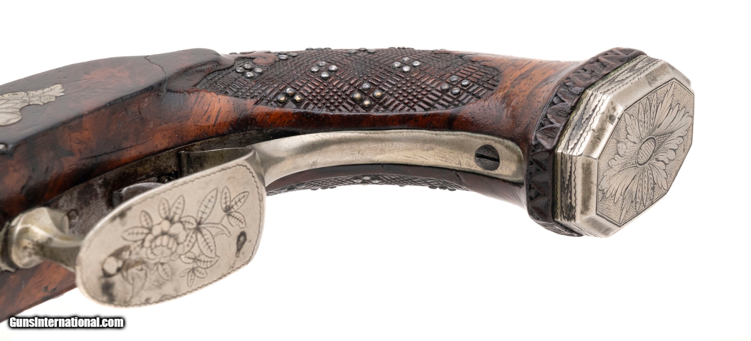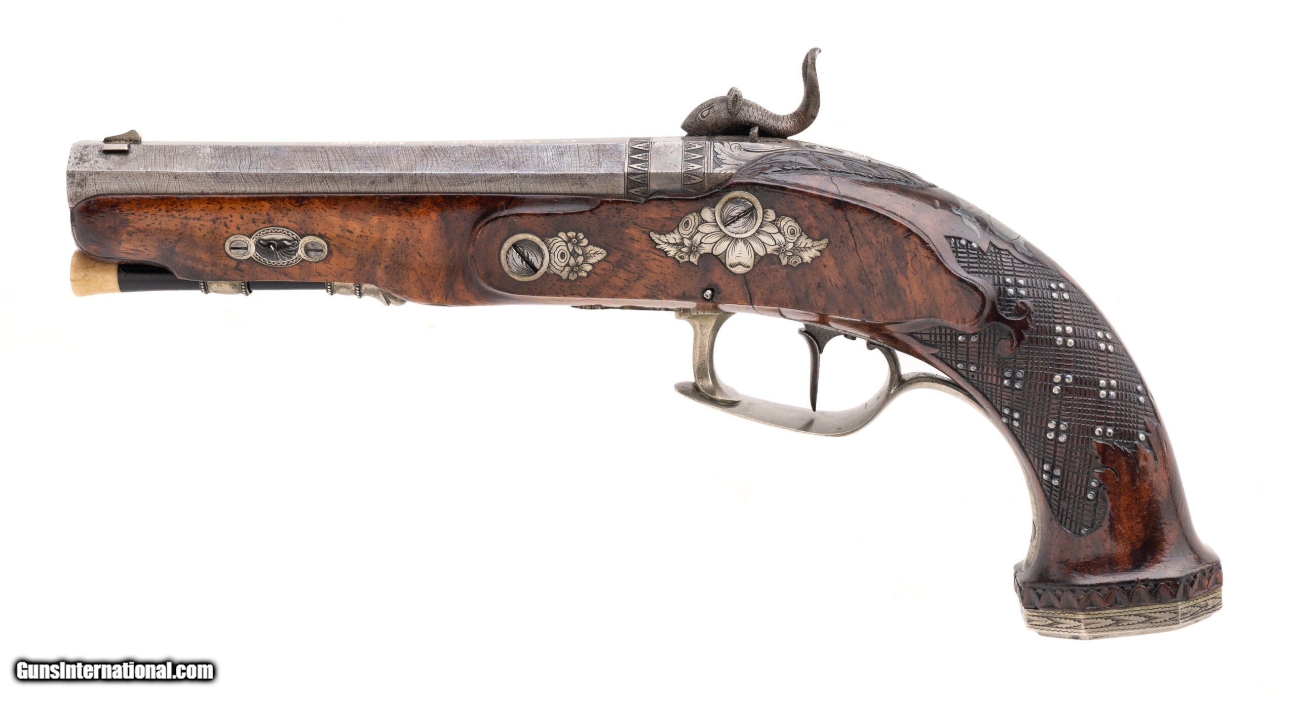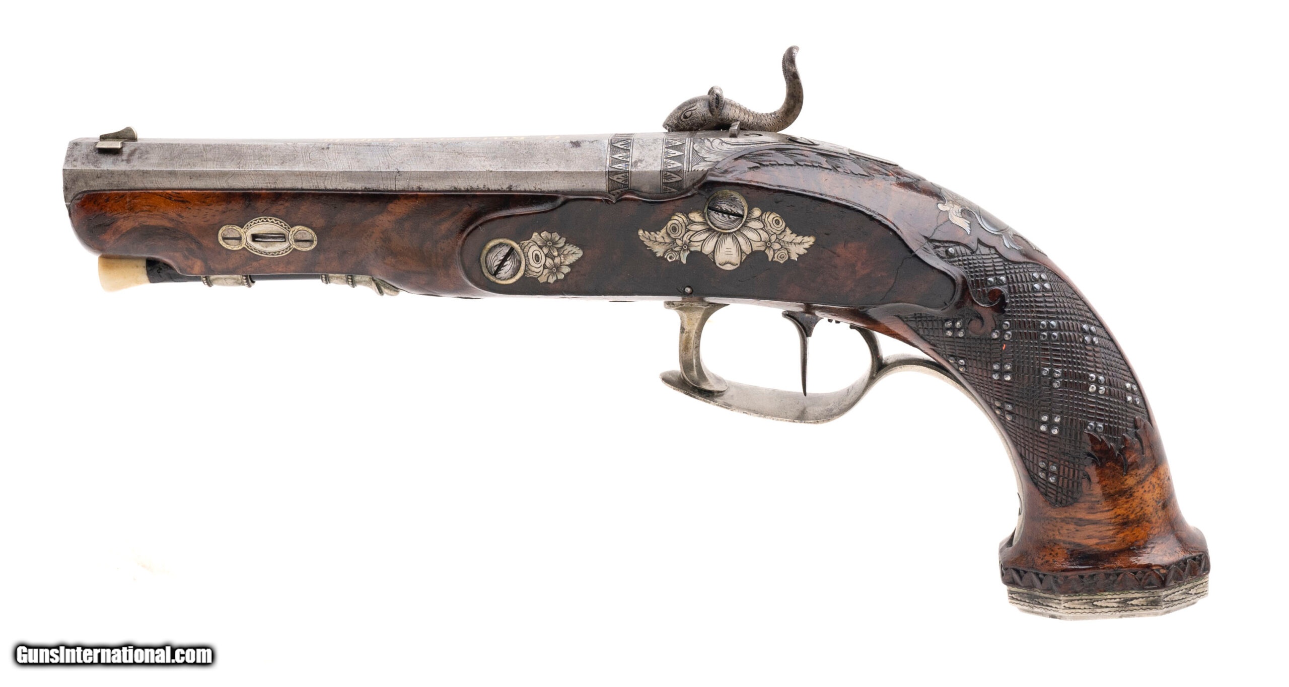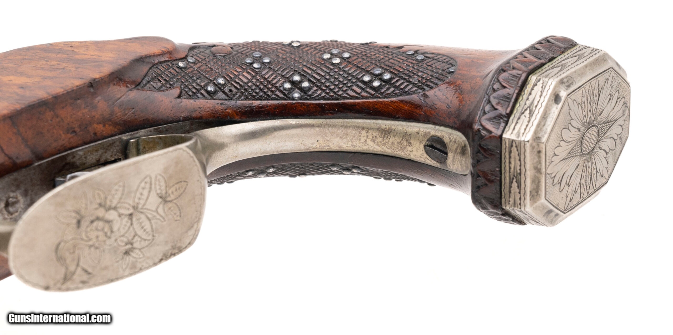 Description: "NSN. Made circa 1800. 47 caliber with 5" barrels. This is a very fine pair of German pistols. The condition is very good. Ther barrels have been cleaned, but are still sharp. The top of the barrel is marked “G. Kreisser a Leipzig" in Gold Lettering. The lock is also marked Kriesser and nicely engraved. The hammers are sculpted to resemble a squirrel. The stocks are made of beautiful deluxe burl wood. One of the guns has a small crack inn the wood from the trigger to the lock. The grips are checkered and decorated with silver studs. All of the mounts and butt caps are nicely engraved and made out of German silver. These guns have multiple deluxe features such as the set triggers and ivory ram rod tips on the ebony ram rods. SOLD Antique: Yes |