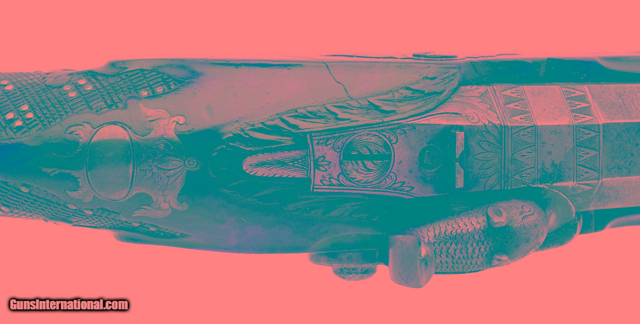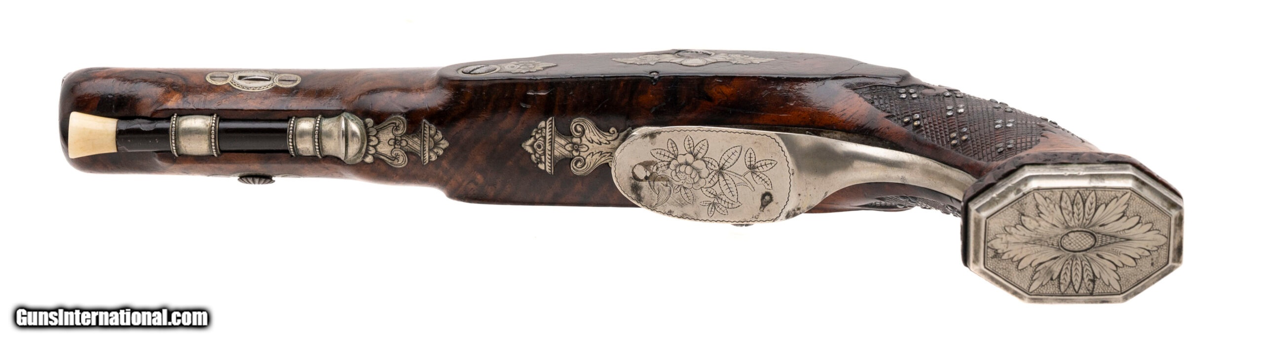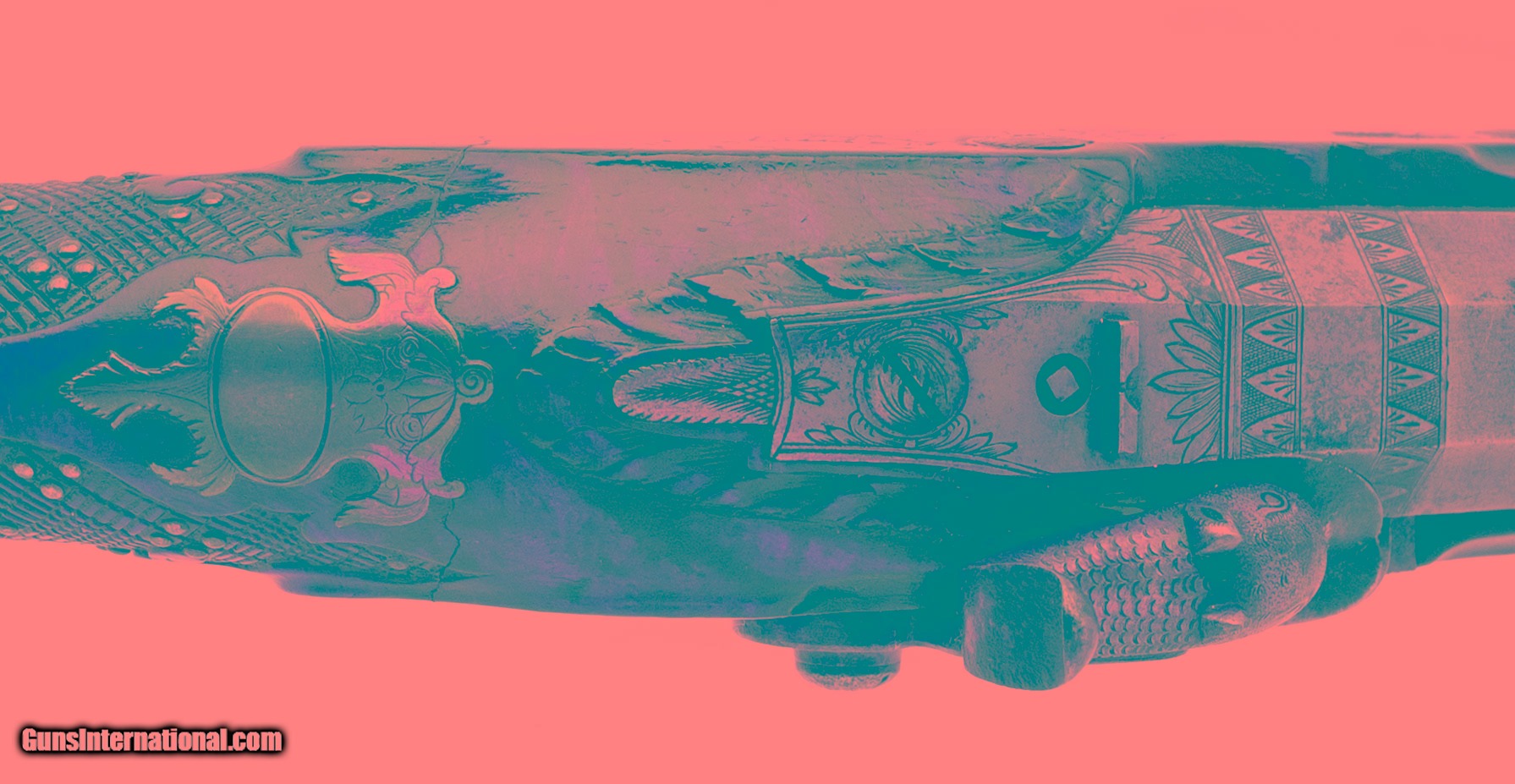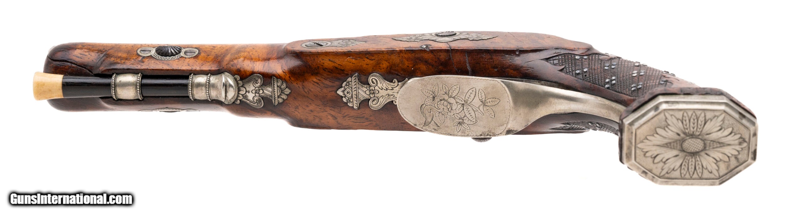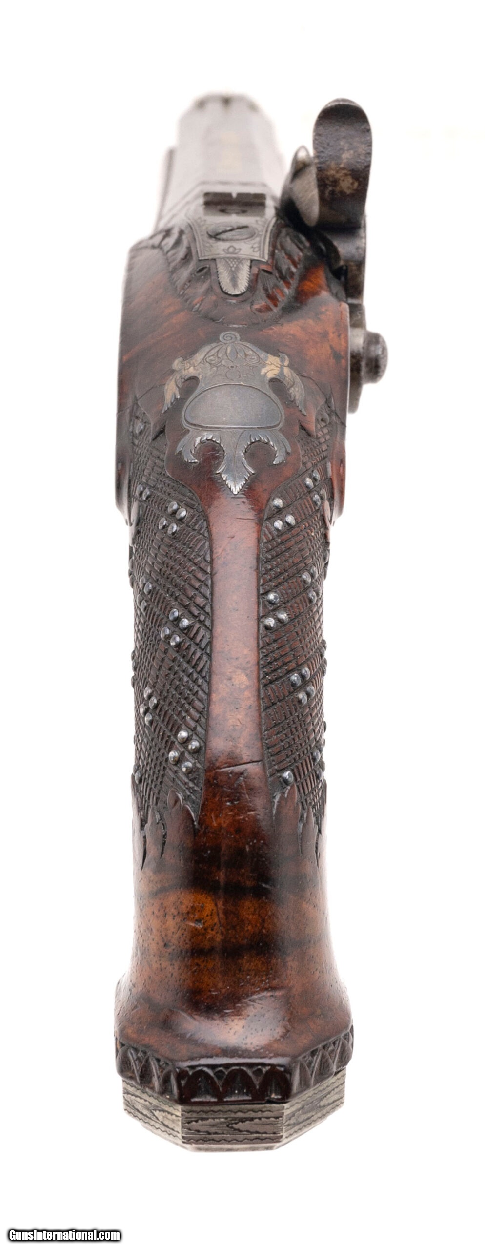 Description: "NSN. Made circa 1800. 47 caliber with 5" barrels. This is a very fine pair of German pistols. The condition is very good. Ther barrels have been cleaned, but are still sharp. The top of the barrel is marked “G. Kreisser a Leipzig" in Gold Lettering. The lock is also marked Kriesser and nicely engraved. The hammers are sculpted to resemble a squirrel. The stocks are made of beautiful deluxe burl wood. One of the guns has a small crack inn the wood from the trigger to the lock. The grips are checkered and decorated with silver studs. All of the mounts and butt caps are nicely engraved and made out of German silver. These guns have multiple deluxe features such as the set triggers and ivory ram rod tips on the ebony ram rods. SOLD Antique: Yes |