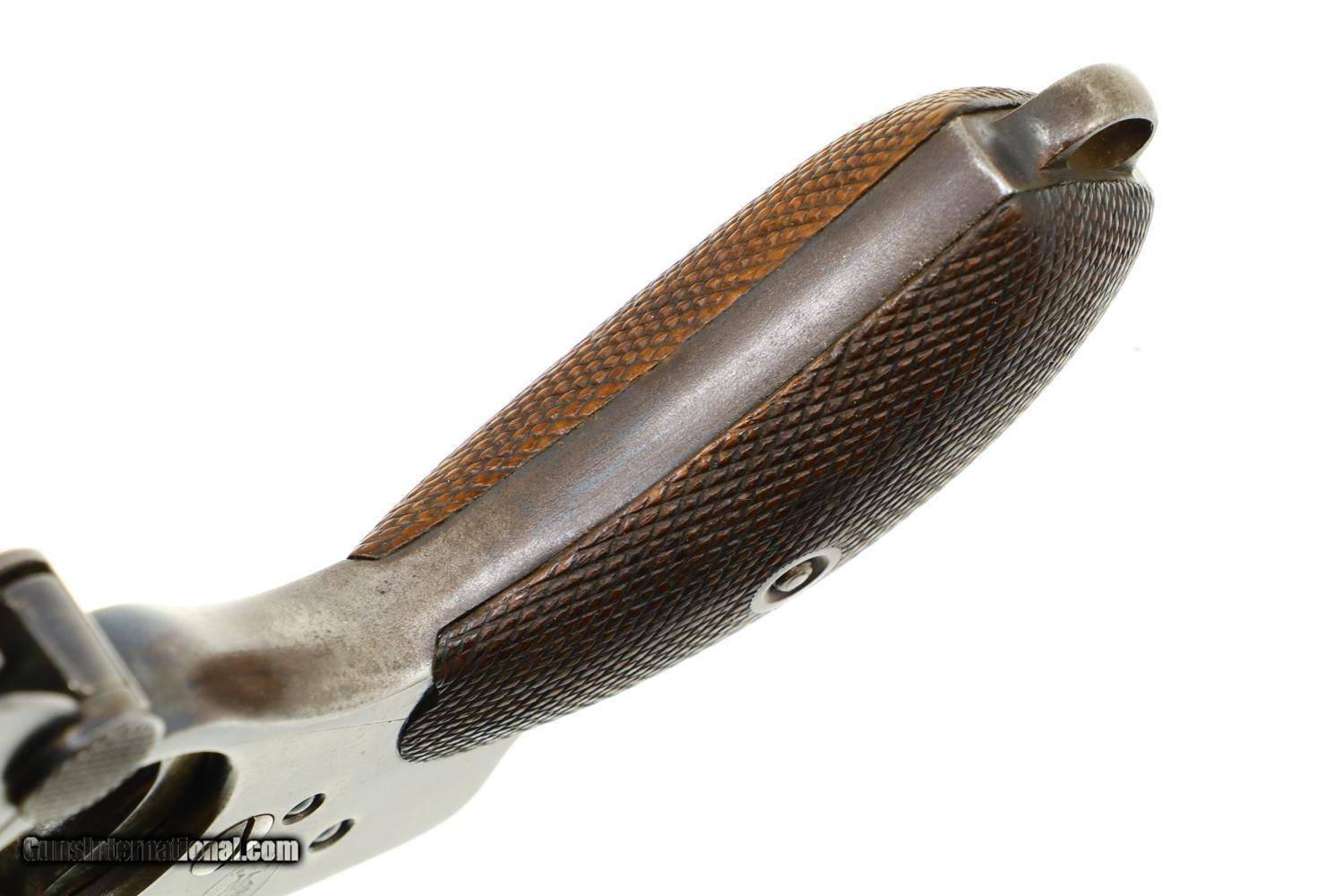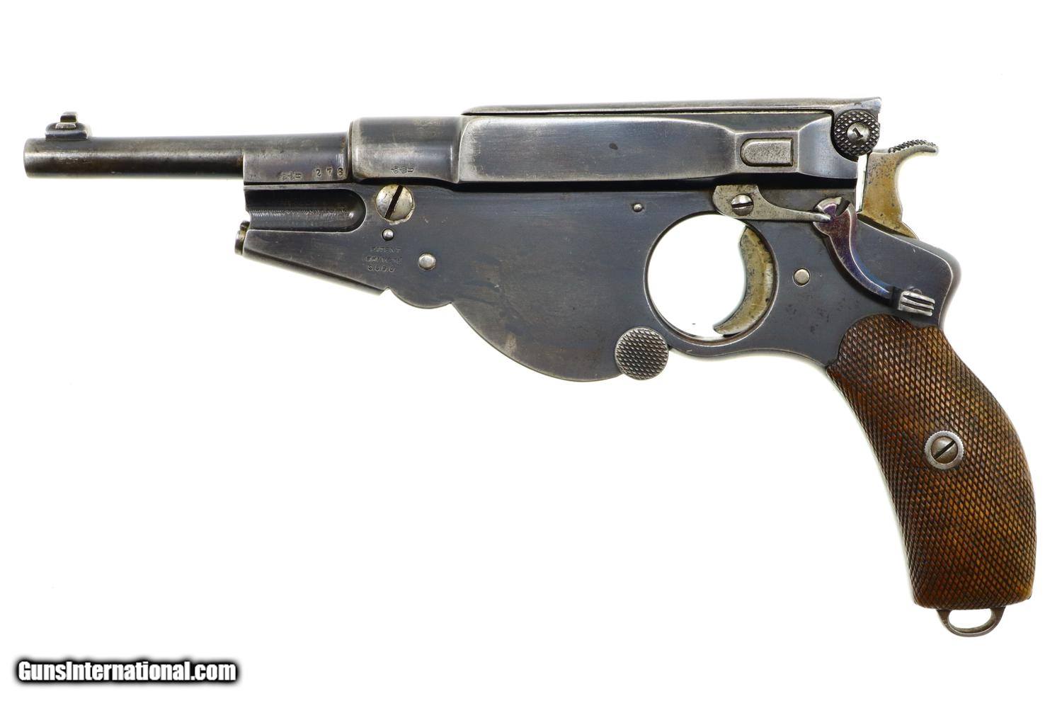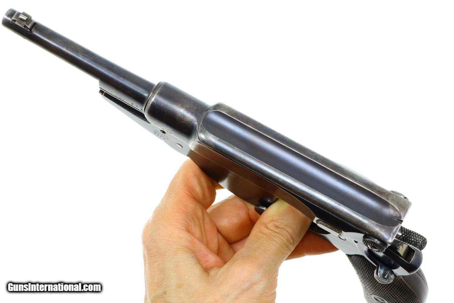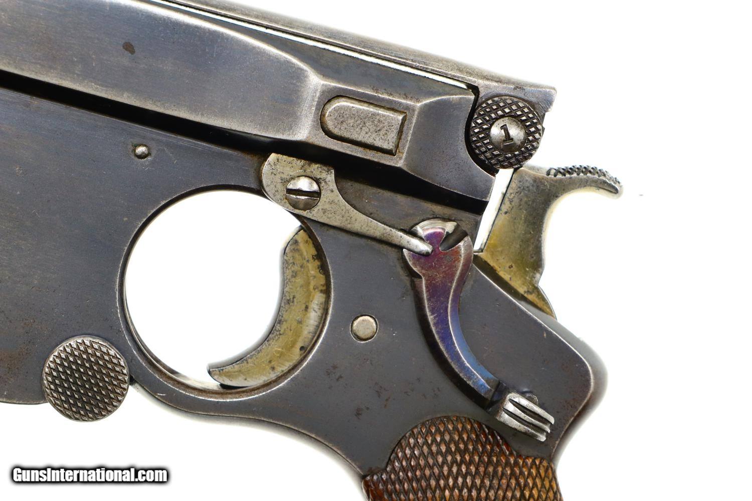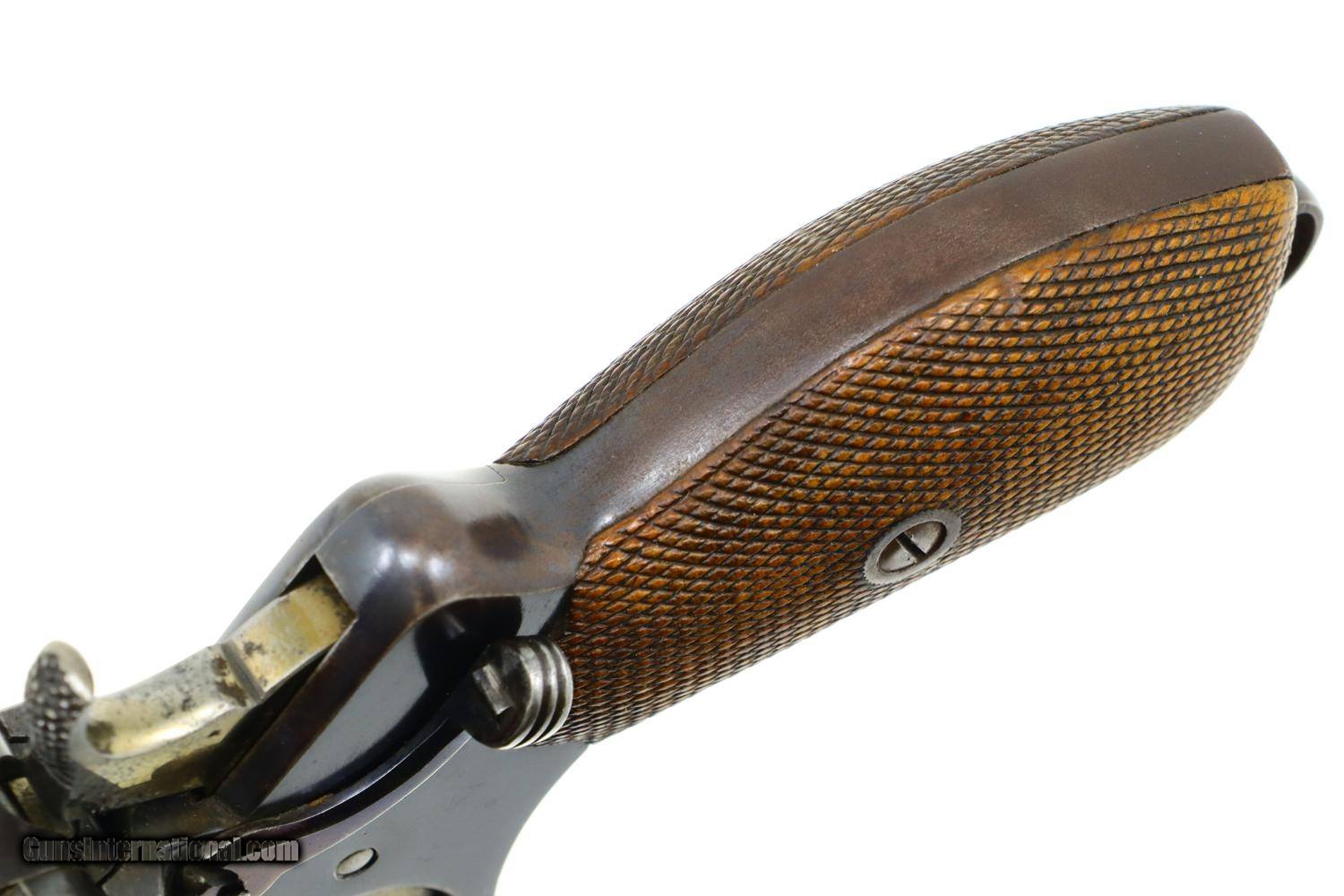Description: Standard late configuration Bergmann 1896, No. 3, single action blowback, bolt cut for extractor, with 4.5” screw-in barrel having drift adjustable front sight and notched rear sight. Crown/C/U proofs on left side of barrel and chamber. Patent markings on left side of frame that has the later pattern rounded grip. Sideplate with miner logo. Full SN on right side of frame. Fitted with uniformly checkered grips and fixed lanyard loop. Synopsis: Scarce, charismatic, Bergmann, 1896, No 3, 6.5mm, 1685, PCA-178 Condition: VG with thinning, fading, and scratches consistent with moderate use. Comparable condition strawed and fired blued parts showing no suggestion of enhancement. Oil darkened grips with blunted checkering. Mirror bright bore. Perfect manual mechanics. A classic semi automatic pistol from the 19th century. ANTIQUE ANTIQUE ANTIQUE ~~Insured shipping fee of $75; most packages shipped using FedEx 2nd Day.~~ SOLD Manufacturer: Bergmann Serial Number: 1685 Caliber Info: 6.5mm |