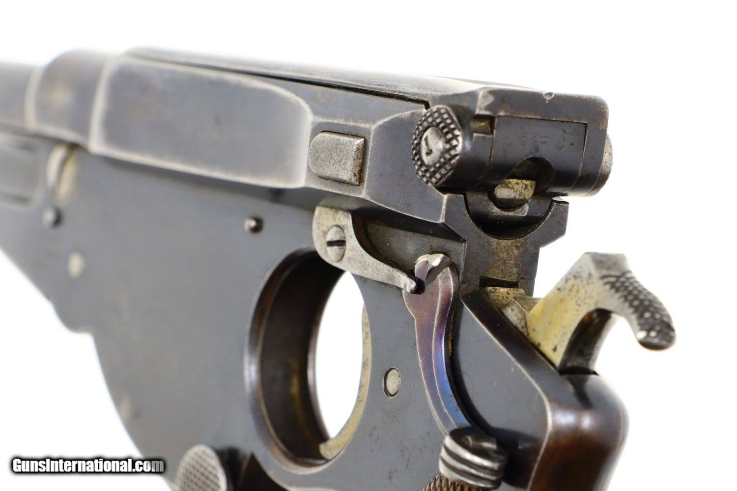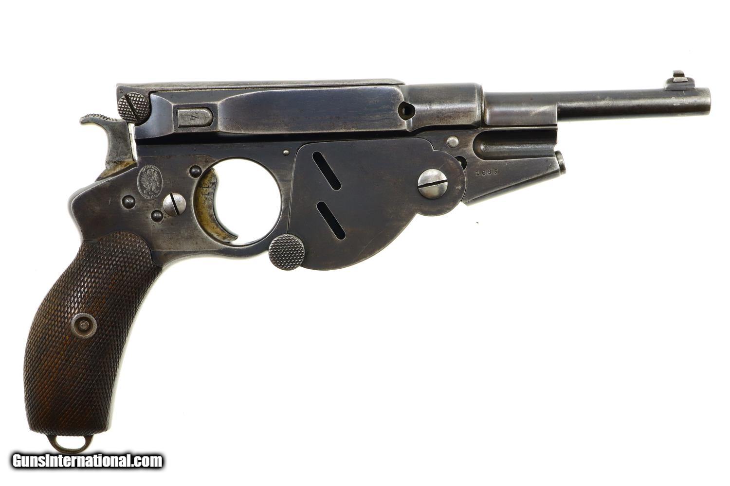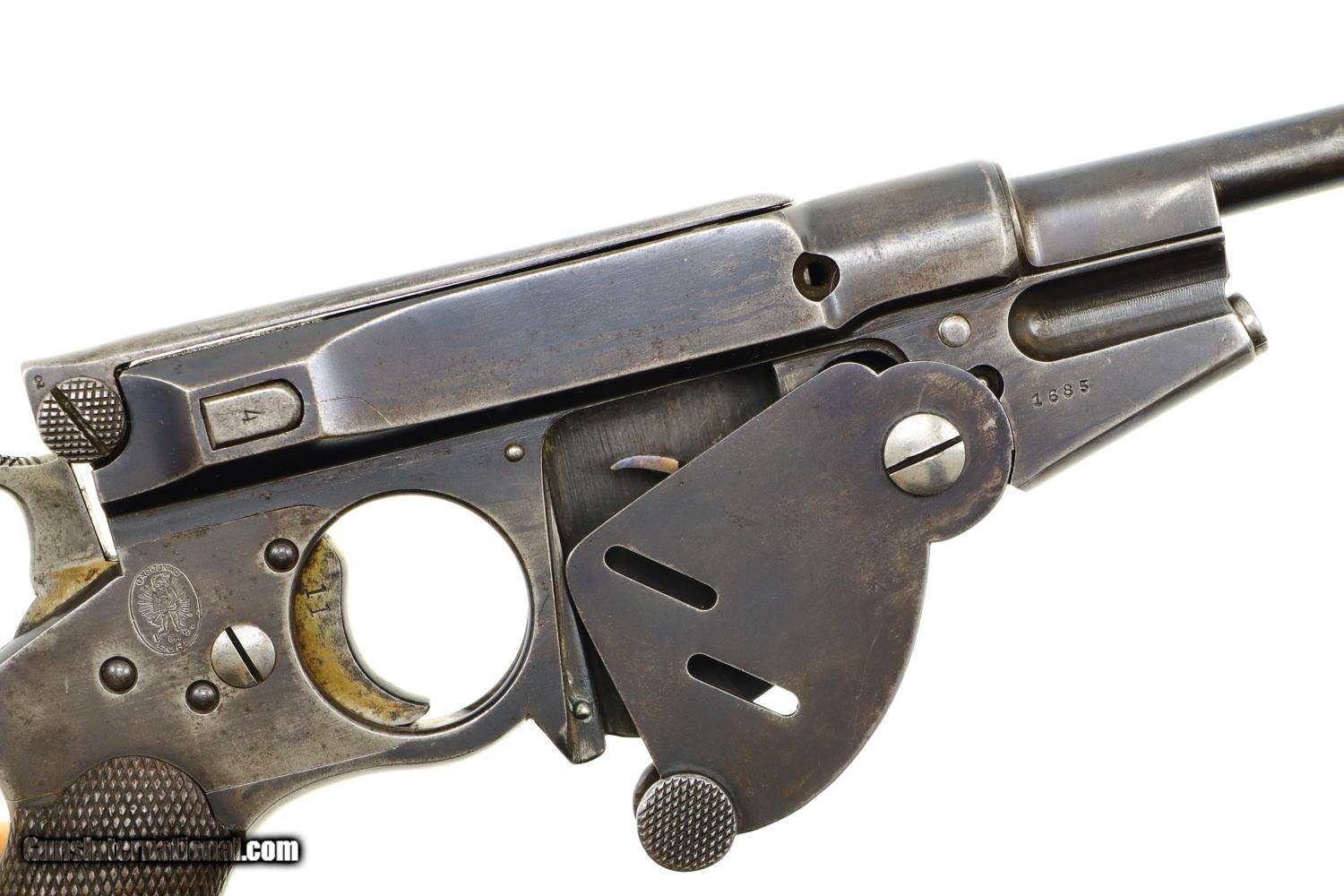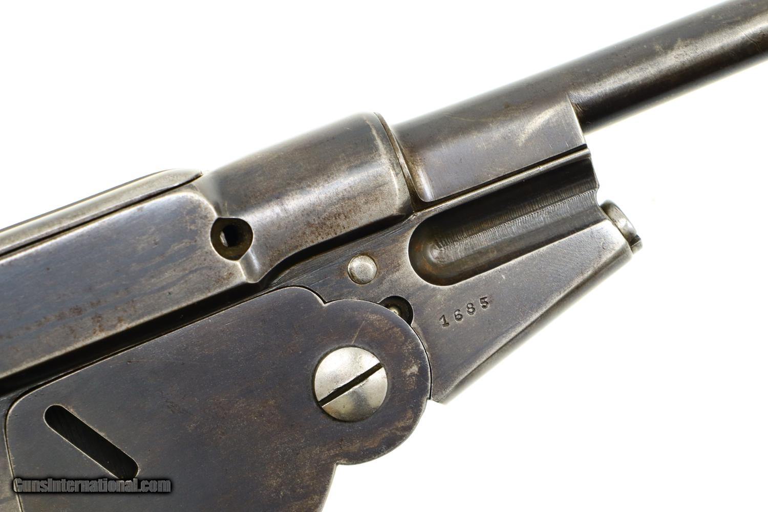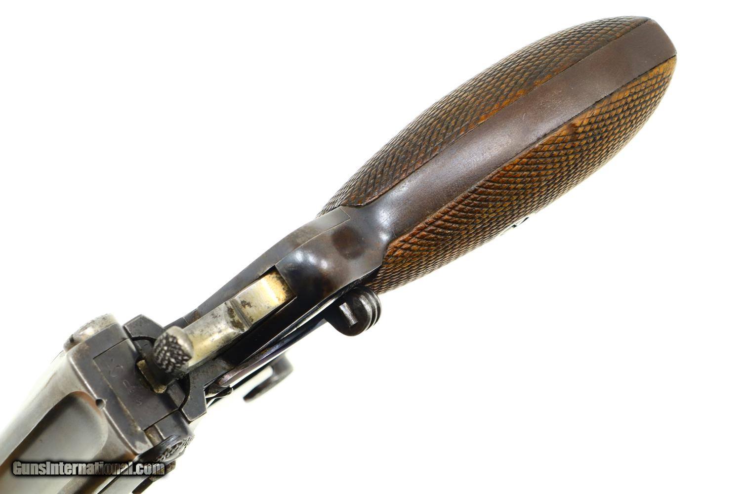 Description: Standard late configuration Bergmann 1896, No. 3, single action blowback, bolt cut for extractor, with 4.5” screw-in barrel having drift adjustable front sight and notched rear sight. Crown/C/U proofs on left side of barrel and chamber. Patent markings on left side of frame that has the later pattern rounded grip. Sideplate with miner logo. Full SN on right side of frame. Fitted with uniformly checkered grips and fixed lanyard loop. Synopsis: Scarce, charismatic, Bergmann, 1896, No 3, 6.5mm, 1685, PCA-178 Condition: VG with thinning, fading, and scratches consistent with moderate use. Comparable condition strawed and fired blued parts showing no suggestion of enhancement. Oil darkened grips with blunted checkering. Mirror bright bore. Perfect manual mechanics. A classic semi automatic pistol from the 19th century. ANTIQUE ANTIQUE ANTIQUE ~~Insured shipping fee of $75; most packages shipped using FedEx 2nd Day.~~ SOLD Manufacturer: Bergmann Serial Number: 1685 Caliber Info: 6.5mm |