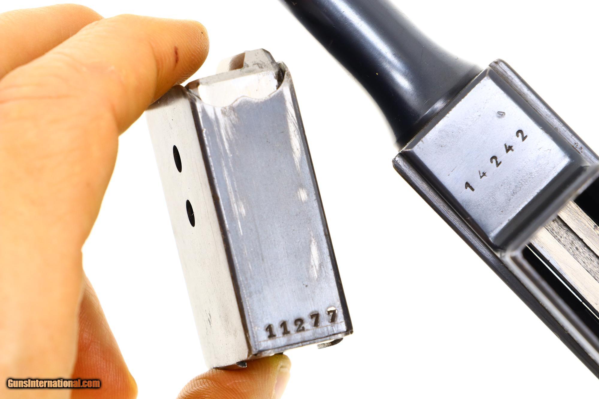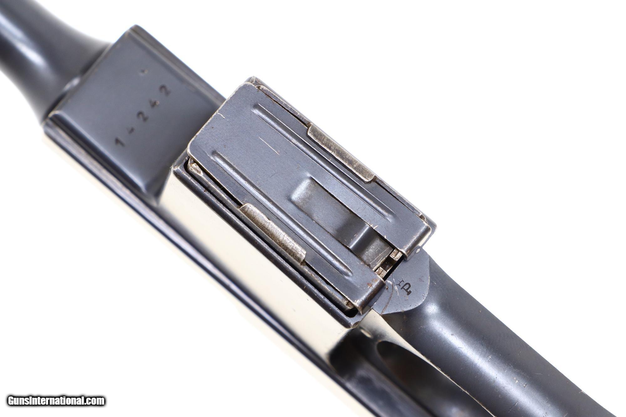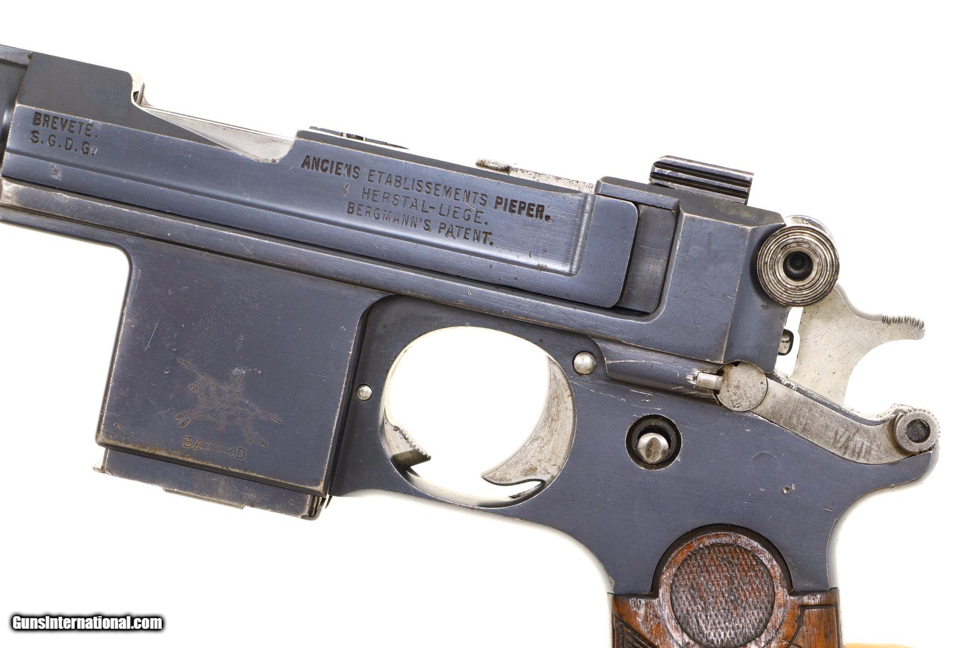 Description: Early and Scarce Bergmann Bayard 1910, 9mmBB, as made in Liege, Belgium, the immediate predecessor of the more recognizable M1910 as adopted by the Danish Military. This Standard configuration M1910 is a single action locked breech pistol with 4” barrel having fixed front and rear sights. Left side of barrel extension with usual manufacturer marking and location in Liege. Prominent "Knight Logo/BAYARD" on left side of frame. Belgium proofs on right side of frame, barrel extension on top of bolt. Serial number: 14242 under frame extension, repeated on inner surface each grip. Magazine is nubered "11277". Original walnut grips and fixed lanyard loop. Synopsis: Bergmann 1910, Very Scarce 1908 Commercial with Mounted Knight Logo, Correct Magazine. Condition: Near EXC original condition with sharp edge wear and fine scattered handling mark as one might expect from a commercial pistol that has seen light use. Fading of fire blue on extractor as photographed. Small parts, in the white, with expected staining. Comparable condition grips with oil staining and scattered handling marks but no cracks or chips. Bright bore with sharp rifling. Perfect manual mechanics. ~~Insured shipping fee of $75; most packages shipped using FedEx 2nd Day.~~ SOLD Curio/Relic: Yes Manufacturer: Bergmann Serial Number: 14242 Caliber Info: 9mmBB |
