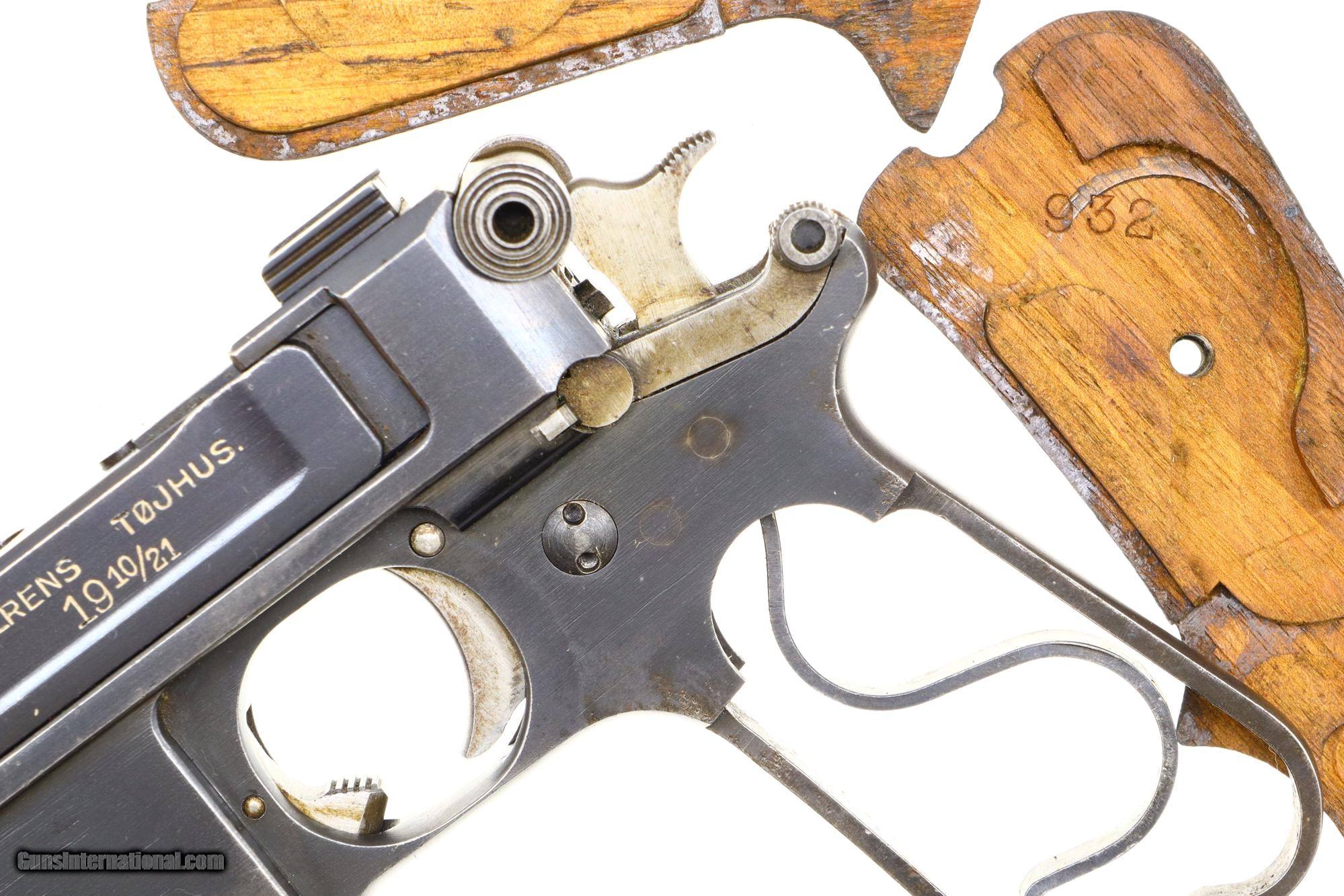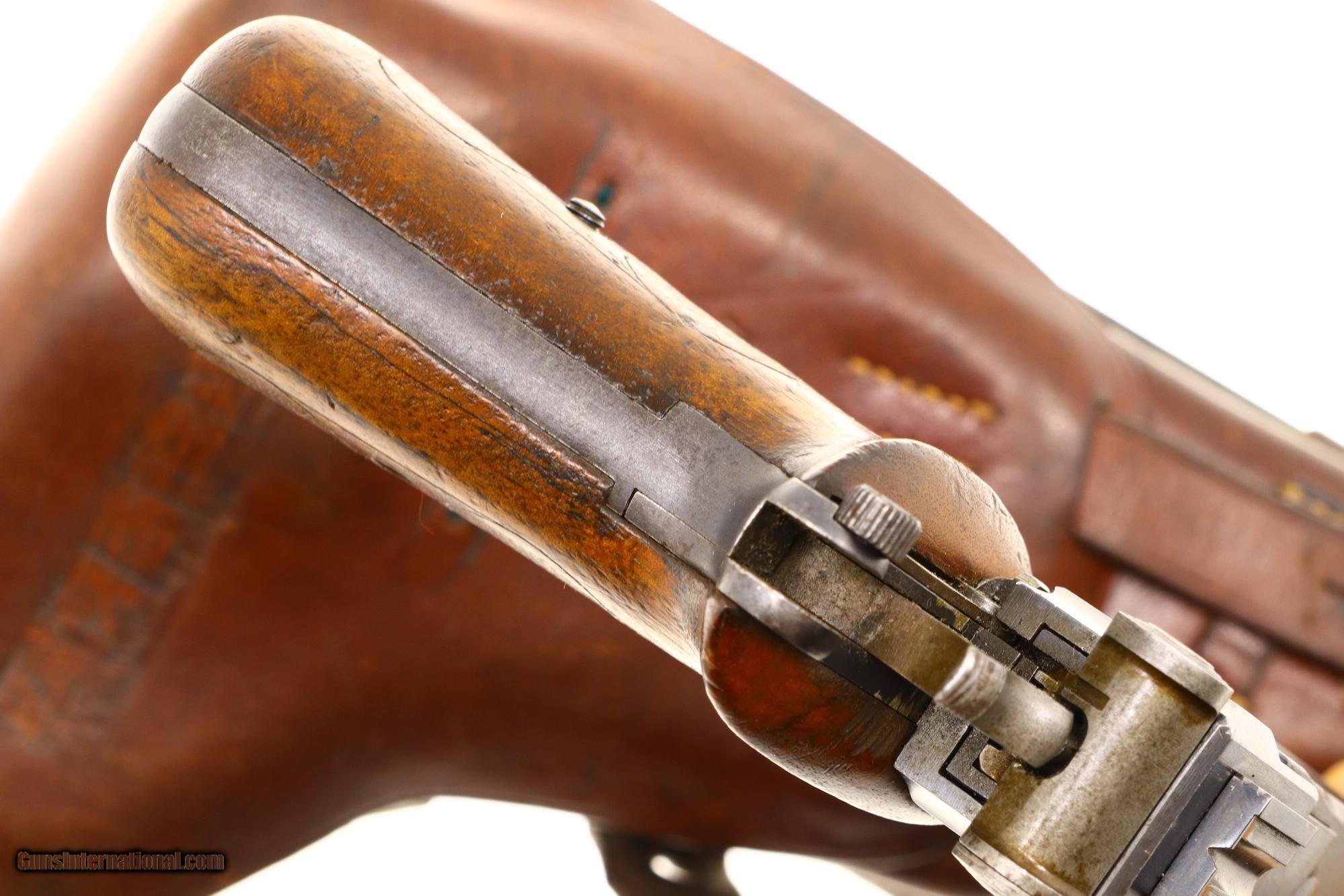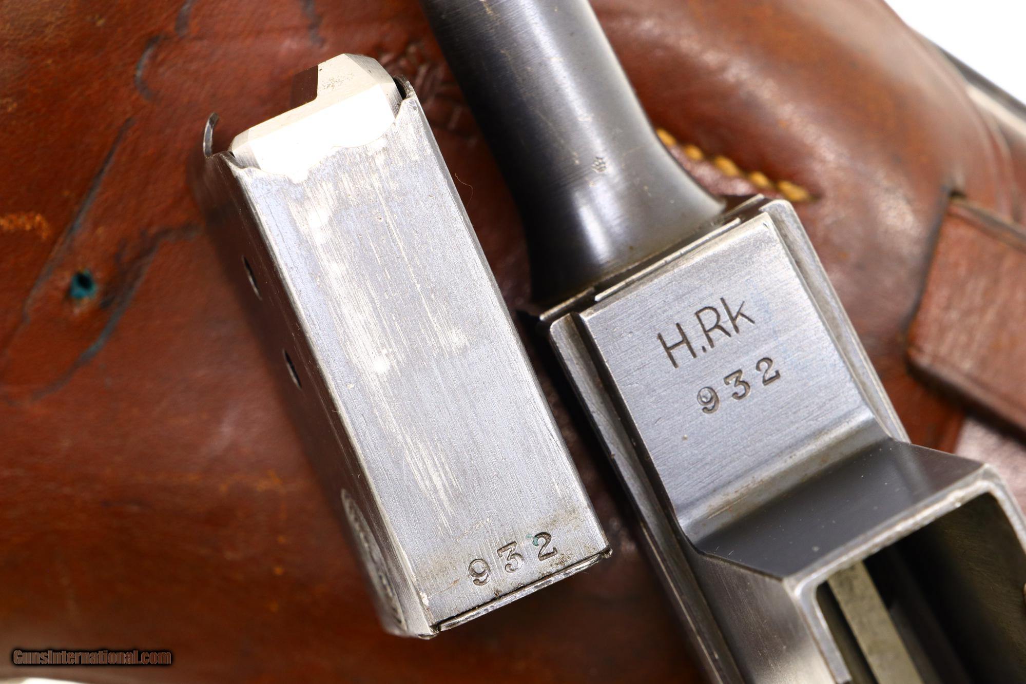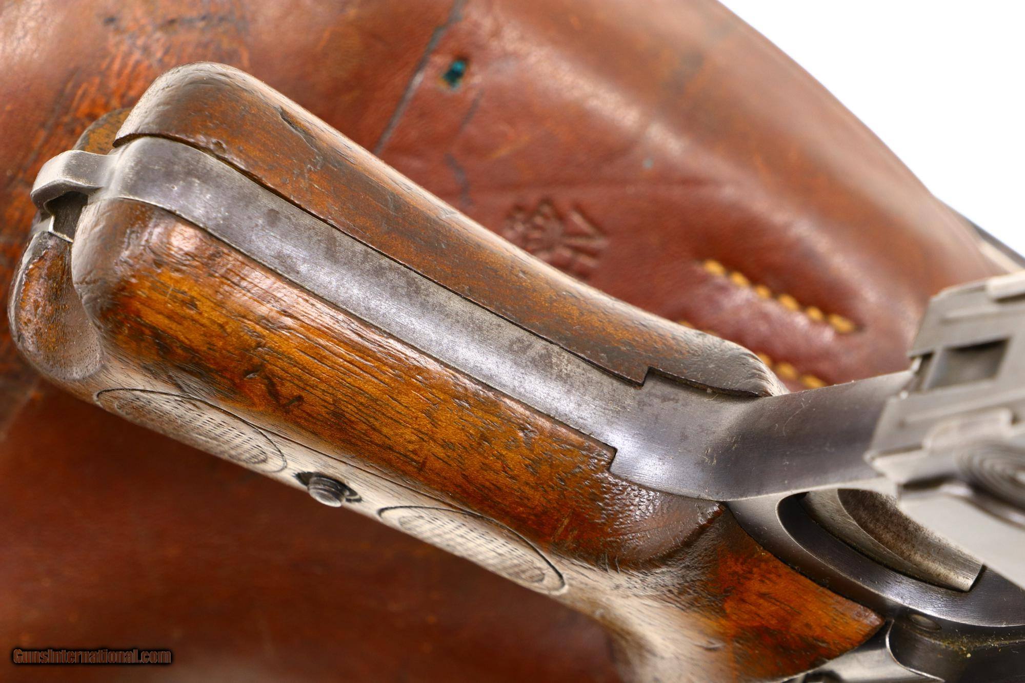 Description: Standard configuration Haerens Tojhus, as made by Danish Arsenal in Copenhagen in 1924 with matching magazine and grips. Single action locked breech pistol having 4” barrel, fixed front and rear sights. The left side of the barrel extension is marked by the Danish manufacturer and is marked "Haerens Tojhus/1910/21". Right side of barrel extension and right side of the barrel are dated "24". Serial number under the forward frame extension. Danish issue number "5774" on right side of the frame. Rework/upgrade notation “M1910/21” marked on the left side of the frame, the improvements including a spanner screw used to secure the sideplate, and oversized wood grips each panel with a pair of impressed circles with indentations. Factory matching magazine. Further disassembly was not effected. Major components rust blued; small parts either in the white or fired blued. Correct undated military holster, previous owner name and Nazi cap pin removed, with cleaning rod, no other accessories. Synopsis: Scarce Bergmann 1910/21, made by Danish Arsenal in Copenhagen, marked Haerens Tojhus, factory matching magazine and grips, complete with holster. Condition: VG/EXC original blue. Small parts in comparable condition, the extractor retaining virtually all of its fire blue, other small parts with staining as pictured. Oil darkened grips with handling marks but no significant chips, splits. Mirror bright bore with with sharp rifling. Perfect manual mechanics. VG holster with oil darkening, evidence of previous onwership name and two holes where Nazi cap pin was fixed. Original stitching intacted. A very unusual, extremely low production, military semiautomatic pistol, this example with a matching magazine, grips, and correct holster, made prior to WWII. ~~Insured shipping fee of $155; most packages shipped using FedEx 2nd Day.~~ SOLD Curio/Relic: Yes Manufacturer: AEP Serial Number: H.Rk 932 Caliber Info: 9mmBB |