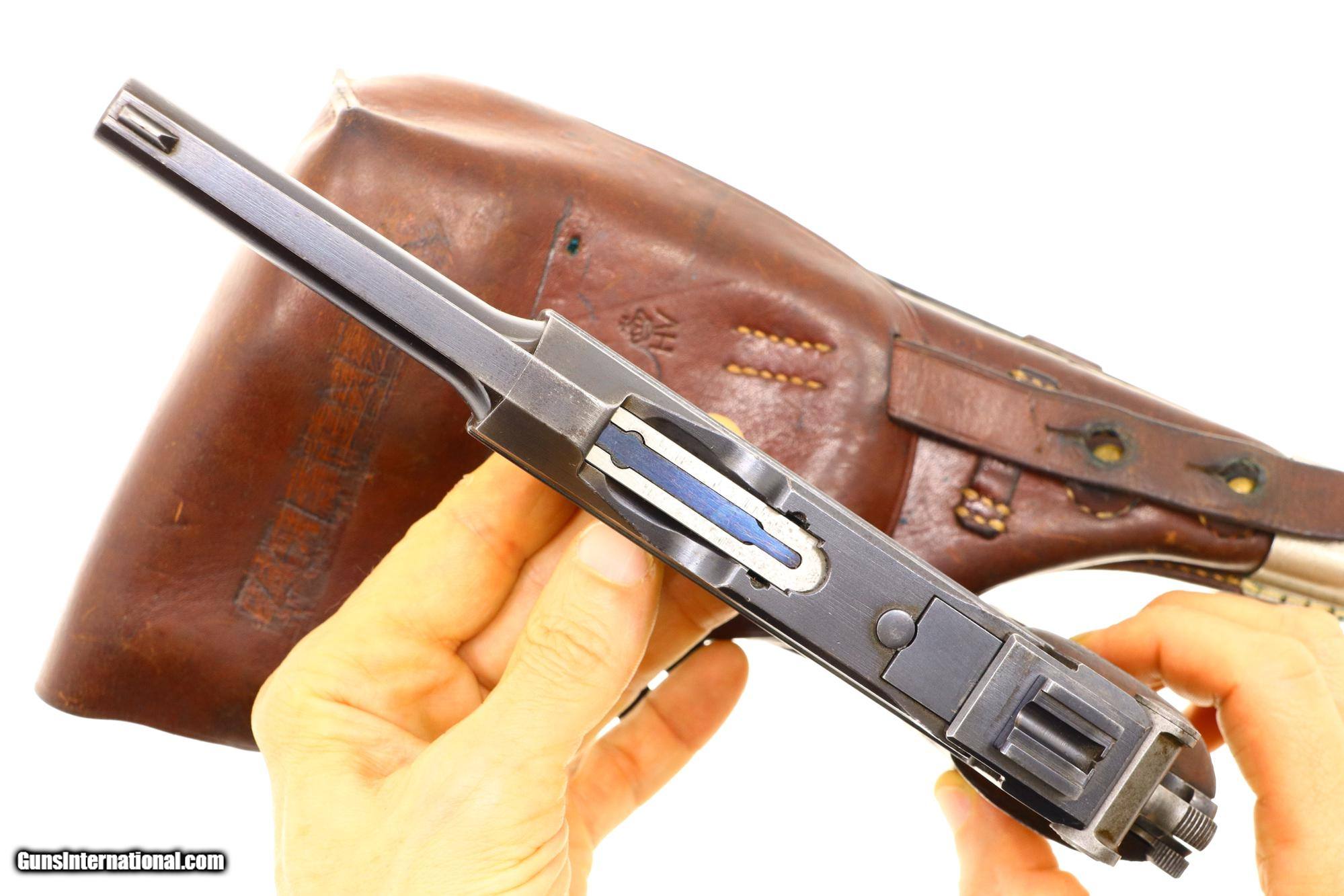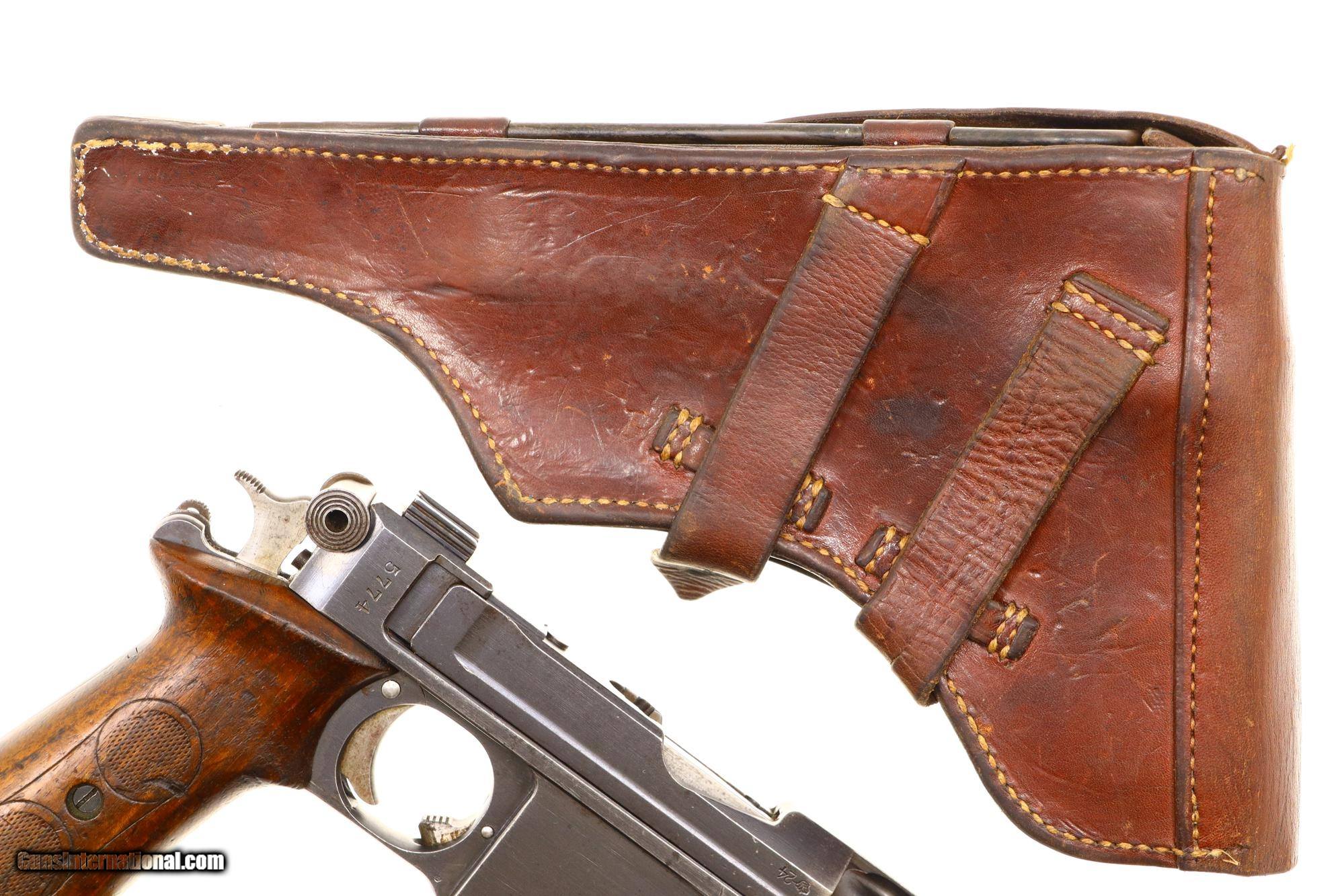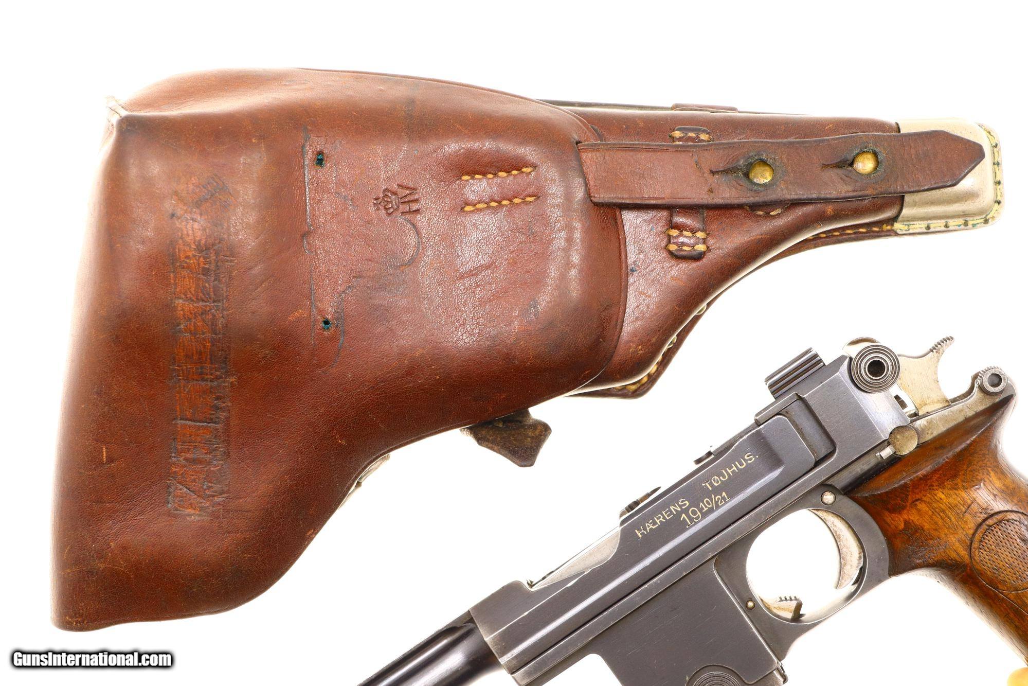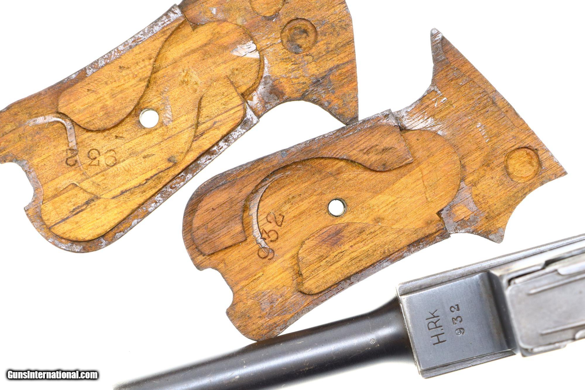 Description: Standard configuration Haerens Tojhus, as made by Danish Arsenal in Copenhagen in 1924 with matching magazine and grips. Single action locked breech pistol having 4” barrel, fixed front and rear sights. The left side of the barrel extension is marked by the Danish manufacturer and is marked "Haerens Tojhus/1910/21". Right side of barrel extension and right side of the barrel are dated "24". Serial number under the forward frame extension. Danish issue number "5774" on right side of the frame. Rework/upgrade notation “M1910/21” marked on the left side of the frame, the improvements including a spanner screw used to secure the sideplate, and oversized wood grips each panel with a pair of impressed circles with indentations. Factory matching magazine. Further disassembly was not effected. Major components rust blued; small parts either in the white or fired blued. Correct undated military holster, previous owner name and Nazi cap pin removed, with cleaning rod, no other accessories. Synopsis: Scarce Bergmann 1910/21, made by Danish Arsenal in Copenhagen, marked Haerens Tojhus, factory matching magazine and grips, complete with holster. Condition: VG/EXC original blue. Small parts in comparable condition, the extractor retaining virtually all of its fire blue, other small parts with staining as pictured. Oil darkened grips with handling marks but no significant chips, splits. Mirror bright bore with with sharp rifling. Perfect manual mechanics. VG holster with oil darkening, evidence of previous onwership name and two holes where Nazi cap pin was fixed. Original stitching intacted. A very unusual, extremely low production, military semiautomatic pistol, this example with a matching magazine, grips, and correct holster, made prior to WWII. ~~Insured shipping fee of $155; most packages shipped using FedEx 2nd Day.~~ SOLD Curio/Relic: Yes Manufacturer: AEP Serial Number: H.Rk 932 Caliber Info: 9mmBB |