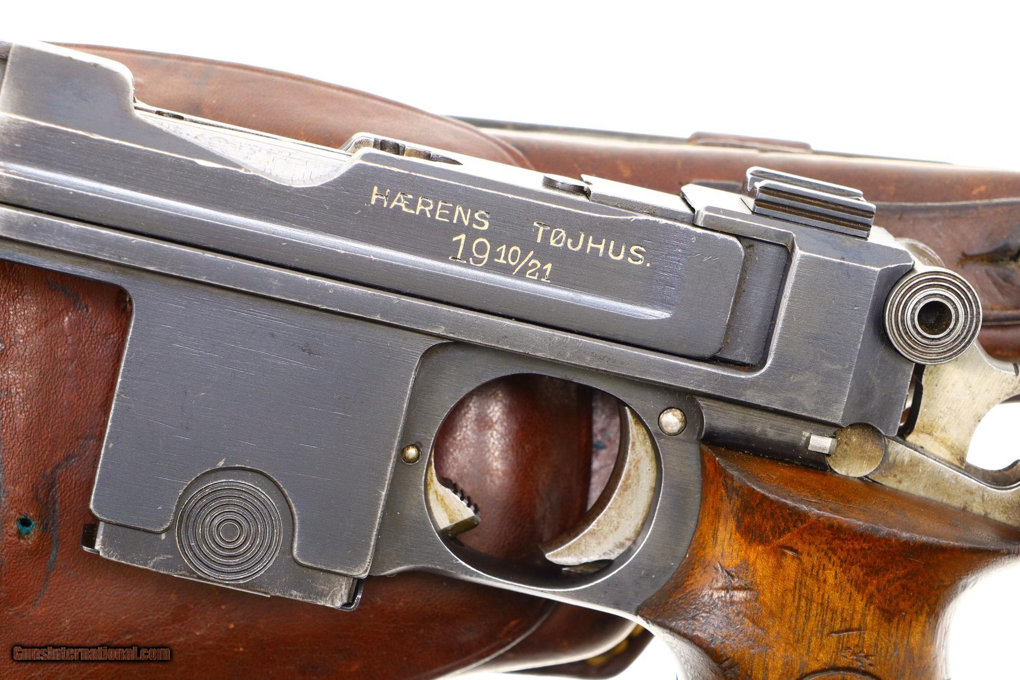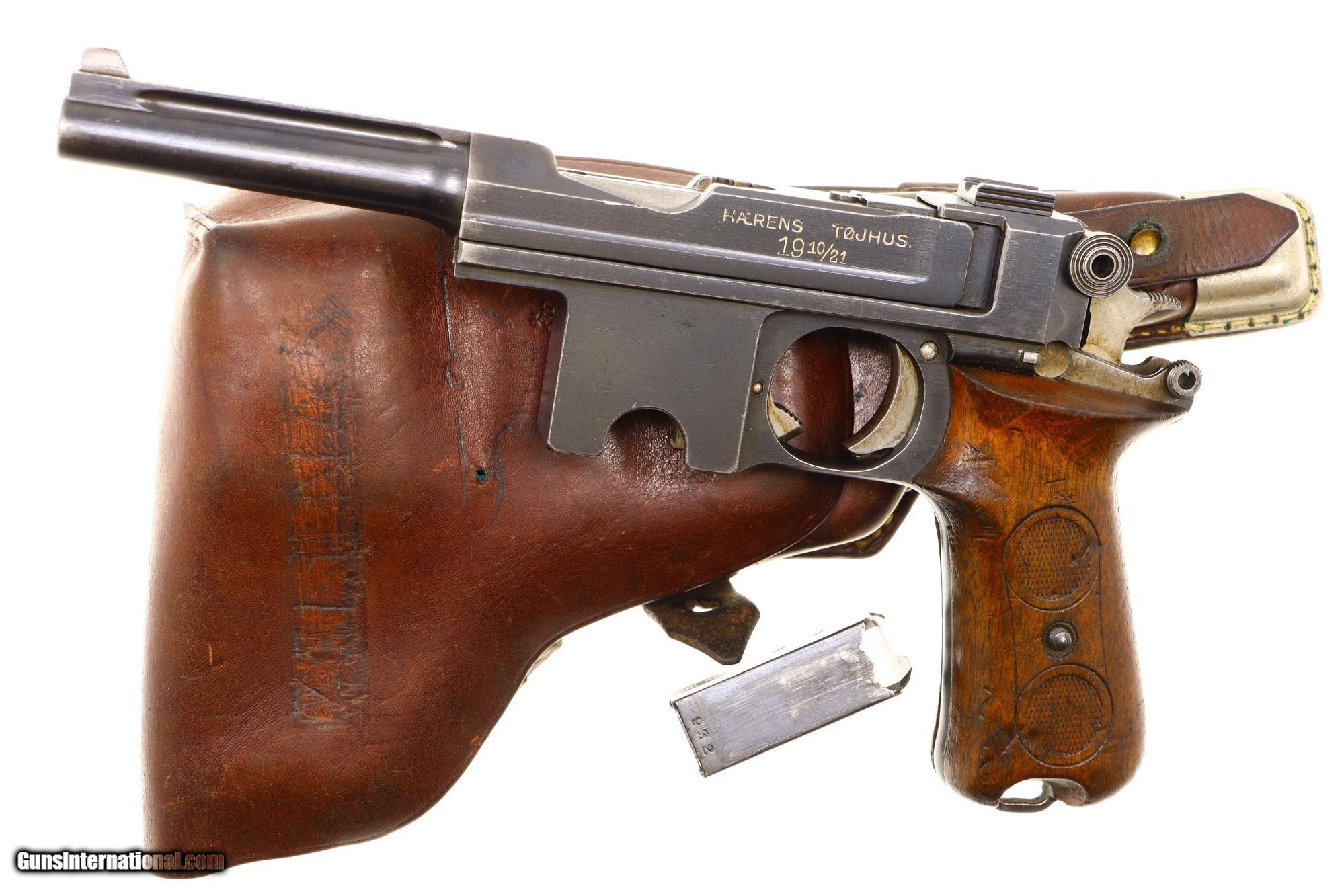 Standard configuration Haerens Tojhus, as made by Danish Arsenal in Copenhagen in 1924 with matching magazine and grips. Single action locked breech pistol having 4” barrel, fixed front and rear sights. The left side of the barrel extension is marked by the Danish manufacturer and is marked "Haerens Tojhus/1910/21". Right side of barrel extension and right side of the barrel are dated "24". Serial number under the forward frame extension. Danish issue number "5774" on right side of the frame. Rework/upgrade notation “M1910/21” marked on the left side of the frame, the improvements including a spanner screw used to secure the sideplate, and oversized wood grips each panel with a pair of impressed circles with indentations. Factory matching magazine. Further disassembly was not effected. Major components rust blued; small parts either in the white or fired blued. Correct undated military holster, previous owner name and Na*i cap pin removed, with cleaning rod, no other accessories.