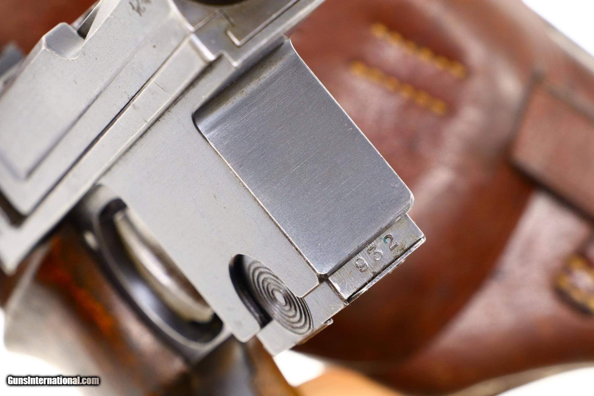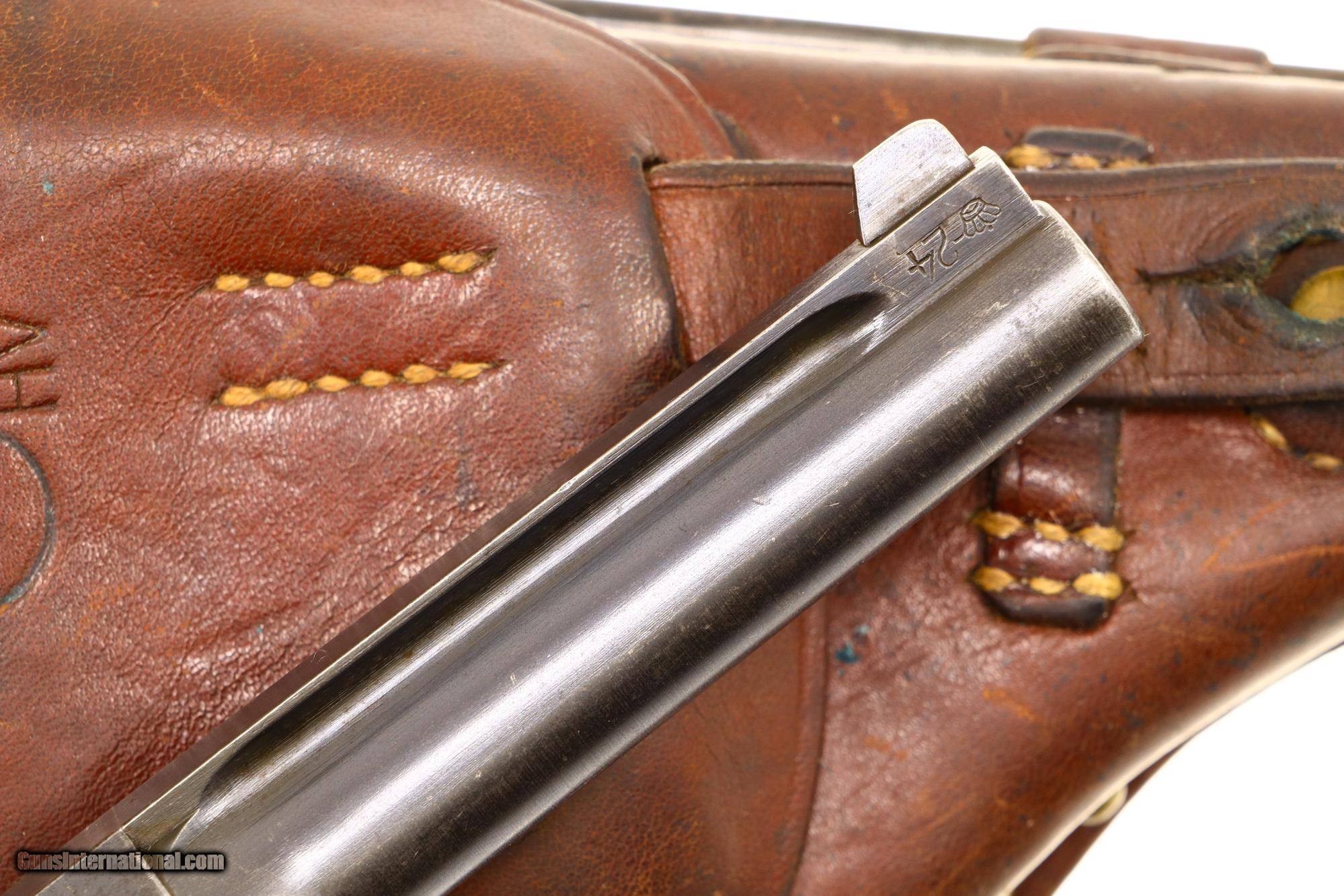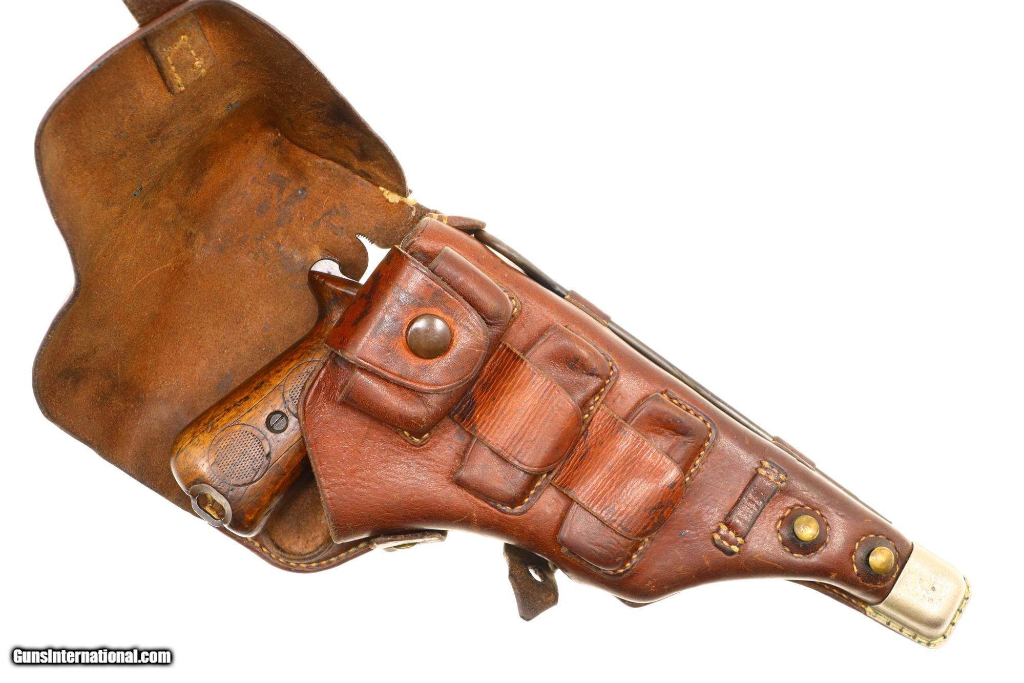 VG/EXC original blue. Small parts in comparable condition, the extractor retaining virtually all of its fire blue, other small parts with staining as pictured. Oil darkened grips with handling marks but no significant chips, splits. Mirror bright bore with with sharp rifling. Perfect manual mechanics. VG holster with oil darkening, evidence of previous onwership name and two holes where Na*i cap pin was fixed. Original stitching intacted. A very unusual, extremely low production, military semiautomatic pistol, this example with a matching magazine, grips, and correct holster, made prior to WWII.