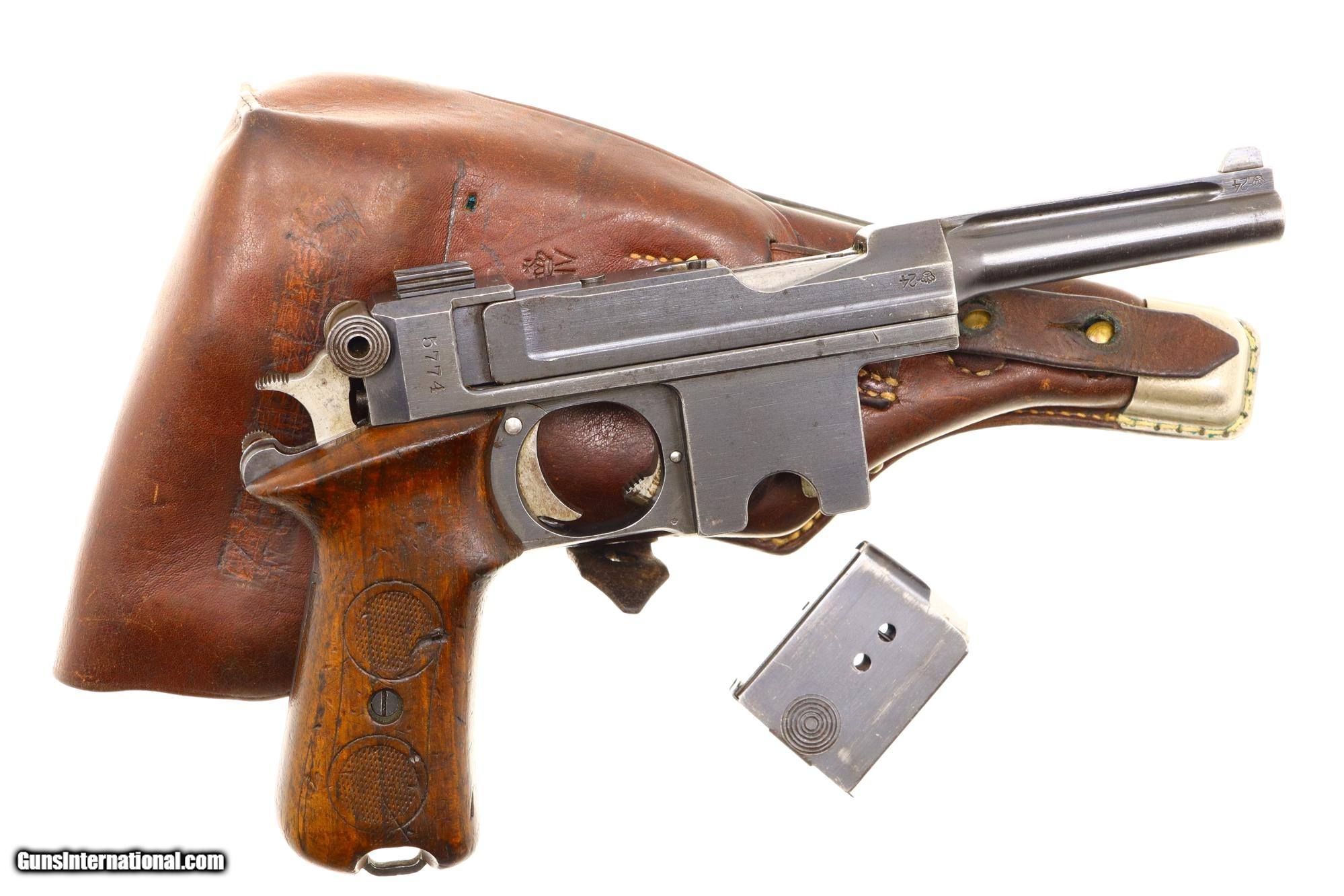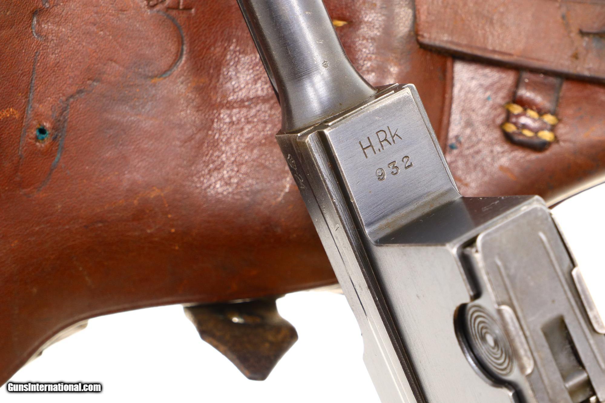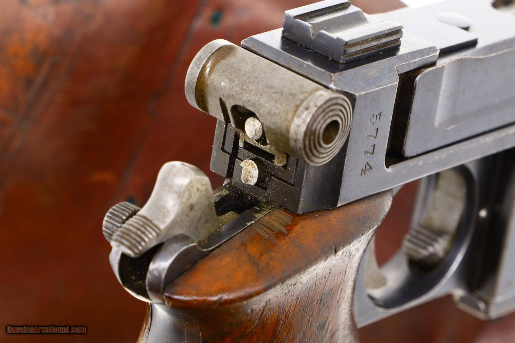 VG/EXC original blue. Small parts in comparable condition, the extractor retaining virtually all of its fire blue, other small parts with staining as pictured. Oil darkened grips with handling marks but no significant chips, splits. Mirror bright bore with with sharp rifling. Perfect manual mechanics. VG holster with oil darkening, evidence of previous onwership name and two holes where Na*i cap pin was fixed. Original stitching intacted. A very unusual, extremely low production, military semiautomatic pistol, this example with a matching magazine, grips, and correct holster, made prior to WWII.