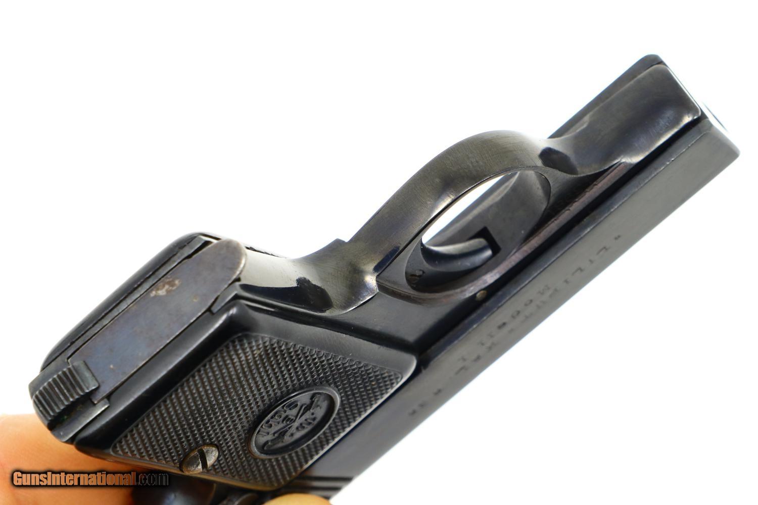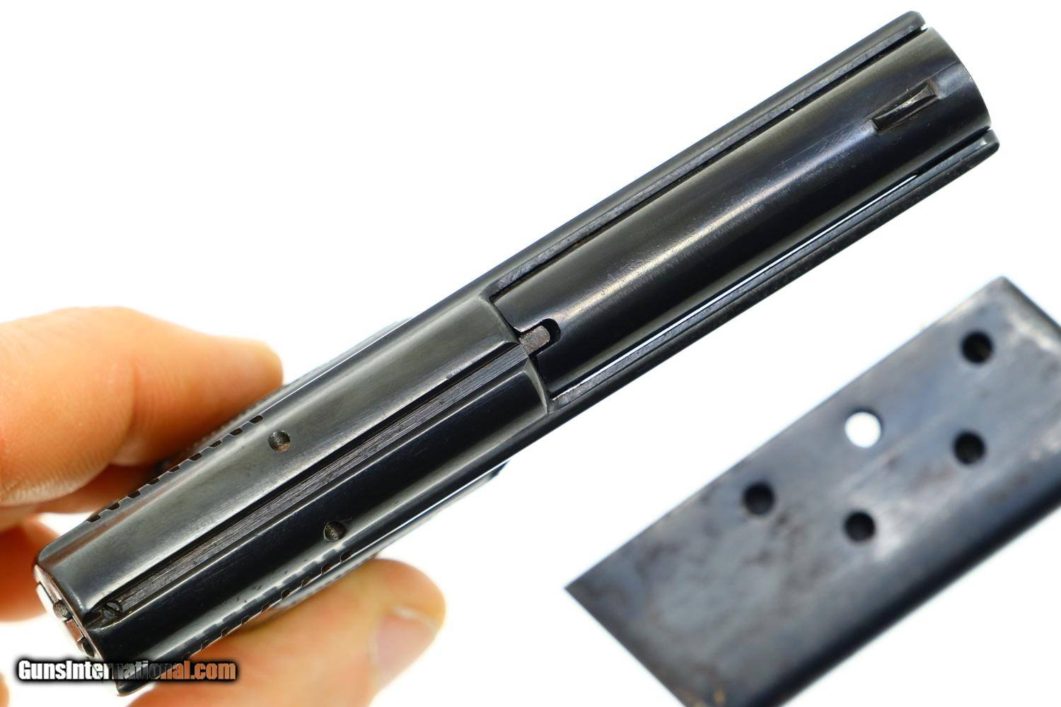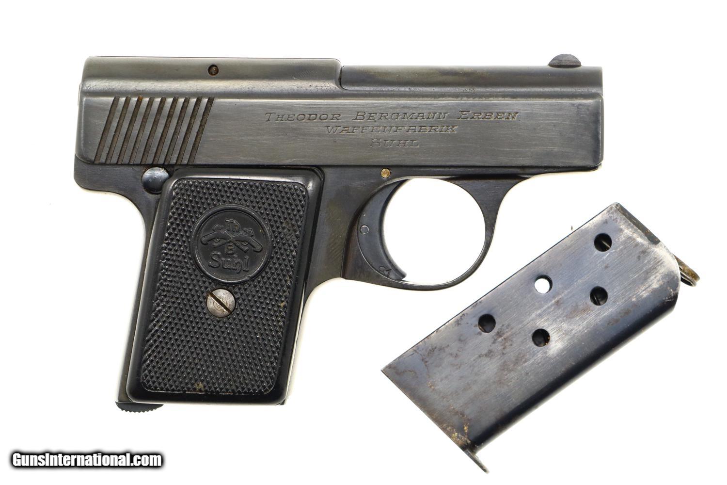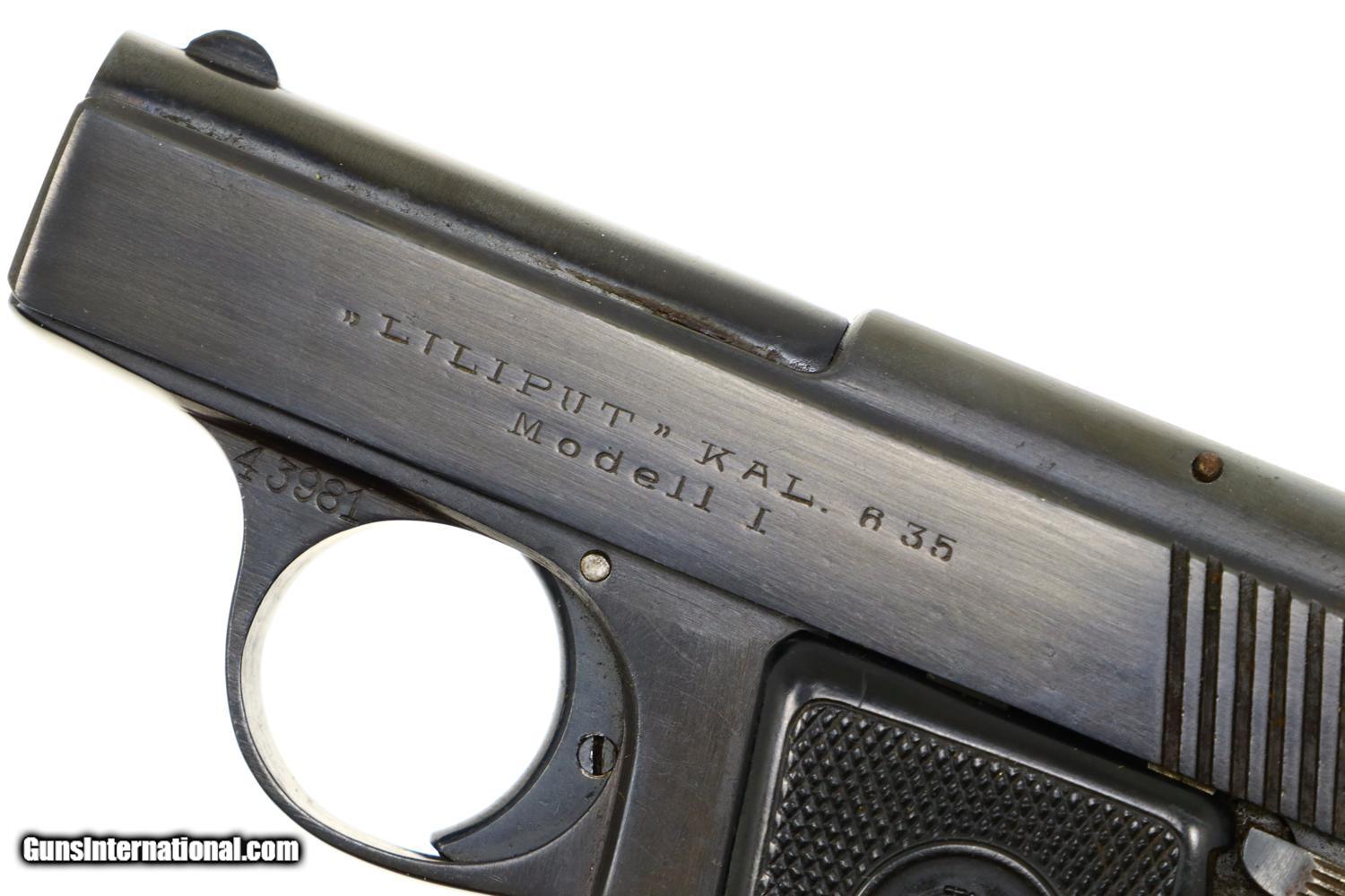 Description: Nicely restored Bergmann Erben Liliput Modell I vest pocket pistol, about the same size as a Baby Browning, designed as a single action blowback with left tang mounted safety and bottom magazine release. Left side of slide with model reference; right side of slide with manufacturer name and location in Suhl, Germany. SN on left trigger guard web. Black plastic grips with late Bergmann logo in checkered field. Blued magazine, the right side with five indicator holes and fixed floorplate. Synopsis: Scarce Bergmann Liliput Modell I pistol, cal 6.35mm, 43981, PCA-177 Condition: 99% bright restored blue. VG+ bore. Perfect manual mechanics. One of the more unusual vest pocket pistols made by Bergmann. ~~Insured shipping fee of $45; most packages shipped using FedEx 2nd Day.~~ SOLD Manufacturer: Bergmann Serial Number: 43981 Caliber Info: 6.35mm |