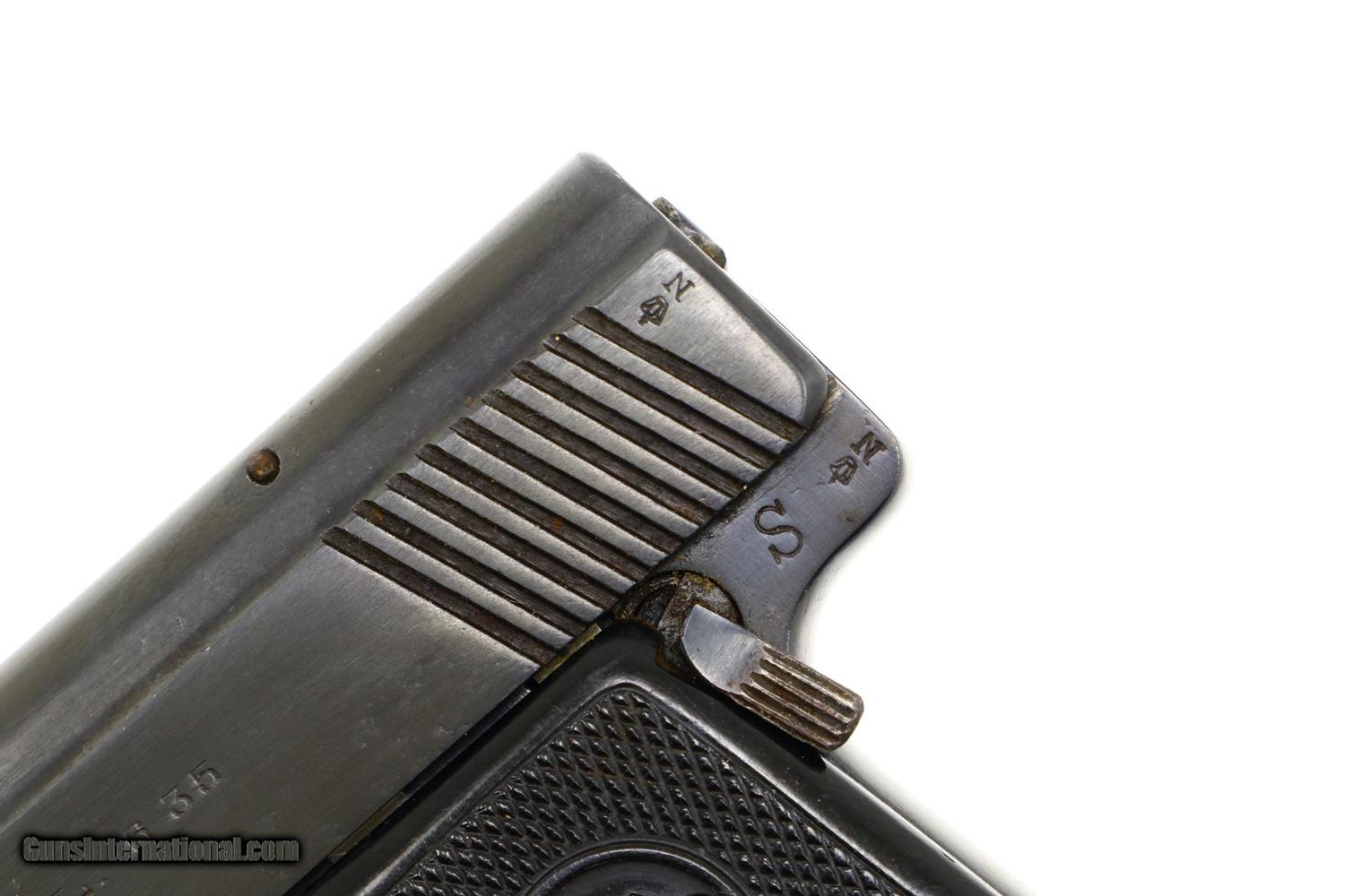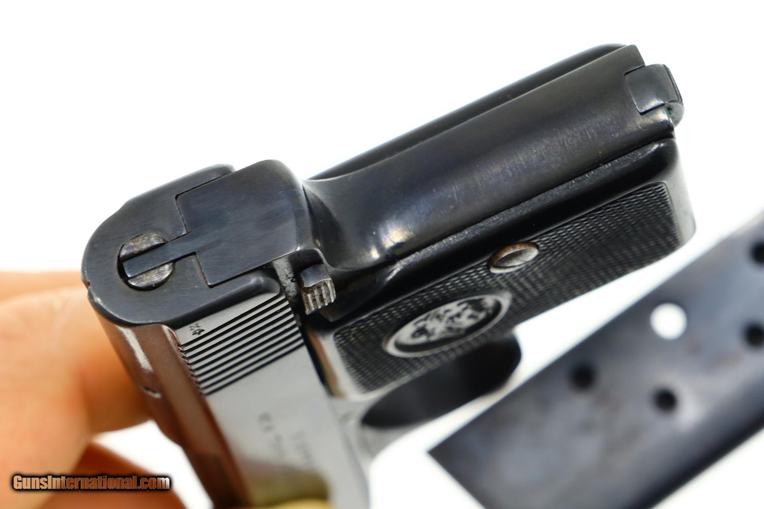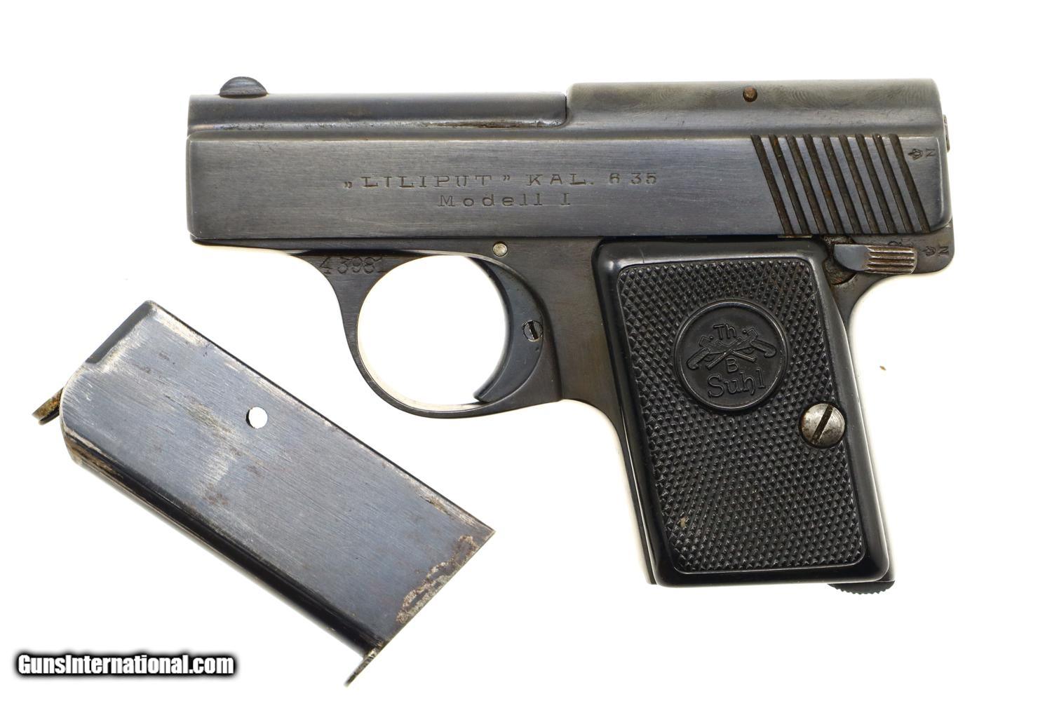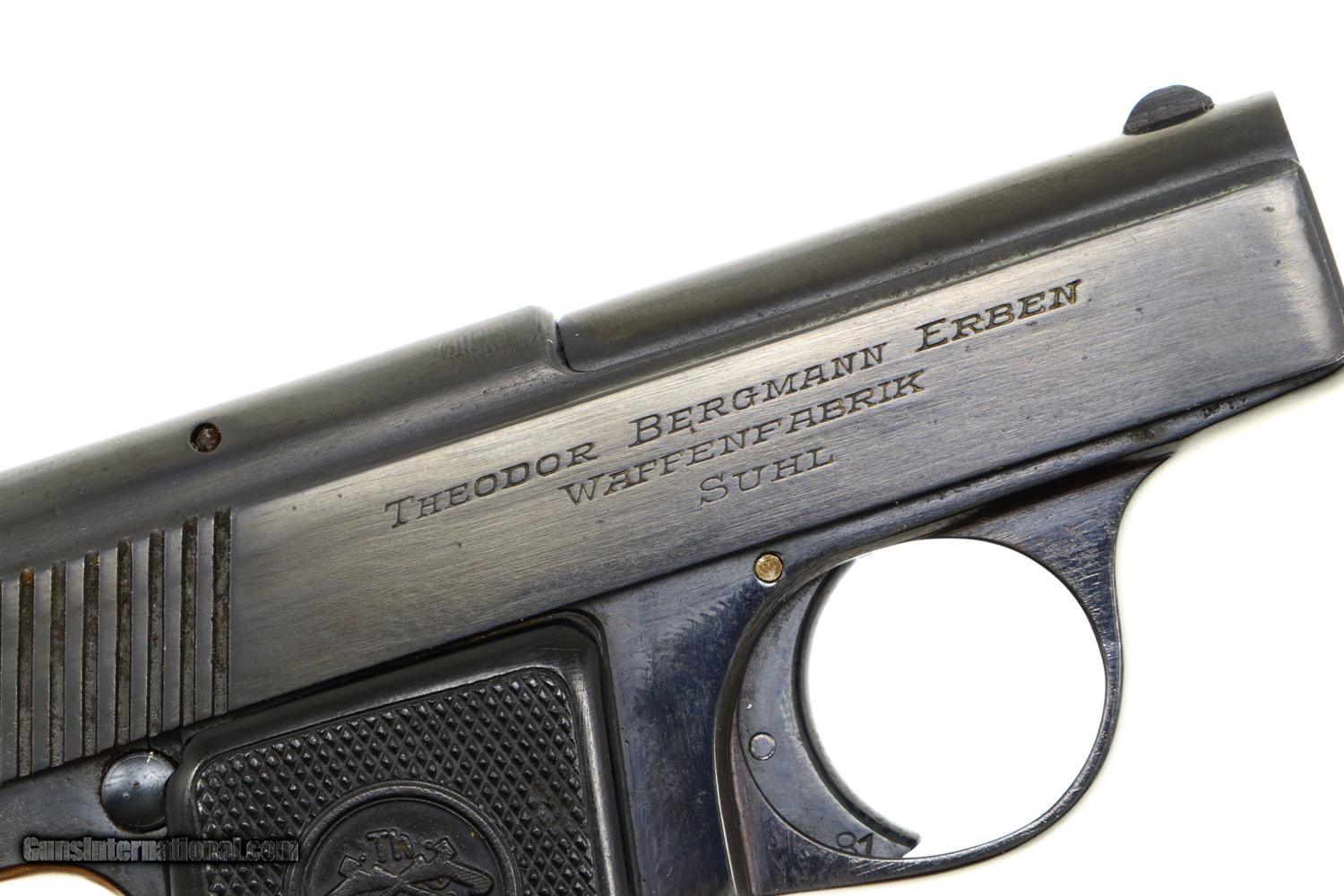 Description: Nicely restored Bergmann Erben Liliput Modell I vest pocket pistol, about the same size as a Baby Browning, designed as a single action blowback with left tang mounted safety and bottom magazine release. Left side of slide with model reference; right side of slide with manufacturer name and location in Suhl, Germany. SN on left trigger guard web. Black plastic grips with late Bergmann logo in checkered field. Blued magazine, the right side with five indicator holes and fixed floorplate. Synopsis: Scarce Bergmann Liliput Modell I pistol, cal 6.35mm, 43981, PCA-177 Condition: 99% bright restored blue. VG+ bore. Perfect manual mechanics. One of the more unusual vest pocket pistols made by Bergmann. ~~Insured shipping fee of $45; most packages shipped using FedEx 2nd Day.~~ SOLD Manufacturer: Bergmann Serial Number: 43981 Caliber Info: 6.35mm |