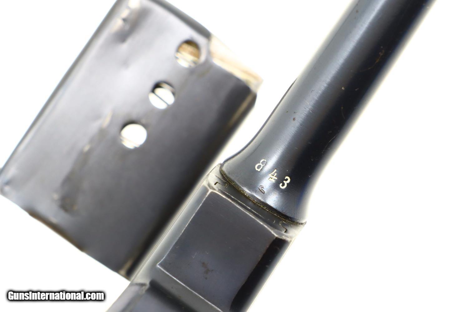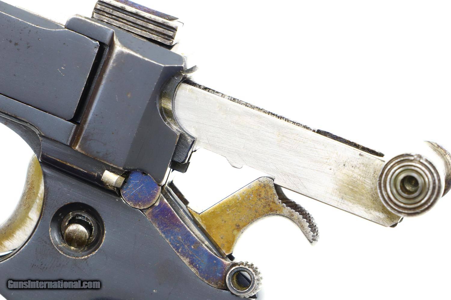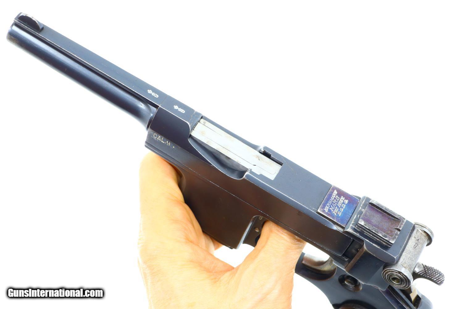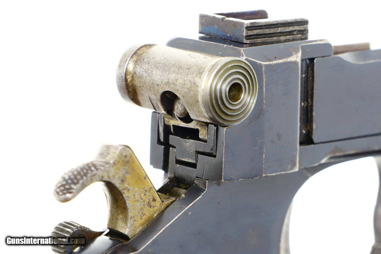 Description: Standard configuration Bergmann 1903 with 4” barrel having fixed front and rear sights. Left side of barrel extension marked “CAL.9.” The locking block on top of slide marked with Bergman Mars patent reference. Crown/Crown/U on barrel, barrel extension and left side of trigger guard. Serial number under barrel. Walnut checkered grips, unnumbered, with fine border, secured with single transverse screw. Replacement/reworked magazine #779. Synopsis: Bergmann Mars, 1903, German, 9mmB, 843, A-1878 Condition: VG+ original rust blue finish, with muzzle and sharp edge wear as one might expect from a lightly used pistol. . Comparable condition fire blue on locking block, rear sight and safety lever. Same holds true for the straw on hammer and trigger. Replacement/reworked magazine whose removal is a little sticky. Original grips, oil darkened, with blunted checkering and scattered handling marks. No suggestion of enhancement. Bright Bore with sharp rifling. Perfect manual mechanics. A very nice Bergmann M1903, a real find for those interested in early developmental pistols! ~~Insured shipping fee of $155; most packages shipped using FedEx 2nd Day.~~ SOLD Curio/Relic: Yes Manufacturer: Bergmann Serial Number: 843 Caliber Info: 9mmB |