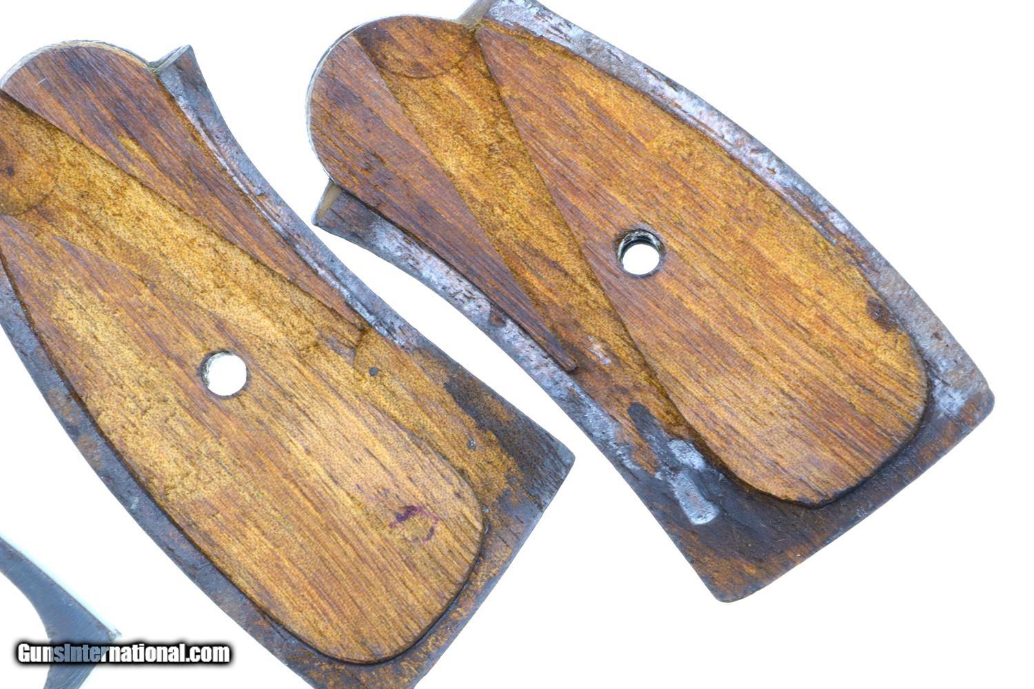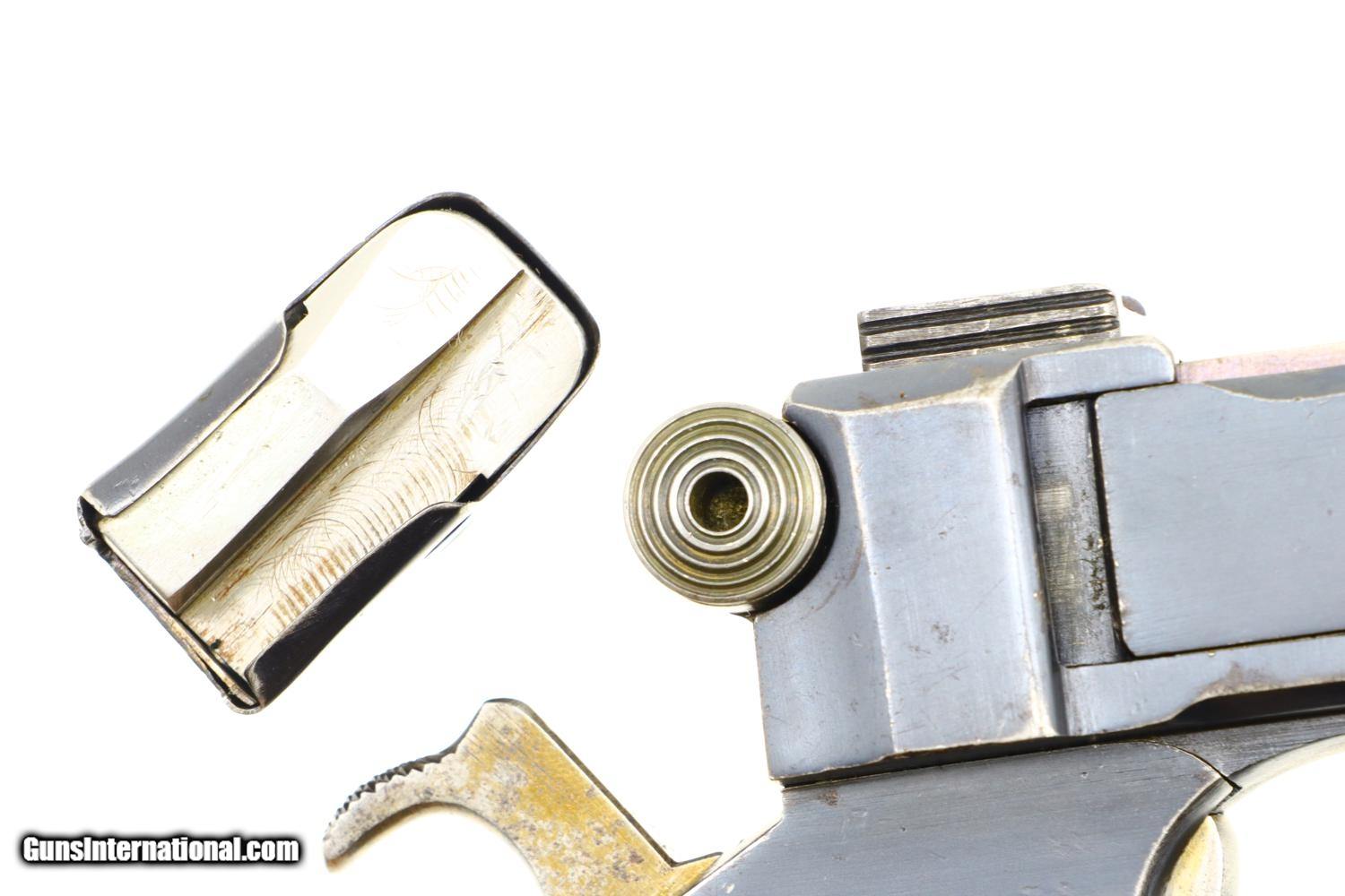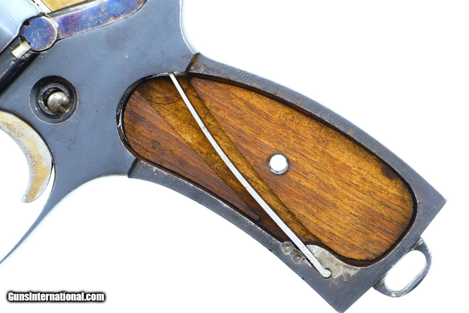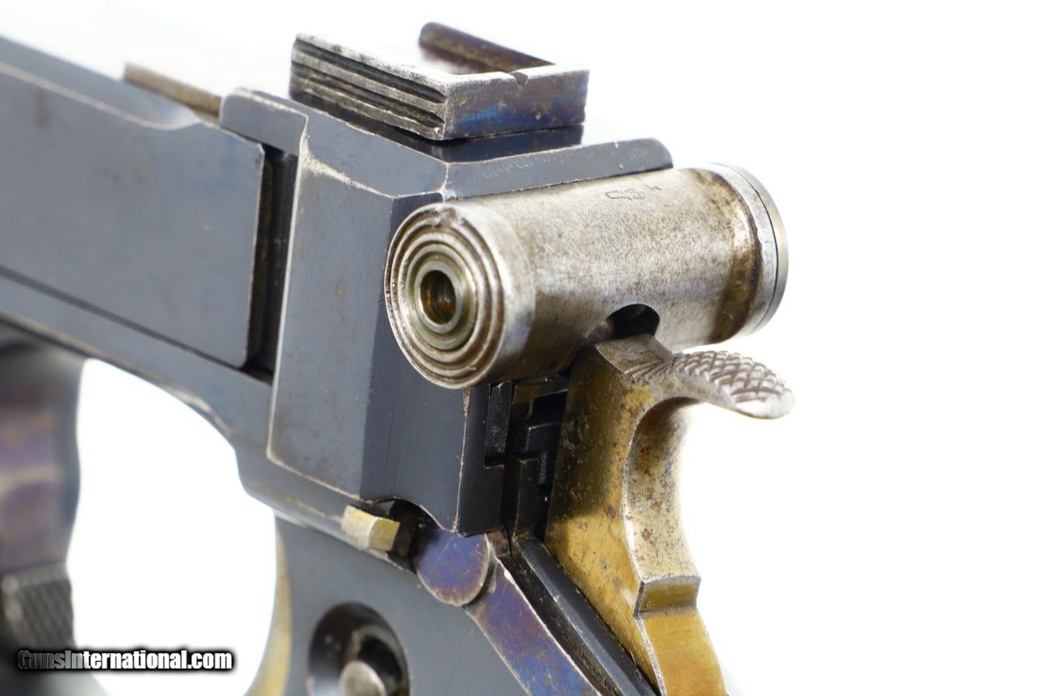 Description: Standard configuration Bergmann 1903 with 4” barrel having fixed front and rear sights. Left side of barrel extension marked “CAL.9.” The locking block on top of slide marked with Bergman Mars patent reference. Crown/Crown/U on barrel, barrel extension and left side of trigger guard. Serial number under barrel. Walnut checkered grips, unnumbered, with fine border, secured with single transverse screw. Replacement/reworked magazine #779. Synopsis: Bergmann Mars, 1903, German, 9mmB, 843, A-1878 Condition: VG+ original rust blue finish, with muzzle and sharp edge wear as one might expect from a lightly used pistol. . Comparable condition fire blue on locking block, rear sight and safety lever. Same holds true for the straw on hammer and trigger. Replacement/reworked magazine whose removal is a little sticky. Original grips, oil darkened, with blunted checkering and scattered handling marks. No suggestion of enhancement. Bright Bore with sharp rifling. Perfect manual mechanics. A very nice Bergmann M1903, a real find for those interested in early developmental pistols! ~~Insured shipping fee of $155; most packages shipped using FedEx 2nd Day.~~ SOLD Curio/Relic: Yes Manufacturer: Bergmann Serial Number: 843 Caliber Info: 9mmB |