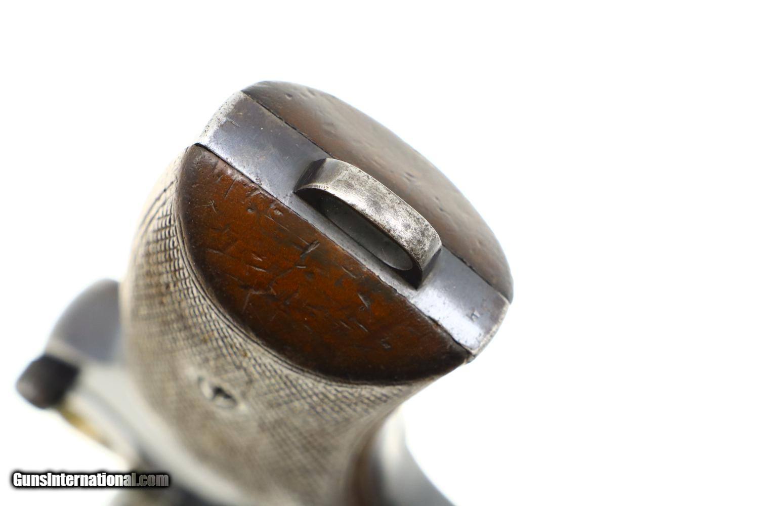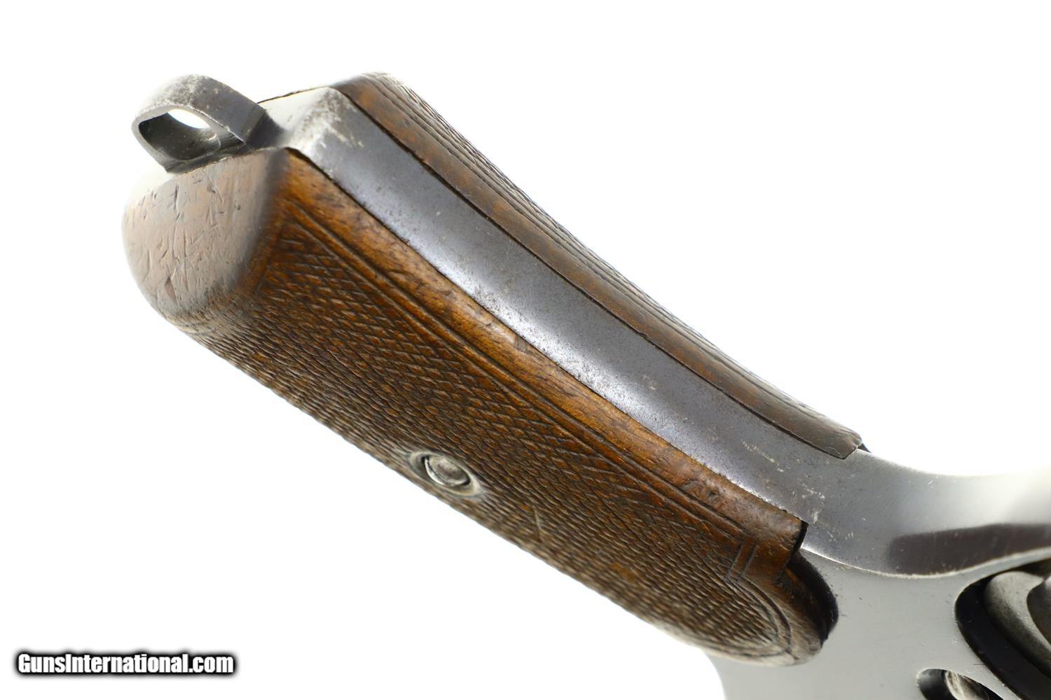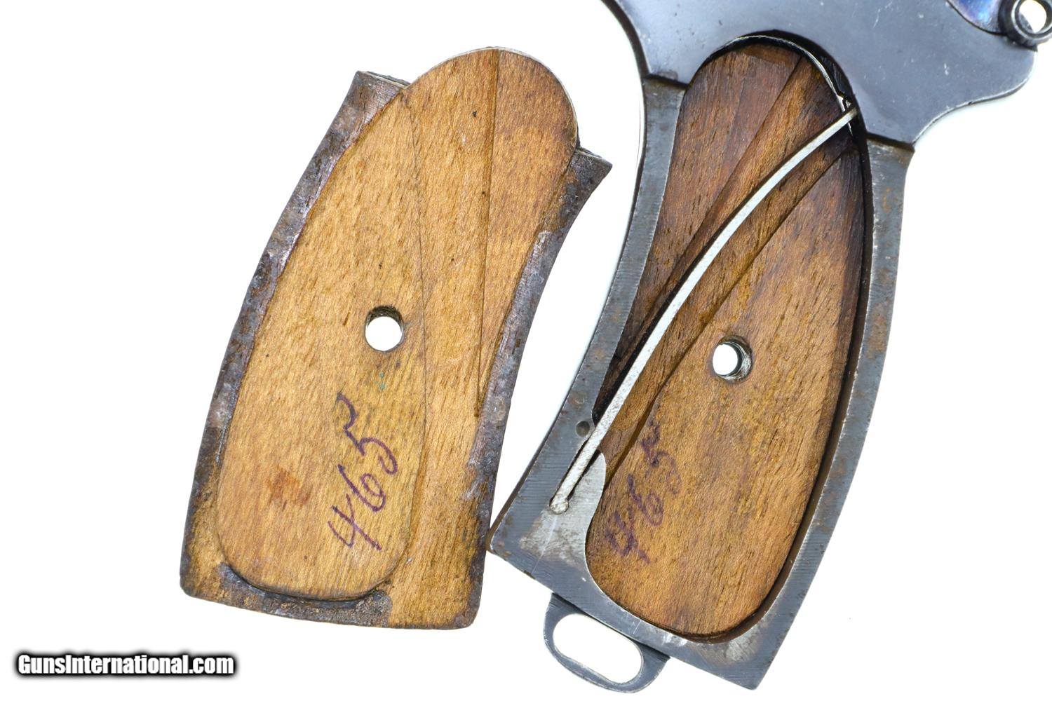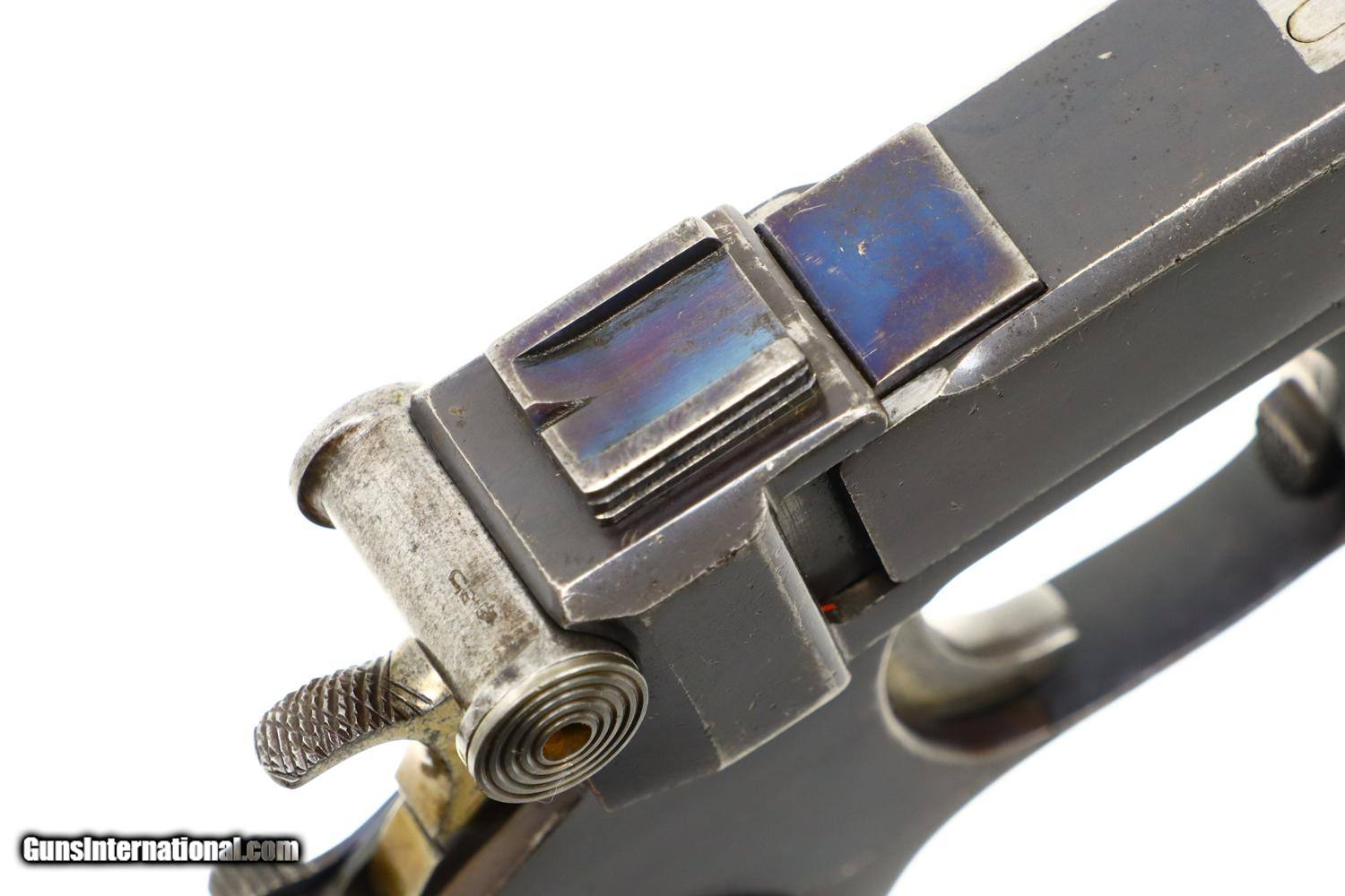 Description: Description: Standard configuration Bergmann 1903 with 4” barrel having fixed front and rear sights. Left side of barrel extension marked “CAL.9.” The locking block on top of slide is unmarked. Crown/Crown/U on barrel, barrel extension and left side of trigger guard. Serial number under barrel. Walnut checkered grips with fine border, matched with inked numbers, secured with single screw. Matching magazine. Synopsis: Bergmann Mars, 1903, Matching Magazine, 9mmBB, 465 Condition: VG+ original rust blue finish, with muzzle and sharp edge wear as one might expect from a lightly used pistol. . Comparable condition fire blue on locking block, rear sight and safety lever. Same holds true for the straw on hammer and trigger. Sides of magazine burnished for better fit in housing. Original grips, oil darkened, with blunted checkering and scattered handling marks. No suggestion of enhancement. Bright Bore with sharp rifling. Perfect manual mechanics. A very nice Bergmann M1903, especially with a matching magazine, a real find for those interested in early developmental pistols! SOLD Manufacturer: Bergmann Model: 1903 Serial Number: 465 Caliber Info: 9mmBB Condition: VG |