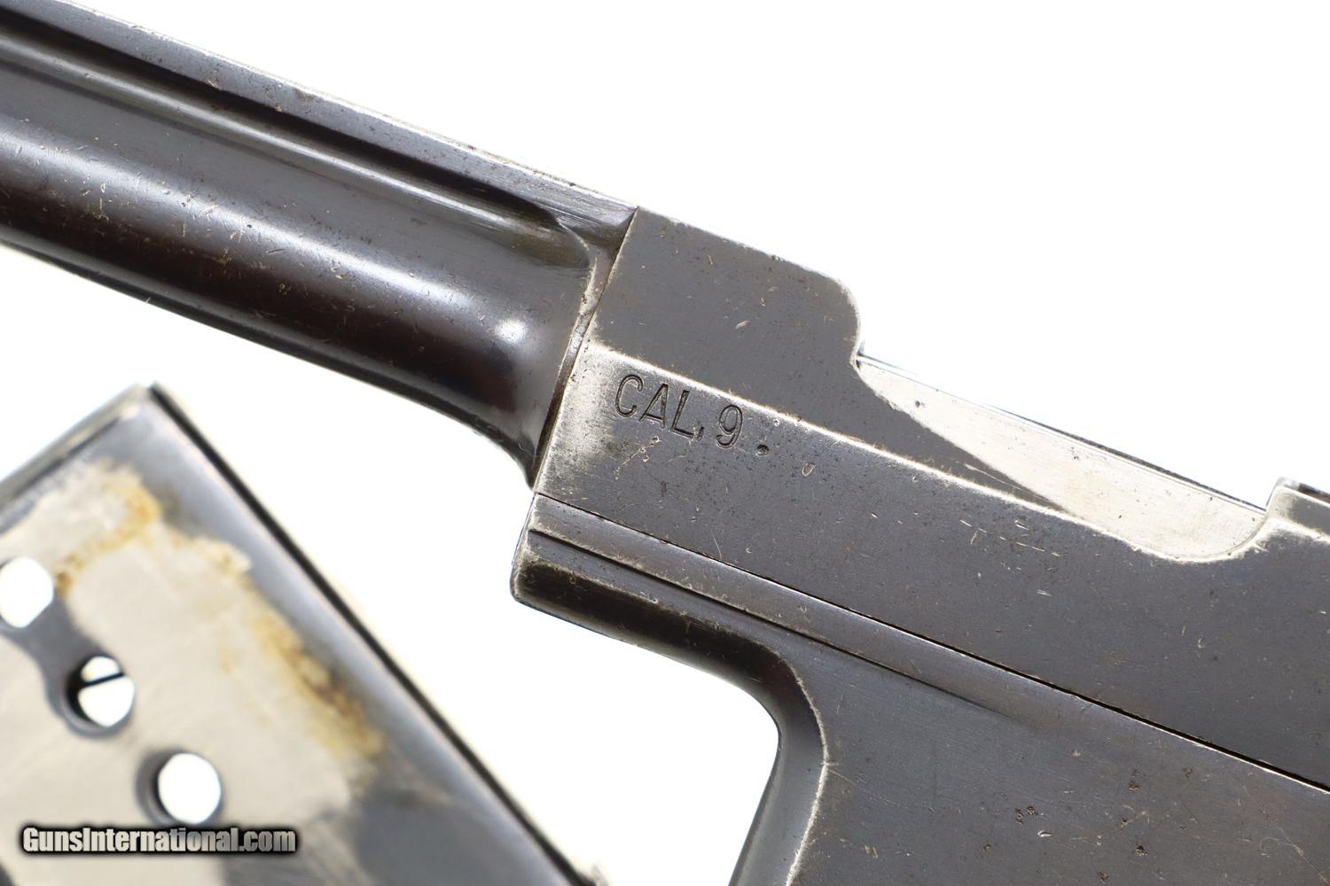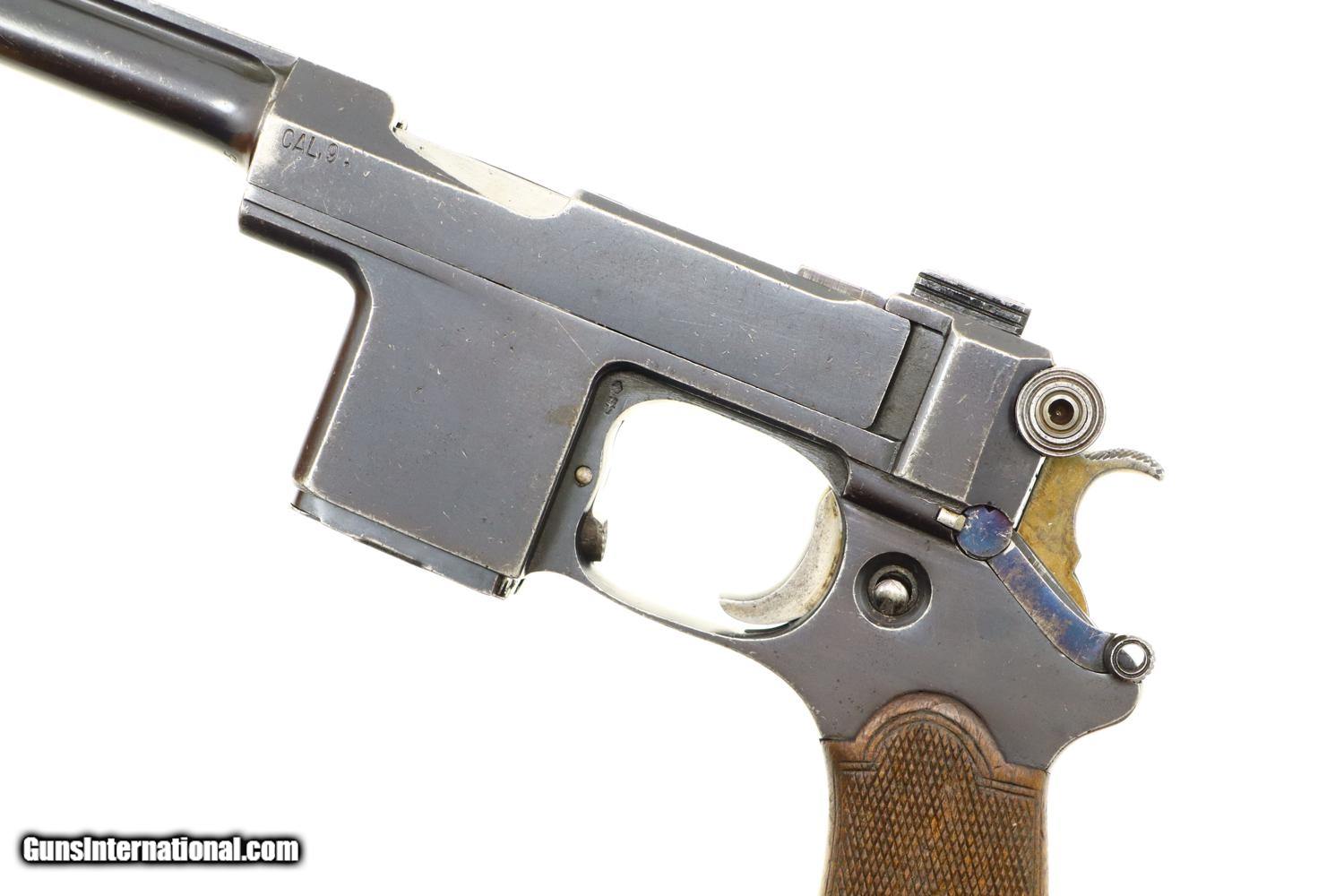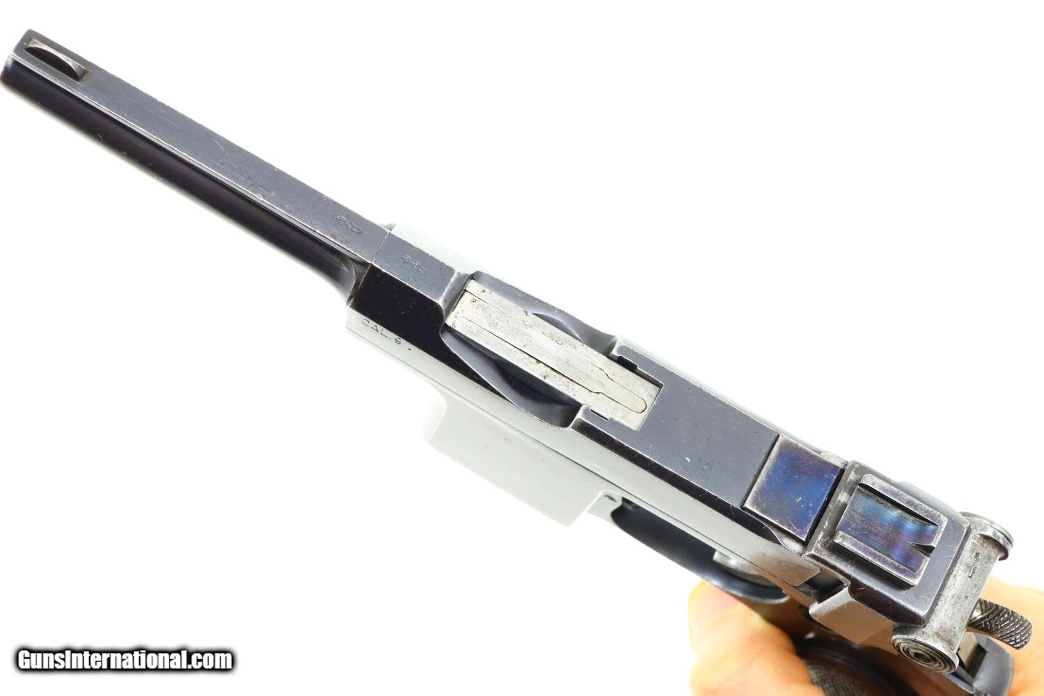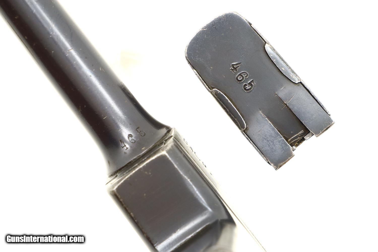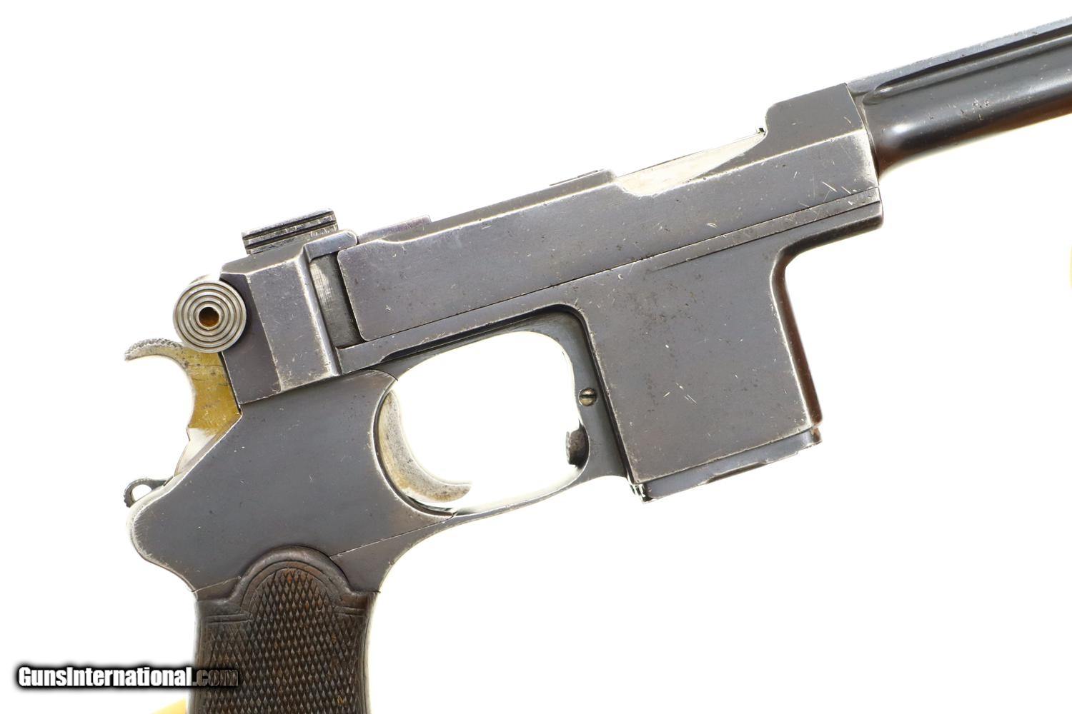Description: Description: Standard configuration Bergmann 1903 with 4” barrel having fixed front and rear sights. Left side of barrel extension marked “CAL.9.” The locking block on top of slide is unmarked. Crown/Crown/U on barrel, barrel extension and left side of trigger guard. Serial number under barrel. Walnut checkered grips with fine border, matched with inked numbers, secured with single screw. Matching magazine. Synopsis: Bergmann Mars, 1903, Matching Magazine, 9mmBB, 465 Condition: VG+ original rust blue finish, with muzzle and sharp edge wear as one might expect from a lightly used pistol. . Comparable condition fire blue on locking block, rear sight and safety lever. Same holds true for the straw on hammer and trigger. Sides of magazine burnished for better fit in housing. Original grips, oil darkened, with blunted checkering and scattered handling marks. No suggestion of enhancement. Bright Bore with sharp rifling. Perfect manual mechanics. A very nice Bergmann M1903, especially with a matching magazine, a real find for those interested in early developmental pistols! SOLD Manufacturer: Bergmann Model: 1903 Serial Number: 465 Caliber Info: 9mmBB Condition: VG |