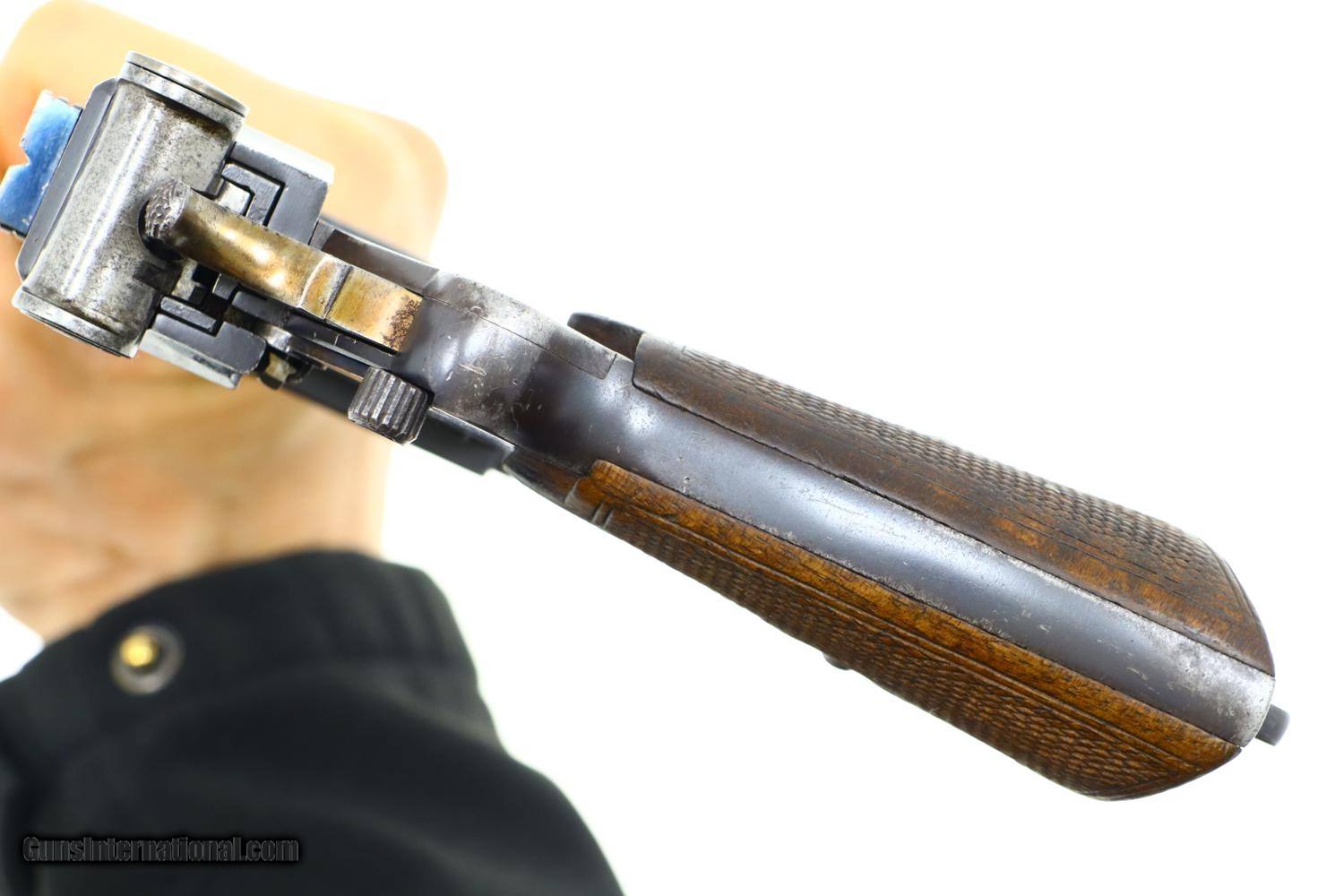 VG+ original rust blue finish, with muzzle and sharp edge wear as one might expect from a lightly used pistol. . Comparable condition fire blue on locking block, rear sight and safety lever. Same holds true for the straw on hammer and trigger. Sides of magazine burnished for better fit in housing. Original grips, oil darkened, with blunted checkering and scattered handling marks. No suggestion of enhancement. Bright Bore with sharp rifling. Perfect manual mechanics. A very nice Bergmann M1903, especially with a matching magazine, a real find for those interested in early developmental pistols!