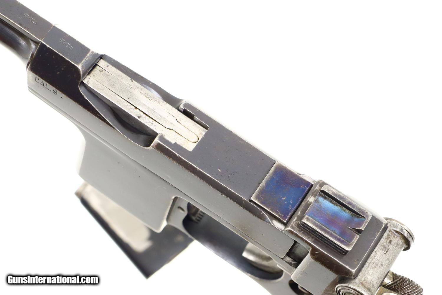 Standard configuration Bergmann 1903 with 4” barrel having fixed front and rear sights. Left side of barrel extension marked “CAL.9.” The locking block on top of slide is unmarked. Crown/Crown/U on barrel, barrel extension and left side of trigger guard. Serial number under barrel. Walnut checkered grips with fine border, matched with inked numbers, secured with single screw. Matching magazine.