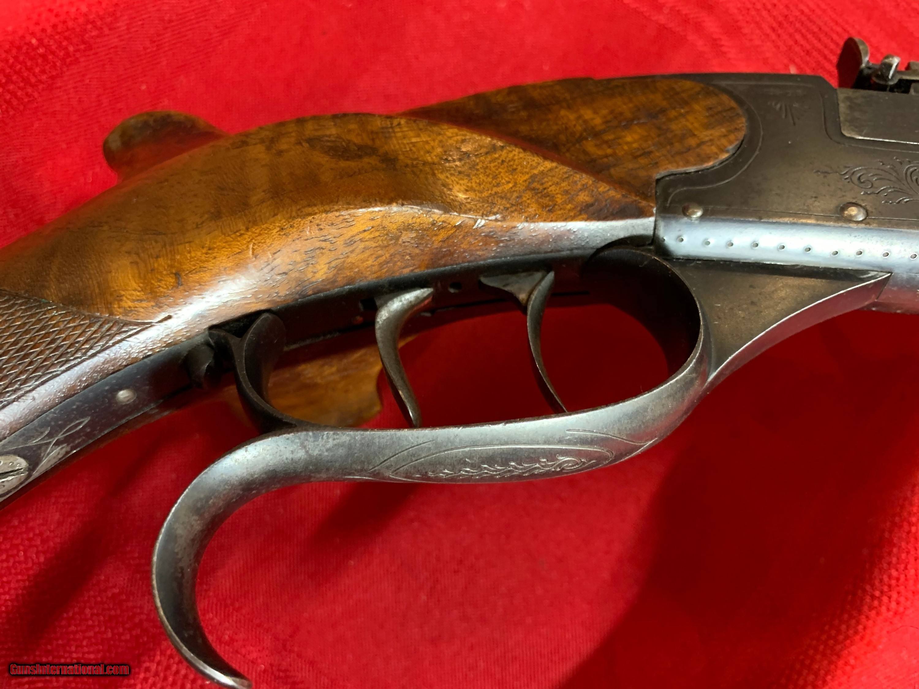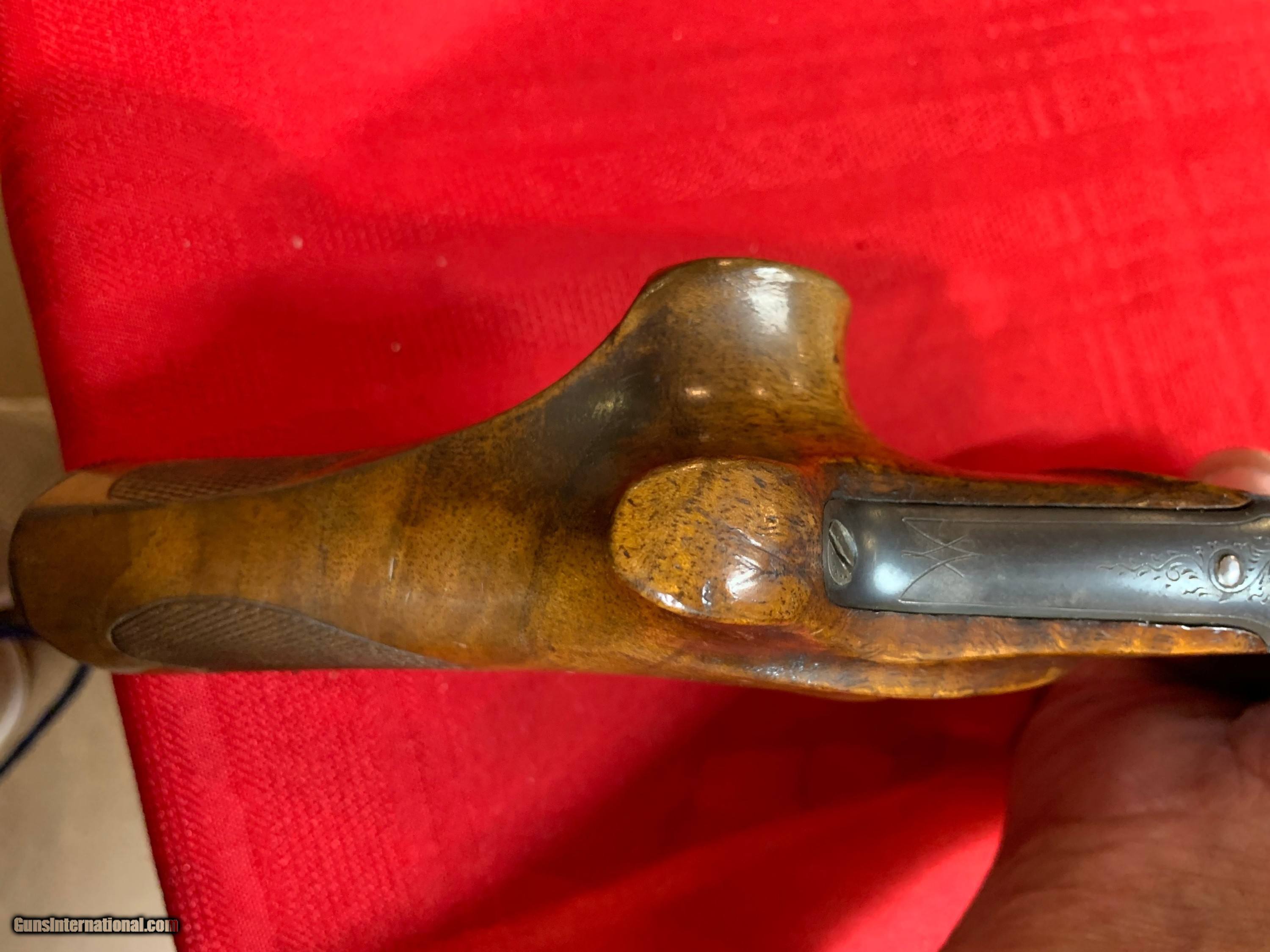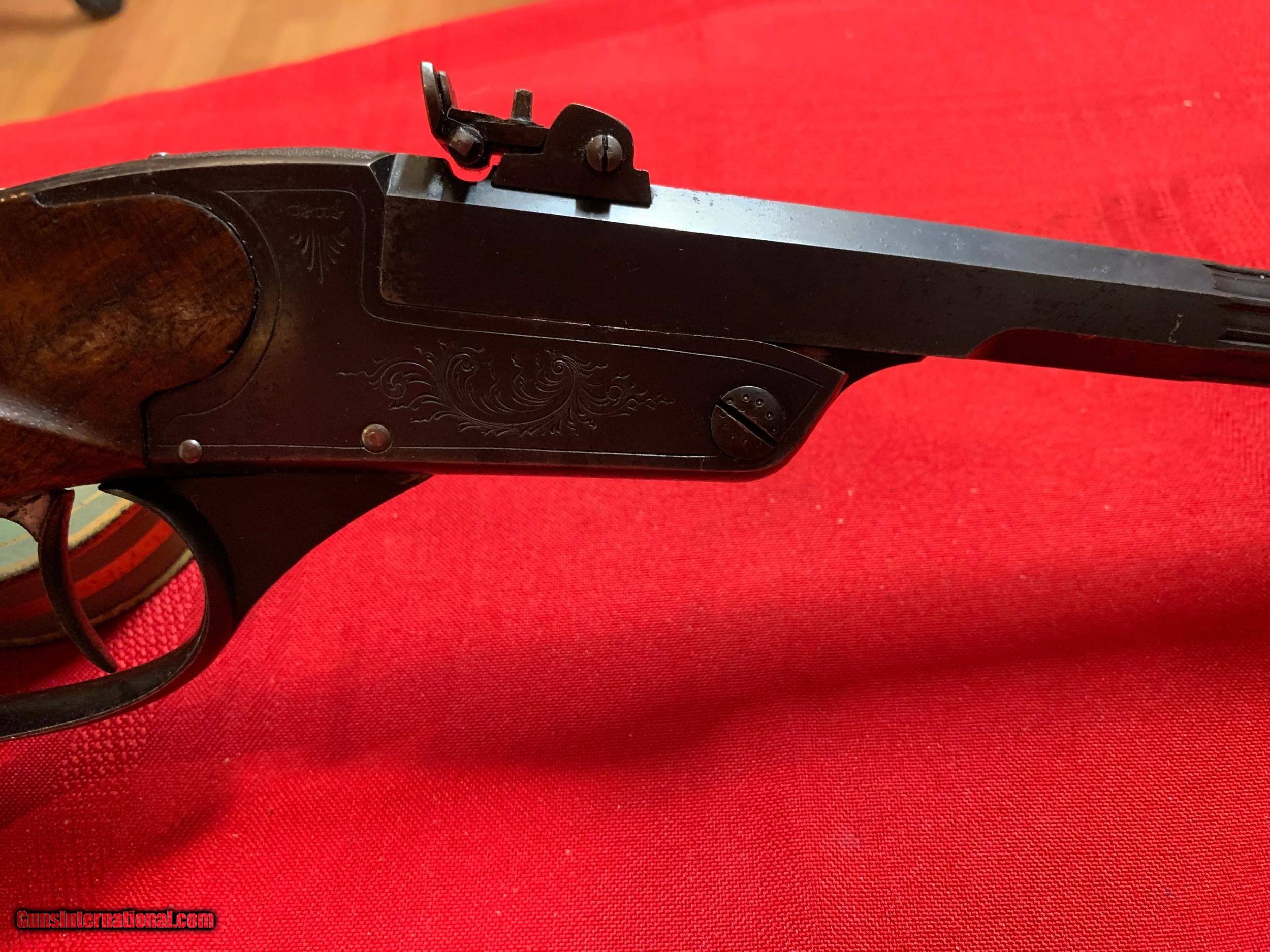 Description: Eleven inch barreled German target pistol. Marked" 22 L" and 5.2mm. Fluted barrel with highly adjustable sights. Both front and rear adjustable for windage and elevation. Nicely checkered stock with thumb rest. Metal with stippling and some engraving. Good bore.Double set triggers. Metal grip cap. SOLD Curio/Relic: Yes |