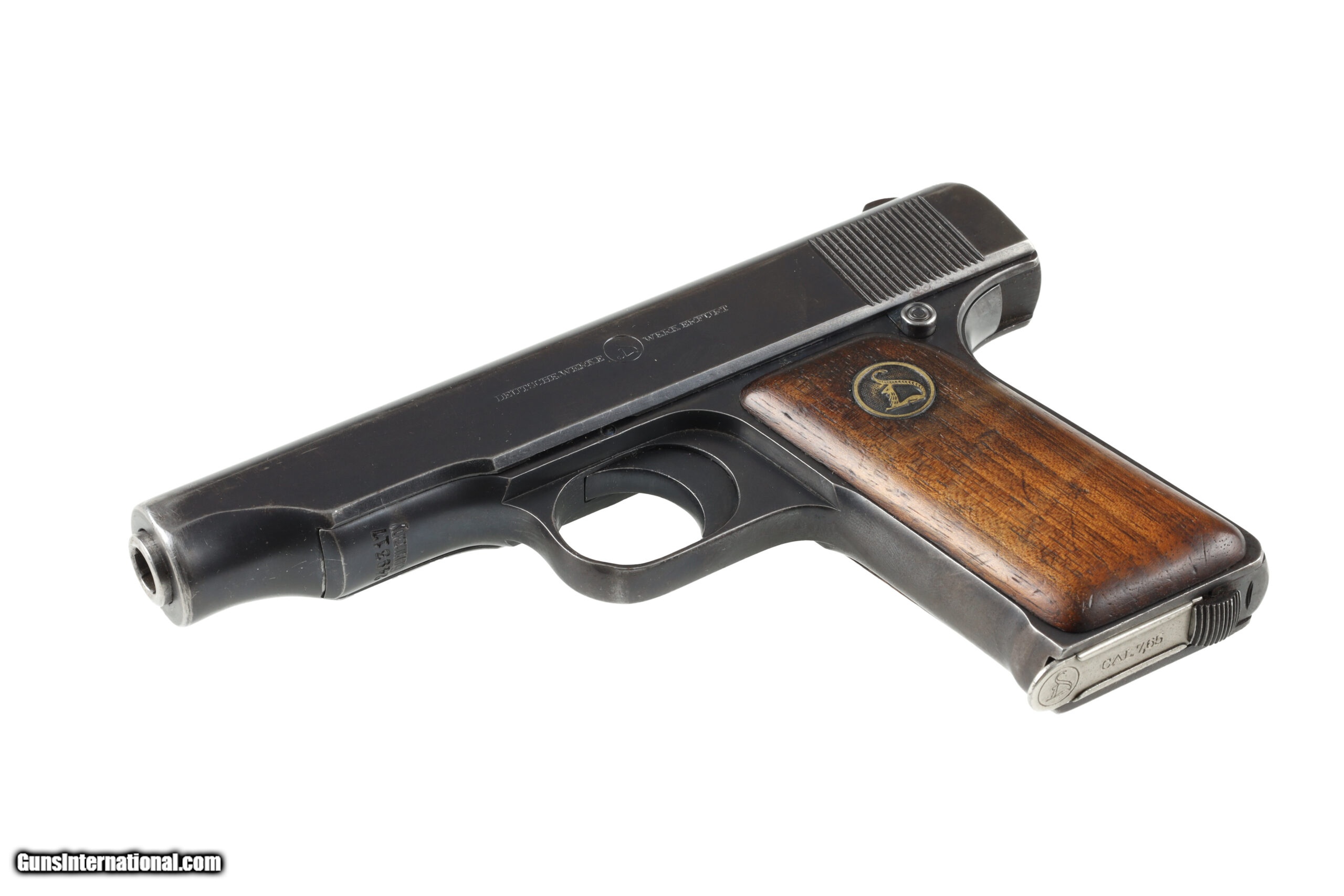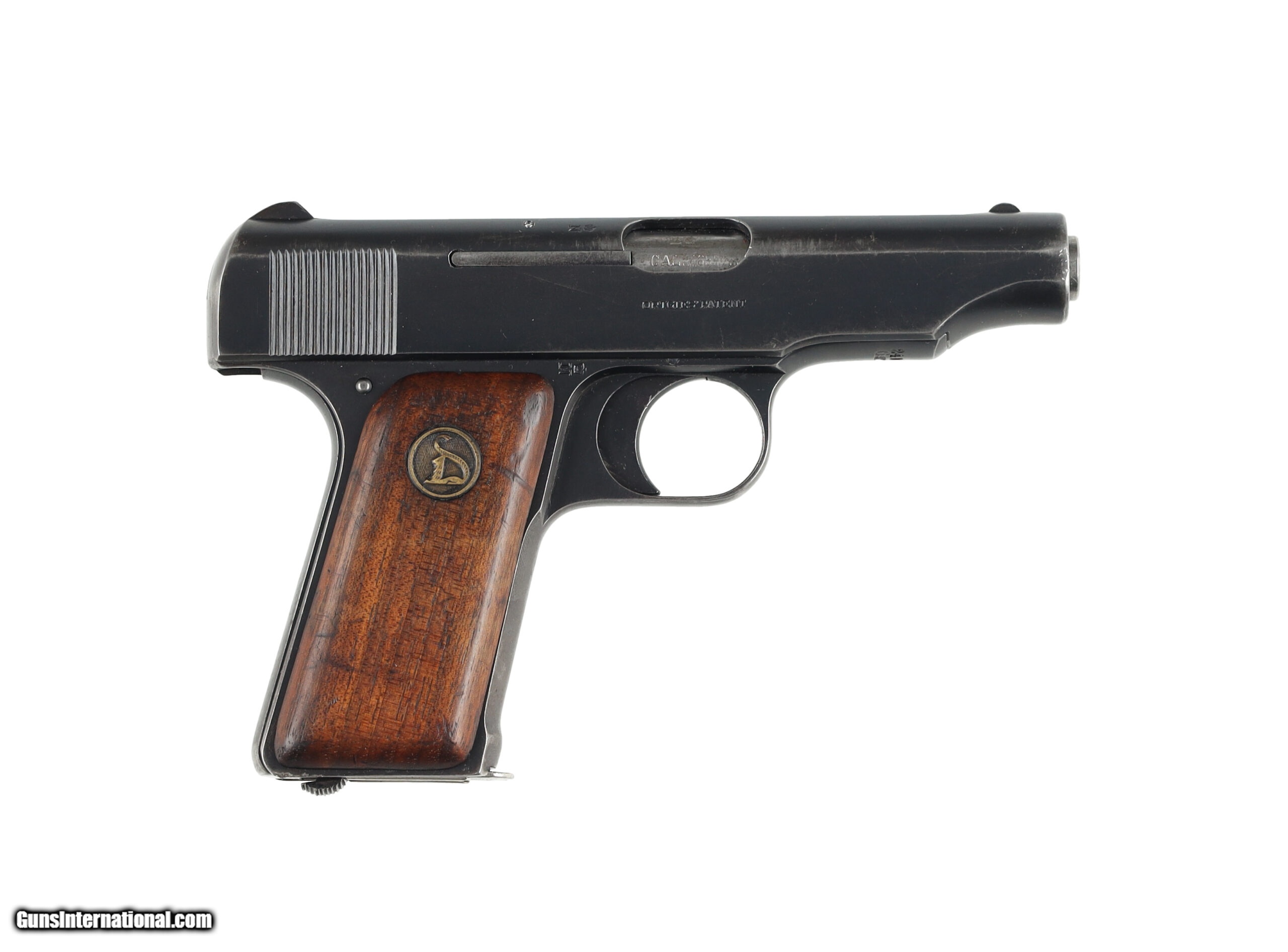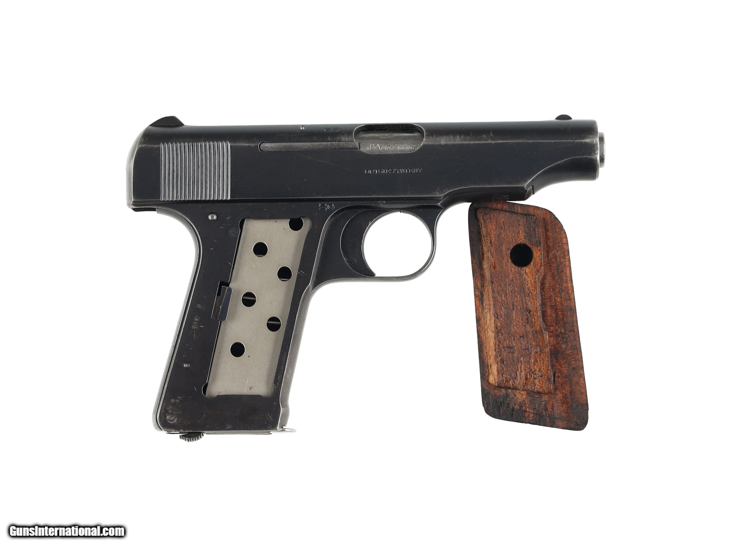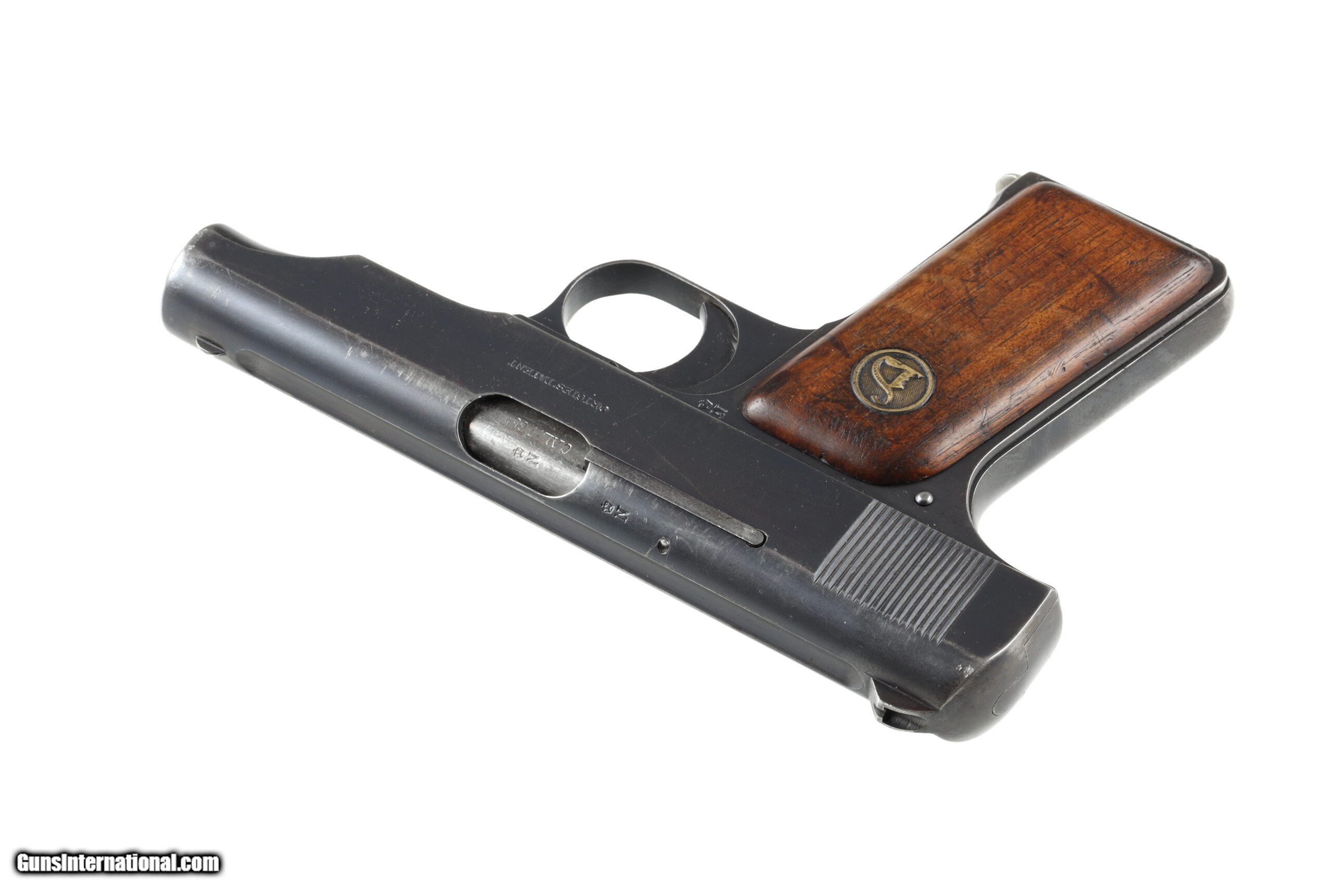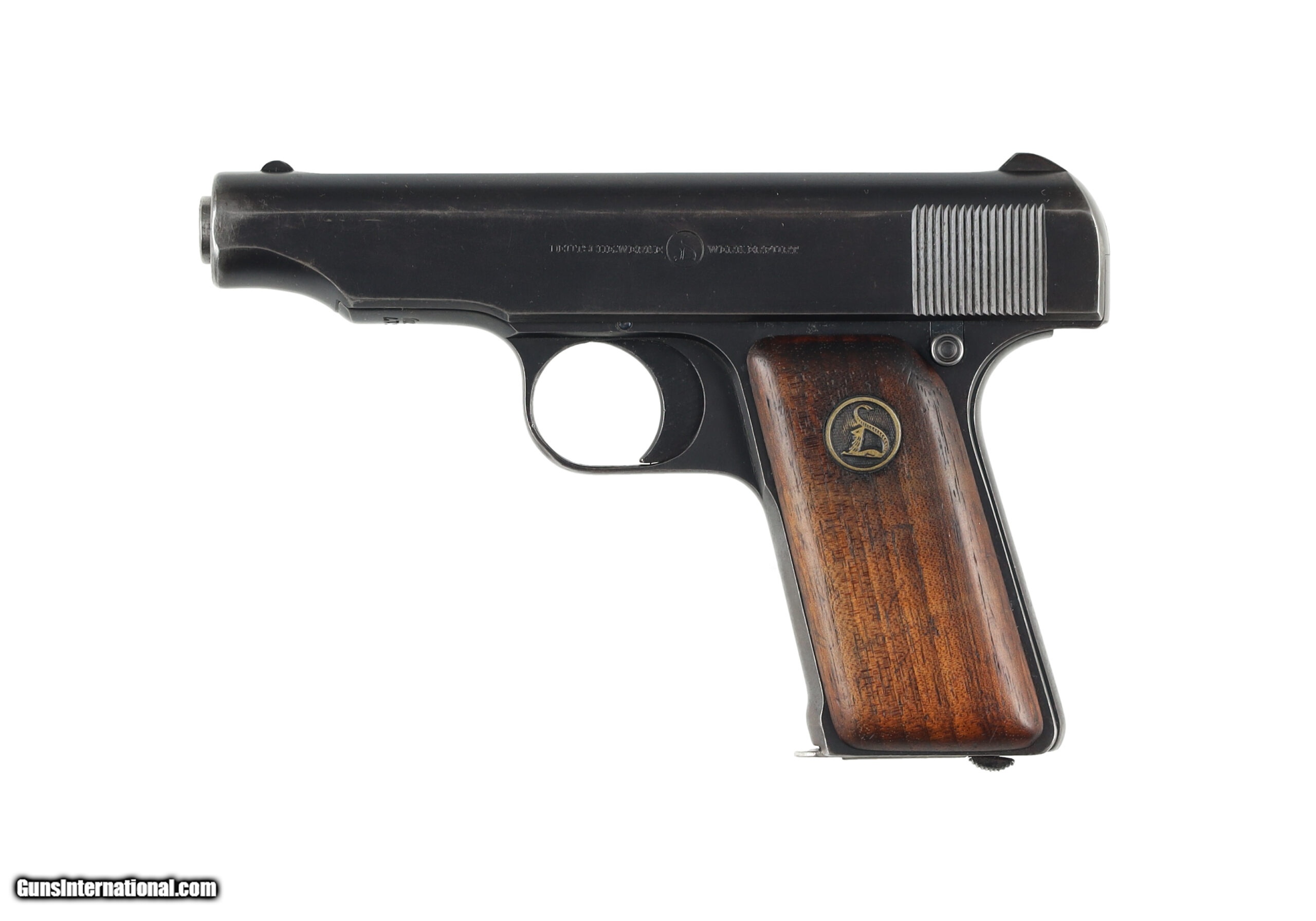 Description: The Deutsche Werke Ortgies' pistol, was a finely crafted pistol developed in 1916 and was produced between 1919 and 1923. This pistol was the preferred pistol by several German police forces such as the Hamberg police force, the Water Police and the Reich Finance Administration. This example is in very good condition with only minor wear, the only flaw present is that the eight grip panel is no longer retained by the internal clip. Manufactured in: Germany Hand: Right Hand Action Finish: Blue Metal Finish: Original Barrel Length: 3.35 Inches Barrel Condition: Very Good Stock Finish: Original Stock Condition: Cracked Grip: Pistol SOLD Curio/Relic: Yes Manufacturer: Deutsche Werke Model: Ortgies Caliber Info: 7.65 - .32 AUTO Condition: Preowned Metal Condition: Very Good Action: Semi Automatic Triggers: Single Finish: Original Weight: 1.4 lbs Case: NONE |