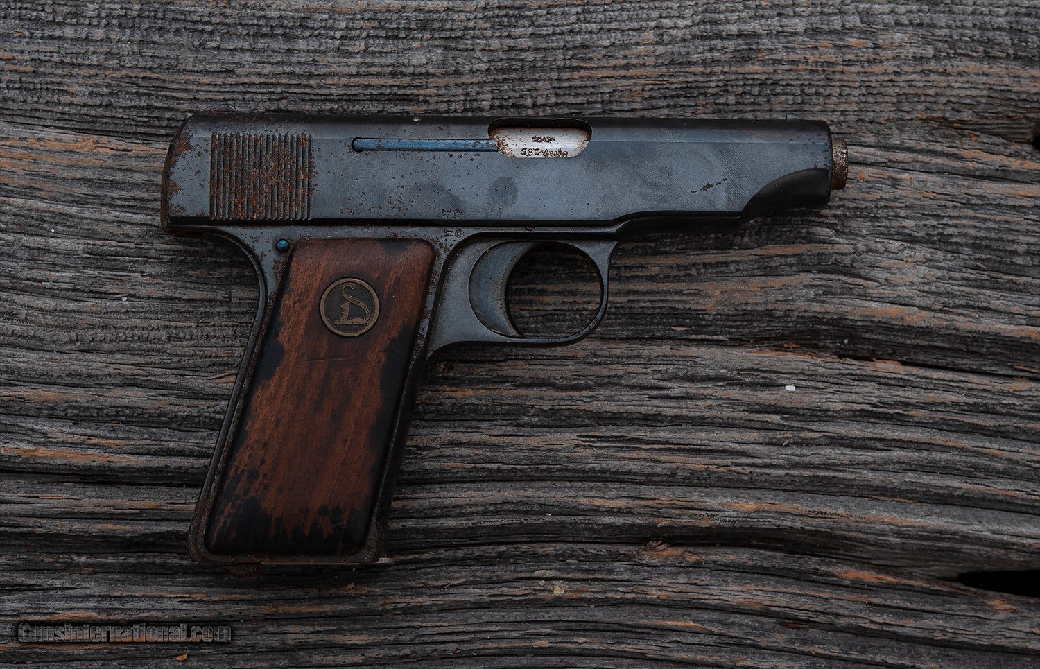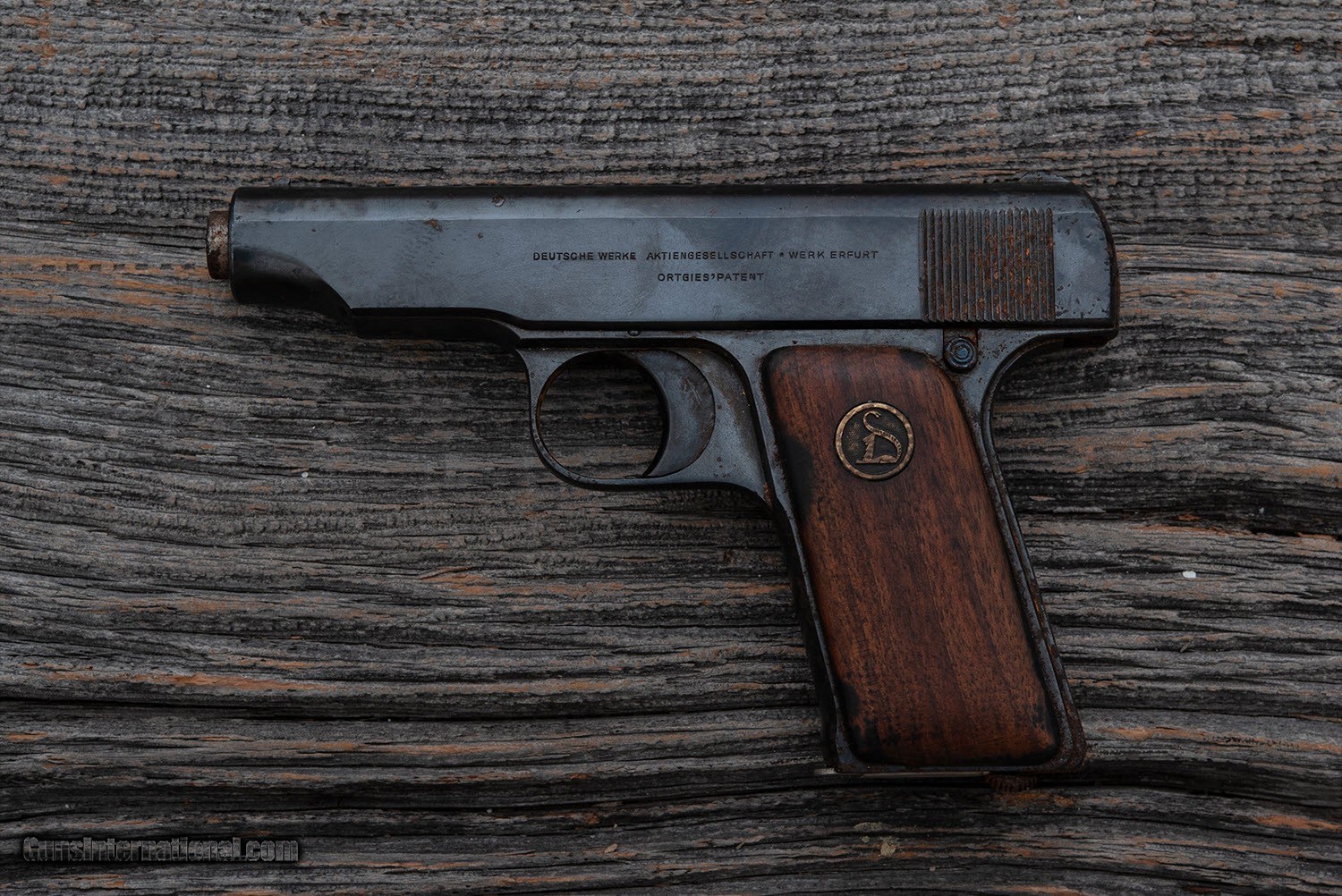 Description: Deutsche Werke - Ortgies - .380 - Item Number: ERF62761 Barrel length: 3 Finish: Blue Lop: NA Lbs: |/23| Ozs: 8 Overall condition: Fair Stock condition: Fair Metal condition: Fair Stock:Original Metal:Original Type of Case: none Manufactured in: Germany Comments: Some rust on the slide and in the bore. Two mags. HG-30 SOLD |