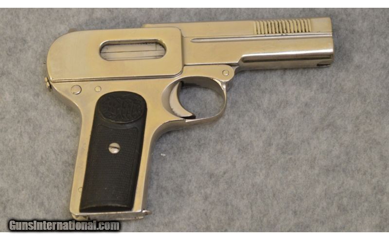 Description: This is a semi-automatic Dreyse Model 1907 pistol chambered in 7.65/.32 ACP. It has a 3.5" stainless barrel, with a blade front sight and rear open sight. The pistol grips are black composite, with the initials RMF, and are in good condition, with some chipping on the left side. The bore is crisp. This pistol comes with one magazine. SOLD Curio/Relic: Yes Caliber Info: 7.65/.32 ACP. Chambers: Semi-automatic. Metal Condition: Good, with wear throughout. Bore Condition: Crisp. Barrels: 3.5" Stainless barrel. Triggers: Single curved trigger. Stock: Black composite RMF pistol grips. Weight: 25 oz. Sights: Blade front sight and open rear sight. Extras: This pistol comes with one magazine. Item Location: Huntsville, AL |