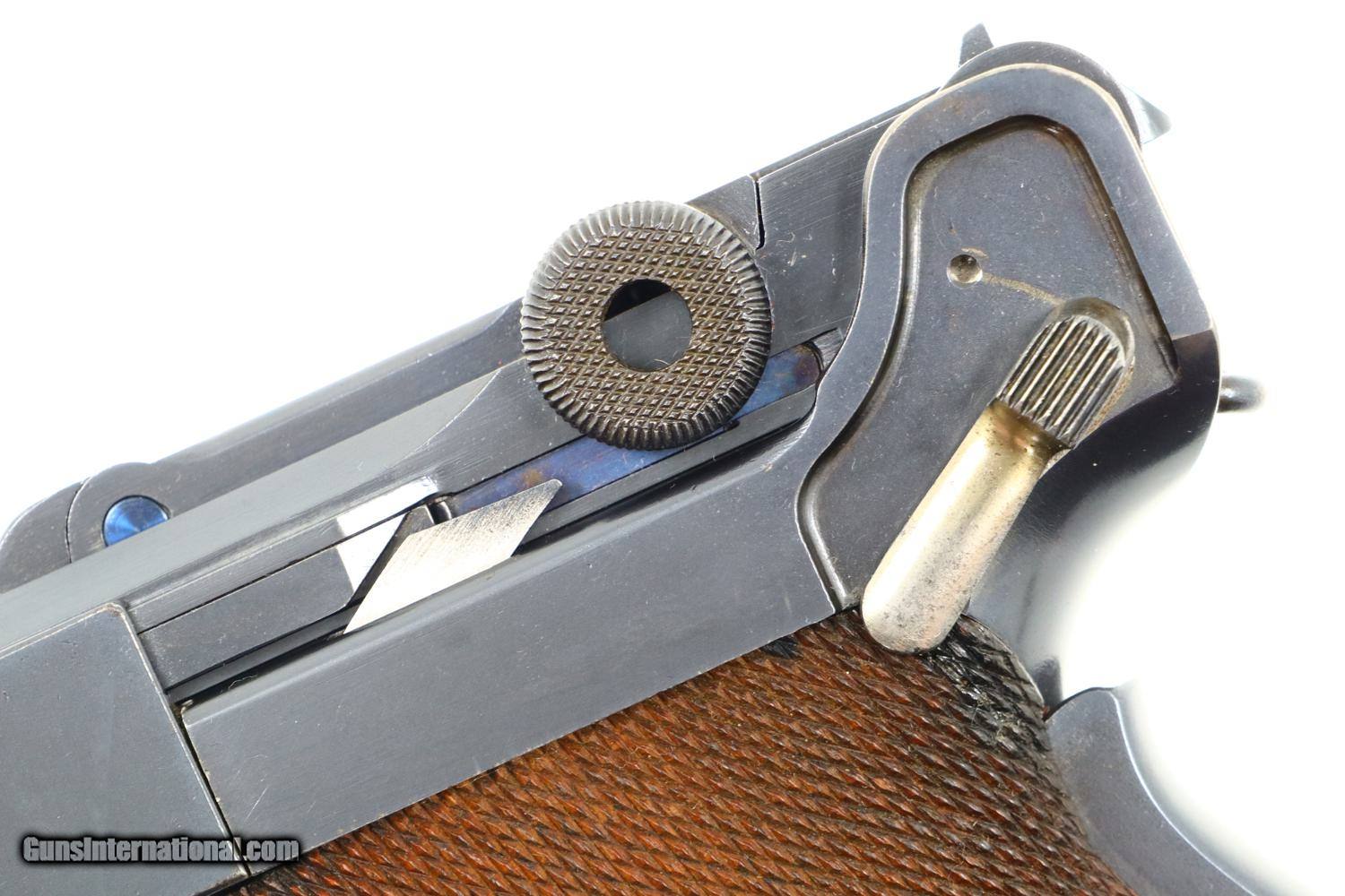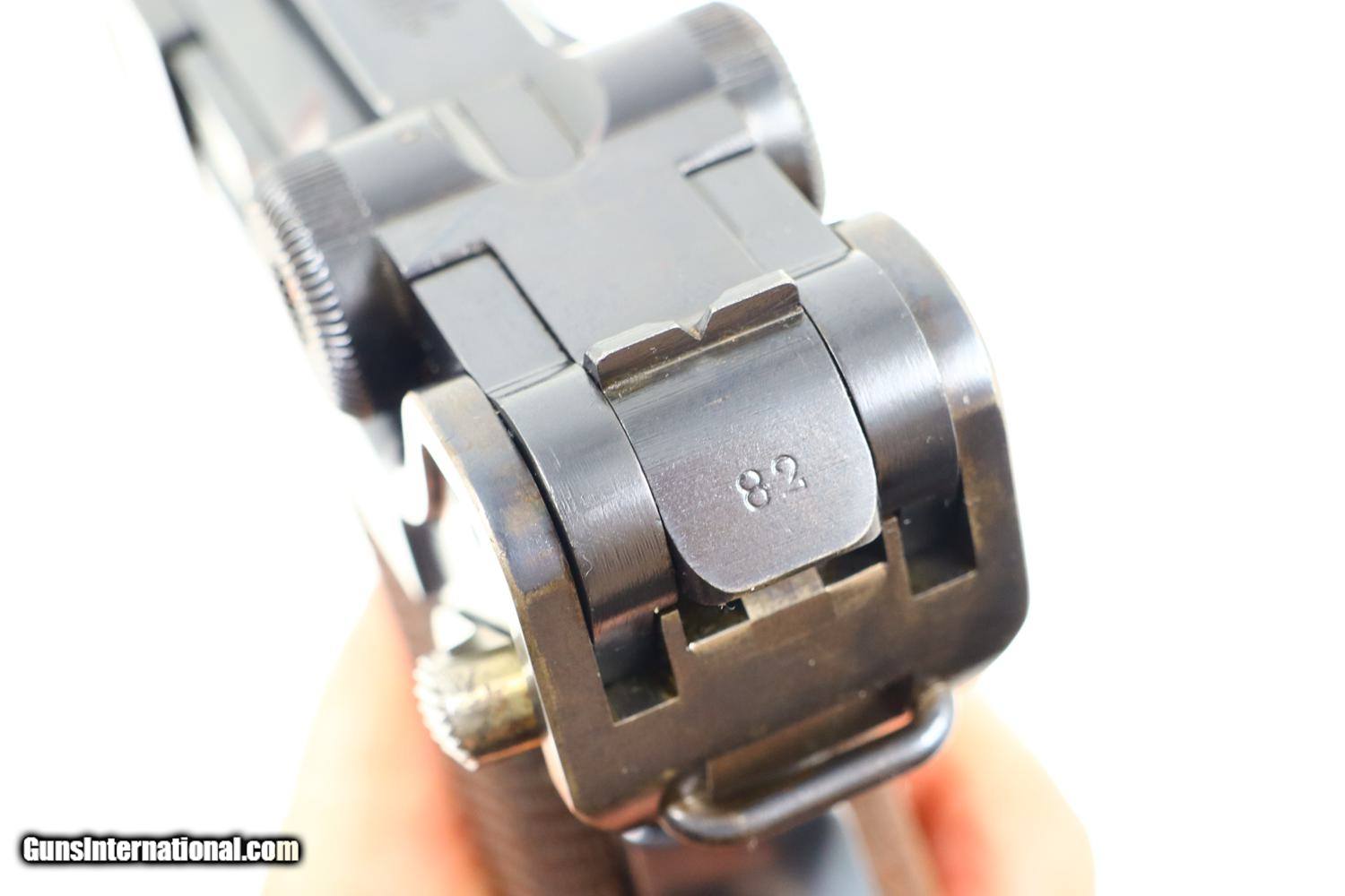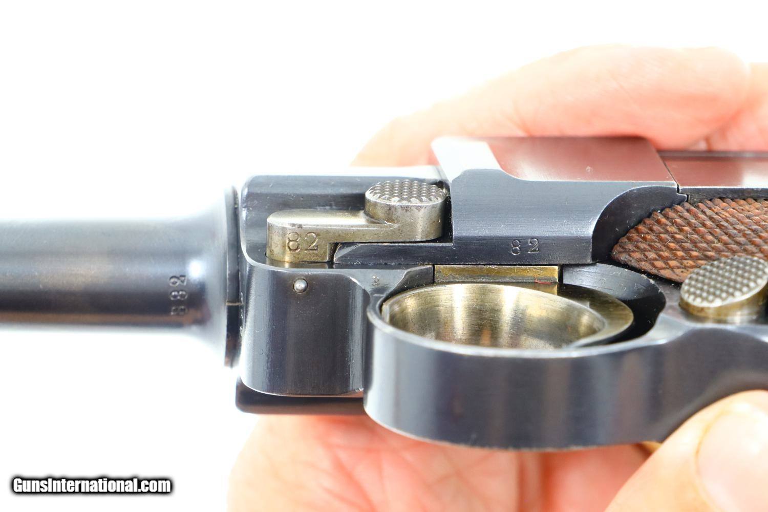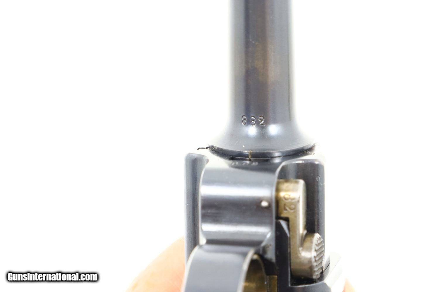 Description: Synopsis: Excellent DWM, 1906 Portuguese Contract Luger, 882, FB00781 Description: Standard configuration M1906 M2 Luger with 4.75” barrel with drift adjustable front sight and fixed "V" notch rear sight. Deeply impressed Crown/M2 over chamber and intertwined DWM on middle toggle link. Encircled triangle, the Portuguese proof on left side of receiver and magazine plug. Full serial number under barrel and forward frame with last two digits repeated on all appropriate parts. Unnumbered firing pin, hold open, and grips. Major components are rust blued; strawed parts include takedown lever, trigger, safety, extractor, and magazine release. Toggle pins and grip screws fire blued. Checkered walnut grips. Original magazine with bright body and wood base. Condition: Approximately 97% original blue with sharp edge wear in expected places. Strawed parts in comparable condition, no suggestion of touch up. The left grip panel has the usual small chip under the safety lever, glued back in place. Mirror bore with sharp rifling. Correct manual mechanics. A very attractive, no excuse 1906 Portuguese M2 Luger, suitable to grace any collection! ~~Insured shipping fee of $75; most packages shipped using FedEx 2nd Day.~~ SOLD Manufacturer: DWM Serial Number: 882 Caliber Info: .30 Luger |