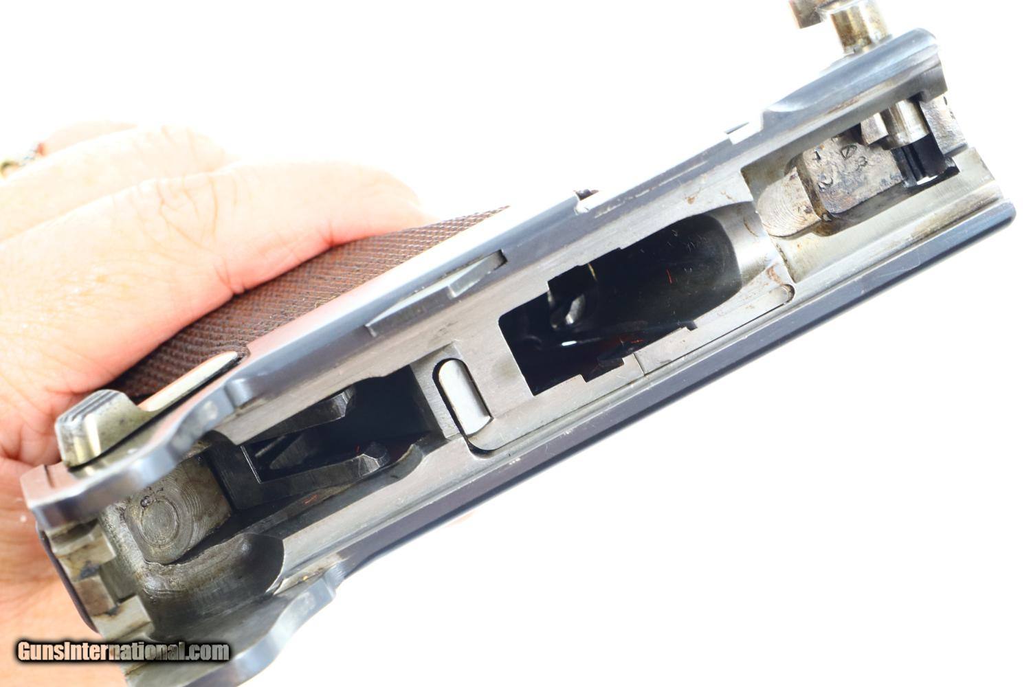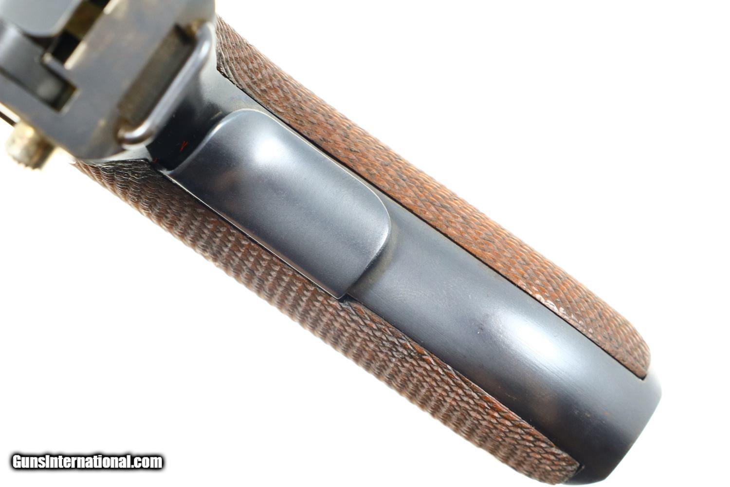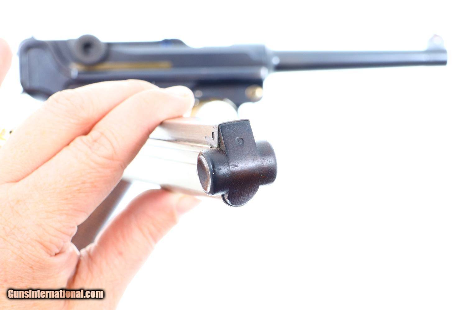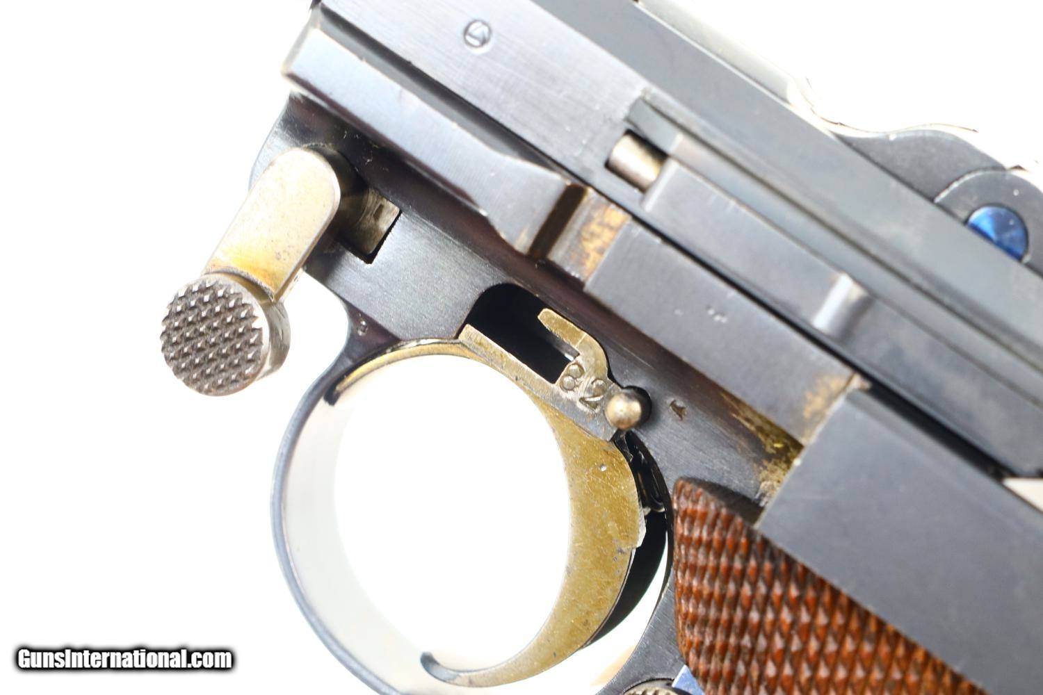 Description: Synopsis: Excellent DWM, 1906 Portuguese Contract Luger, 882, FB00781 Description: Standard configuration M1906 M2 Luger with 4.75” barrel with drift adjustable front sight and fixed "V" notch rear sight. Deeply impressed Crown/M2 over chamber and intertwined DWM on middle toggle link. Encircled triangle, the Portuguese proof on left side of receiver and magazine plug. Full serial number under barrel and forward frame with last two digits repeated on all appropriate parts. Unnumbered firing pin, hold open, and grips. Major components are rust blued; strawed parts include takedown lever, trigger, safety, extractor, and magazine release. Toggle pins and grip screws fire blued. Checkered walnut grips. Original magazine with bright body and wood base. Condition: Approximately 97% original blue with sharp edge wear in expected places. Strawed parts in comparable condition, no suggestion of touch up. The left grip panel has the usual small chip under the safety lever, glued back in place. Mirror bore with sharp rifling. Correct manual mechanics. A very attractive, no excuse 1906 Portuguese M2 Luger, suitable to grace any collection! ~~Insured shipping fee of $75; most packages shipped using FedEx 2nd Day.~~ SOLD Manufacturer: DWM Serial Number: 882 Caliber Info: .30 Luger |