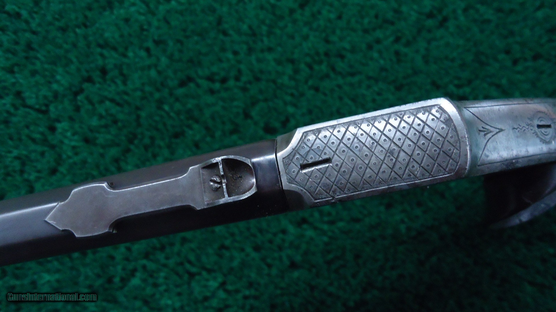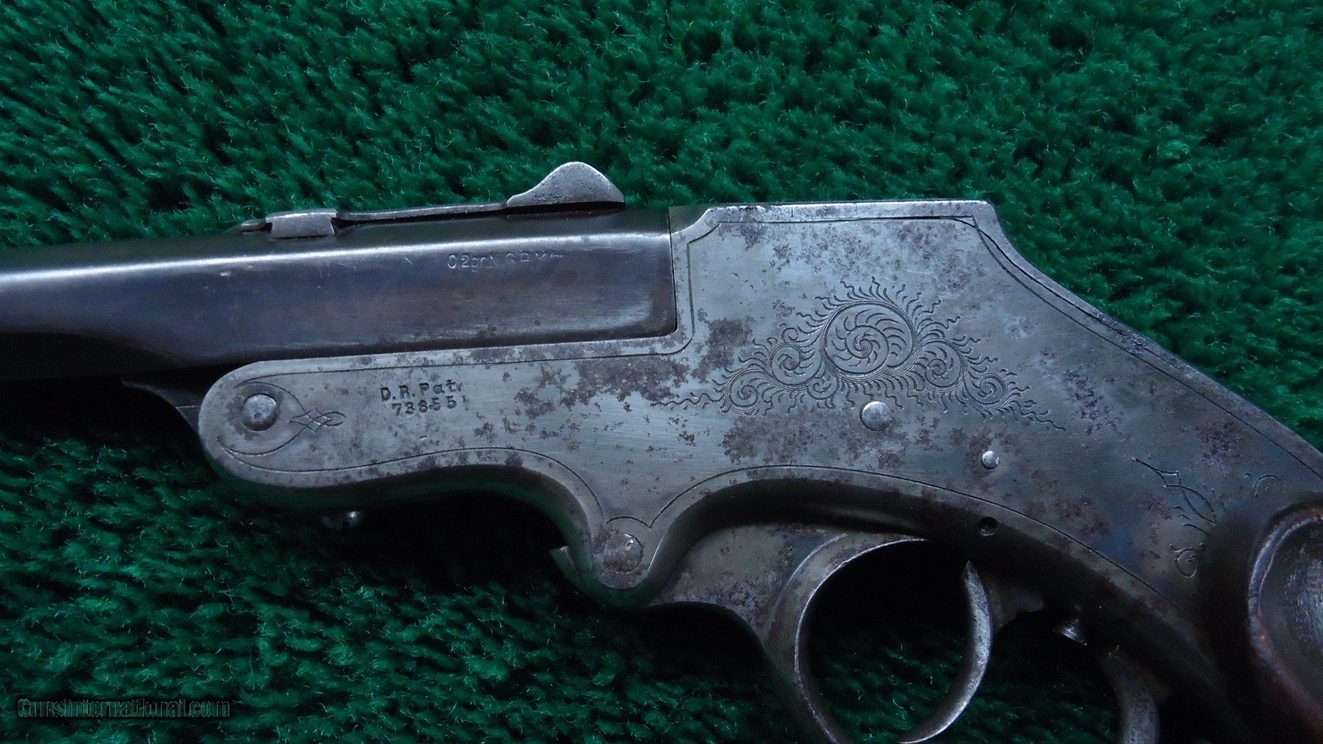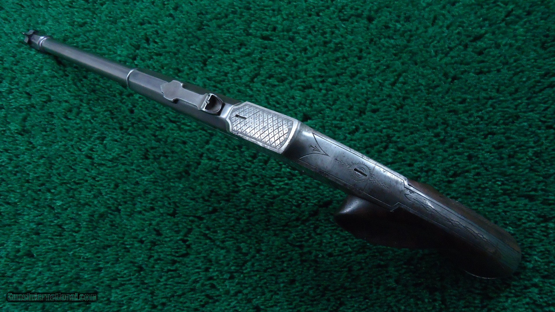 Description: Barrel measures 27 cm (10-11/16 inches) and has a bright bore. A pleasing brown patina overall. Sights are dovetail mounted with elevation adjustable rear. Lever style trigger guard opens the action. Dual set triggers are functional. 2 piece walnut pistol grip panels are checkered showing use and handling marks with left having a thumb rest. The engraved frame and trigger guard show over 40% case colors with areas of very light freckling and just a few small areas of light pitting. Leroy Merz Antique Firearms specializes in antique and vintage Winchesters and other fine American firearms. Since 1965 Mr. Merz has taken part in the world of firearms and has been a contributor to many well known reference books. We have hundreds of additional guns in every price range at our home online. Search for Merz Antiques in google. SOLD Curio/Relic: Yes Handgun Caliber: .22 Short |