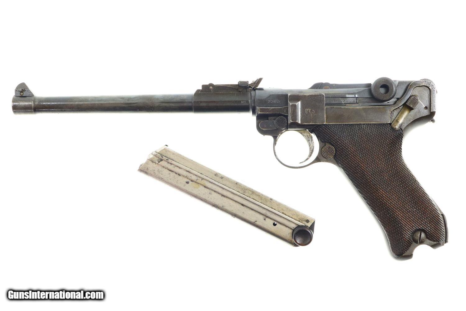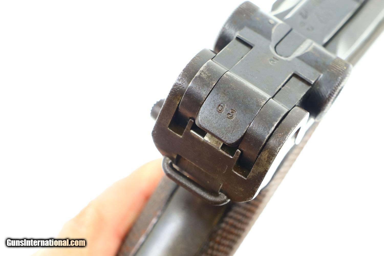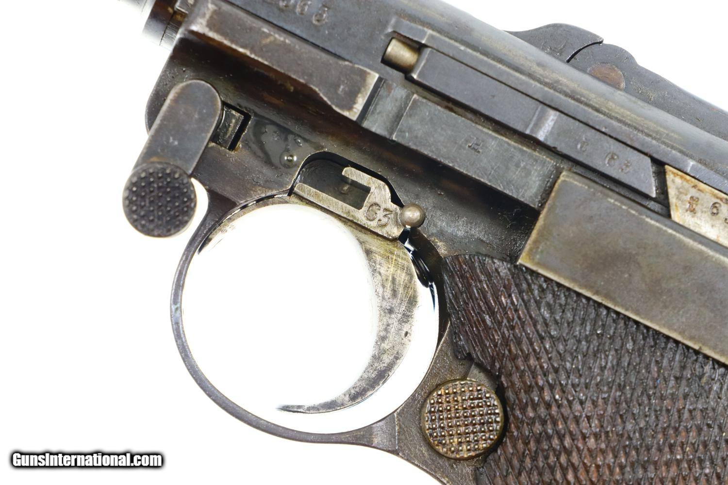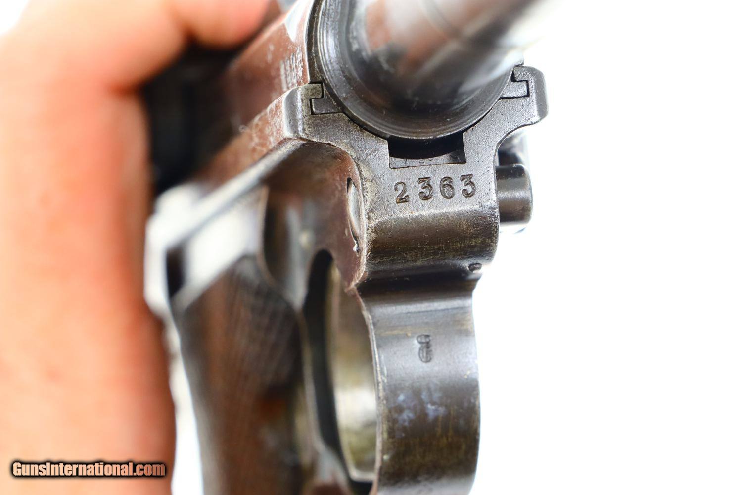 Description: Synopsis: Scarce Erfurt, 1914, German Artillery Luger, 2363, FB00765 Description: Standard configuration and all matching Erfurt Artillery Luger from WWI, caliber 9mmP, made 1914, with fine tune front and rear sight, the rear sight with the usual 1-8 stops for cursor elevation. Chamber dated 1914 with Erfurt on front toogle link. Usual proofs on right side of barrel extention. Full serial number on forward frame, under barrel, and left side of barrel extention. Last two digits on all usual small parts including the grips. Magazine plug with larger numberals, as struck the earliest military pistols, digits not discernable. Condition: Generously "G" orginal blue with considerable toning throughout as carefully photographed. Same consideration applies to the strawed small parts that show no evidence of enhancement. Dark grips with slightly blunted checkering, but no splits or significant losses. G magazine with numeration on plug not discernable. Bright bore, sharp rifling. Correct manual mechanics. The earliest of the standard artillery lugers from WWI and the only year in which the Artilleries were made by Erfurt. ~~Insured shipping fee of $65; most packages shipped using FedEx 2nd Day.~~ SOLD Manufacturer: Erfurt Serial Number: 2363 Caliber Info: 9mmP |