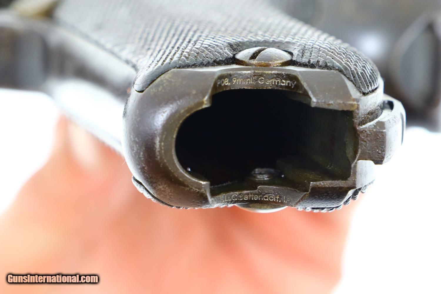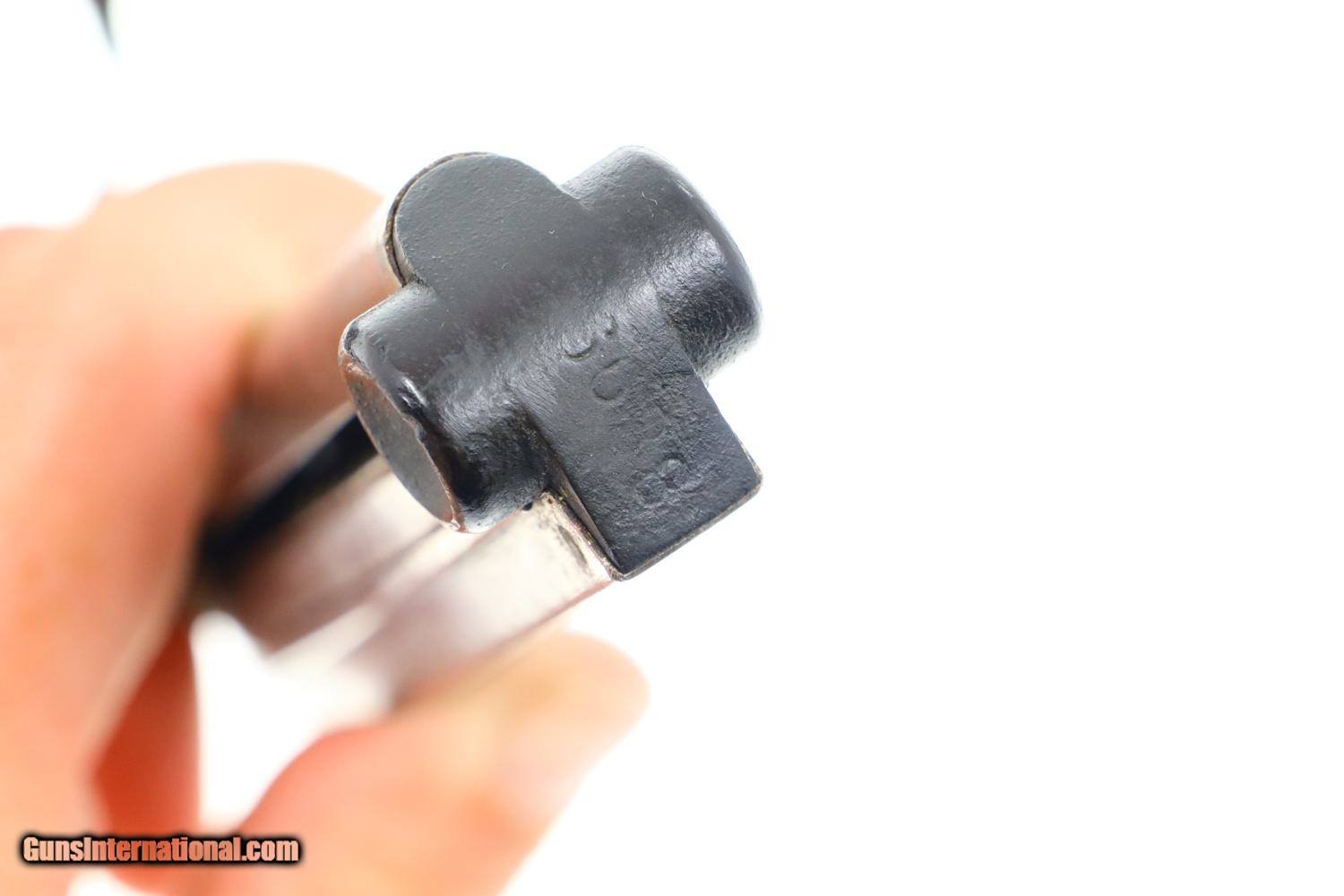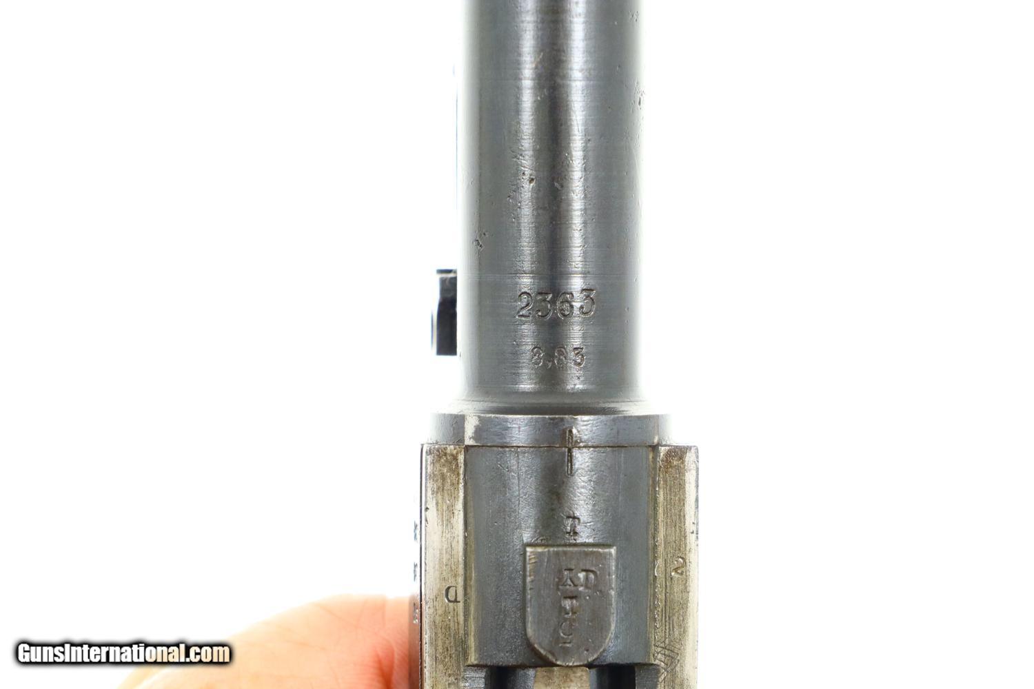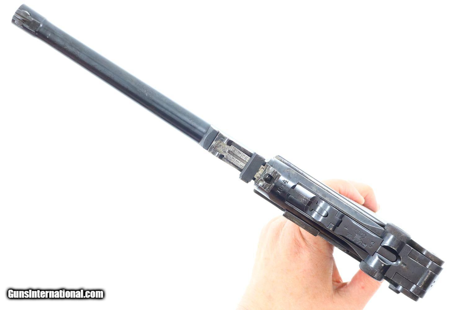 Description: Synopsis: Scarce Erfurt, 1914, German Artillery Luger, 2363, FB00765 Description: Standard configuration and all matching Erfurt Artillery Luger from WWI, caliber 9mmP, made 1914, with fine tune front and rear sight, the rear sight with the usual 1-8 stops for cursor elevation. Chamber dated 1914 with Erfurt on front toogle link. Usual proofs on right side of barrel extention. Full serial number on forward frame, under barrel, and left side of barrel extention. Last two digits on all usual small parts including the grips. Magazine plug with larger numberals, as struck the earliest military pistols, digits not discernable. Condition: Generously "G" orginal blue with considerable toning throughout as carefully photographed. Same consideration applies to the strawed small parts that show no evidence of enhancement. Dark grips with slightly blunted checkering, but no splits or significant losses. G magazine with numeration on plug not discernable. Bright bore, sharp rifling. Correct manual mechanics. The earliest of the standard artillery lugers from WWI and the only year in which the Artilleries were made by Erfurt. ~~Insured shipping fee of $65; most packages shipped using FedEx 2nd Day.~~ SOLD Manufacturer: Erfurt Serial Number: 2363 Caliber Info: 9mmP |