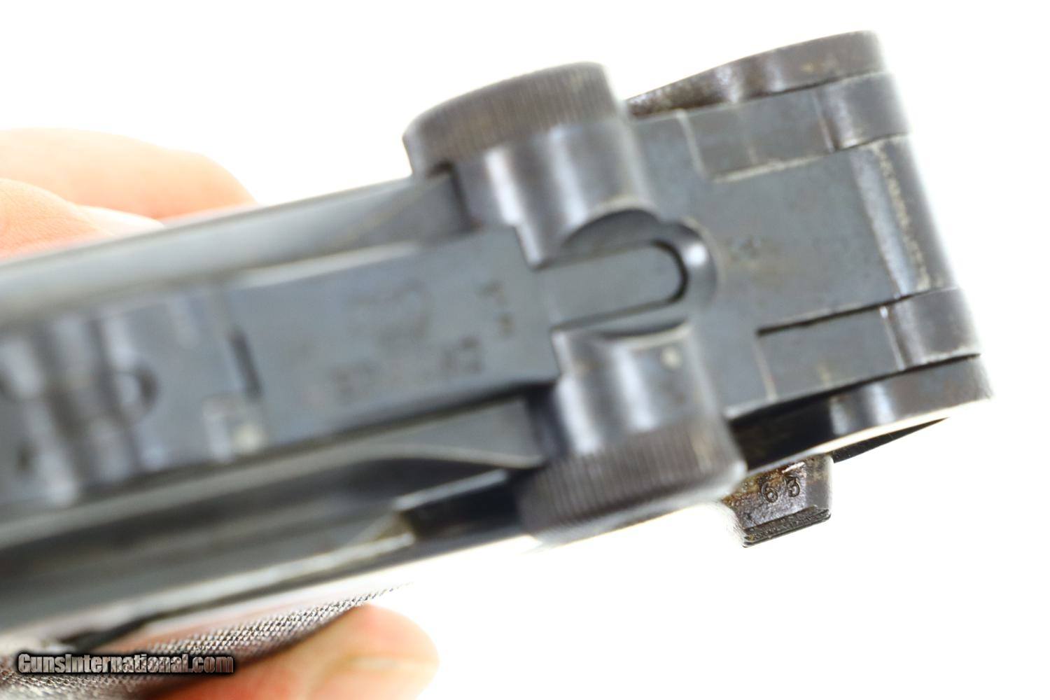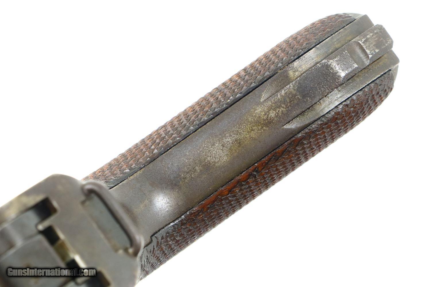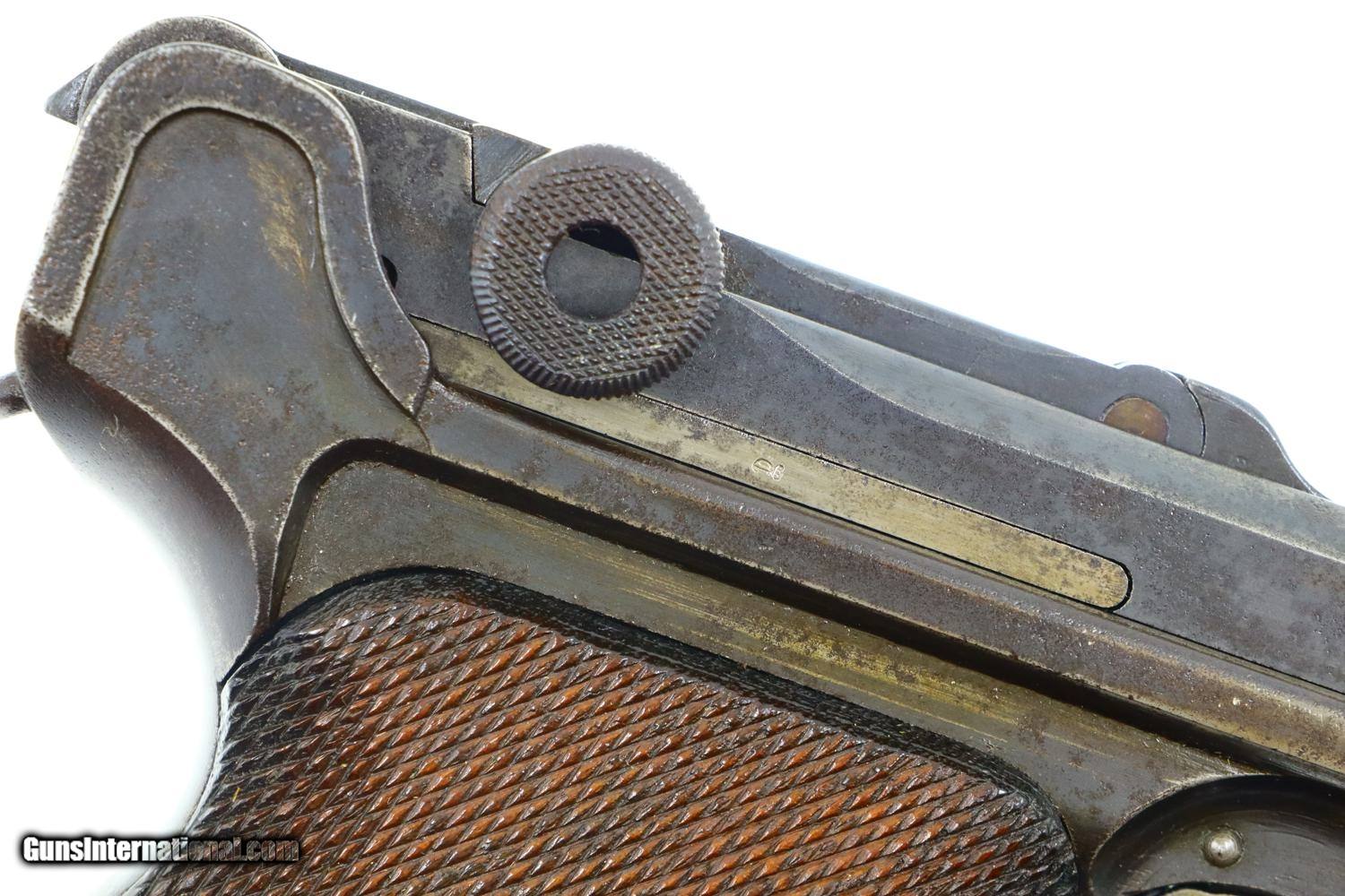 Description: Synopsis: Scarce Erfurt, 1914, German Artillery Luger, 2363, FB00765 Description: Standard configuration and all matching Erfurt Artillery Luger from WWI, caliber 9mmP, made 1914, with fine tune front and rear sight, the rear sight with the usual 1-8 stops for cursor elevation. Chamber dated 1914 with Erfurt on front toogle link. Usual proofs on right side of barrel extention. Full serial number on forward frame, under barrel, and left side of barrel extention. Last two digits on all usual small parts including the grips. Magazine plug with larger numberals, as struck the earliest military pistols, digits not discernable. Condition: Generously "G" orginal blue with considerable toning throughout as carefully photographed. Same consideration applies to the strawed small parts that show no evidence of enhancement. Dark grips with slightly blunted checkering, but no splits or significant losses. G magazine with numeration on plug not discernable. Bright bore, sharp rifling. Correct manual mechanics. The earliest of the standard artillery lugers from WWI and the only year in which the Artilleries were made by Erfurt. ~~Insured shipping fee of $65; most packages shipped using FedEx 2nd Day.~~ SOLD Manufacturer: Erfurt Serial Number: 2363 Caliber Info: 9mmP |