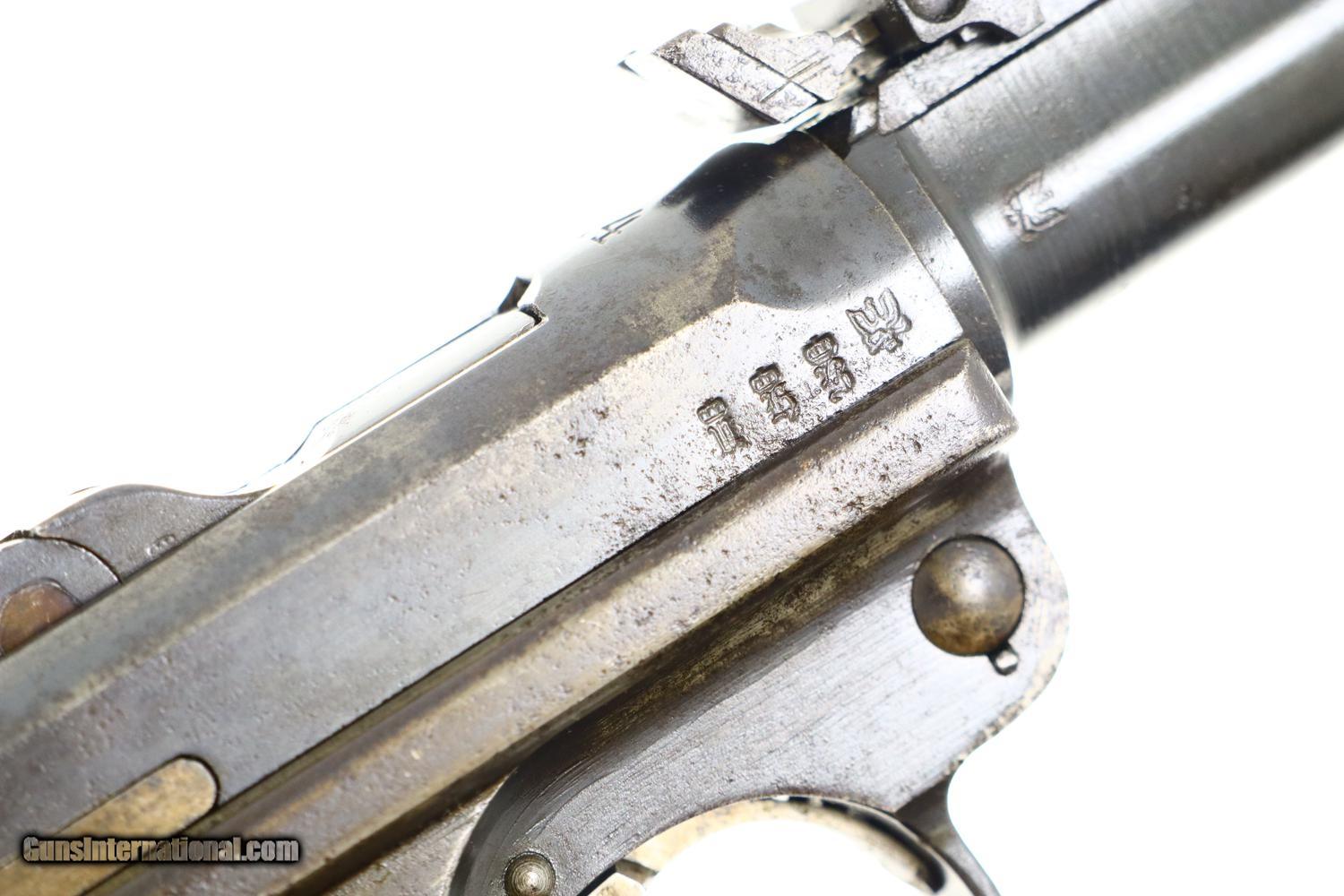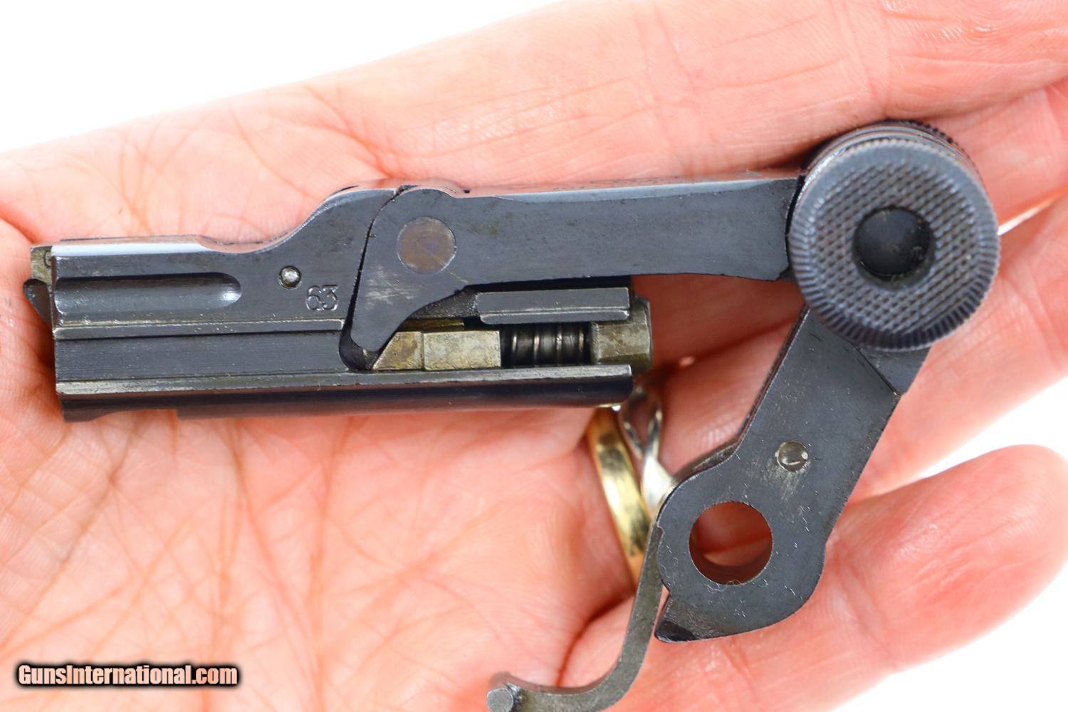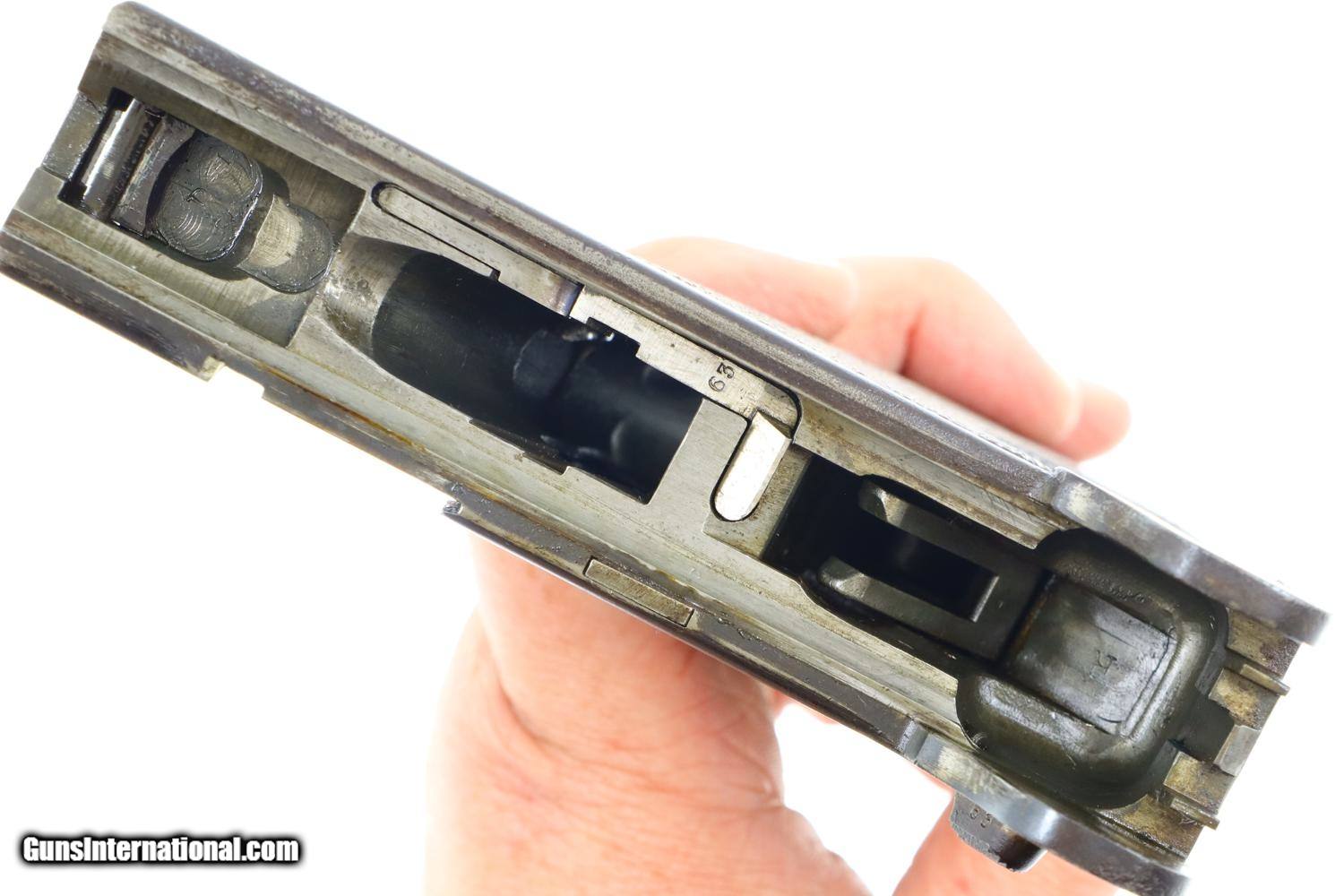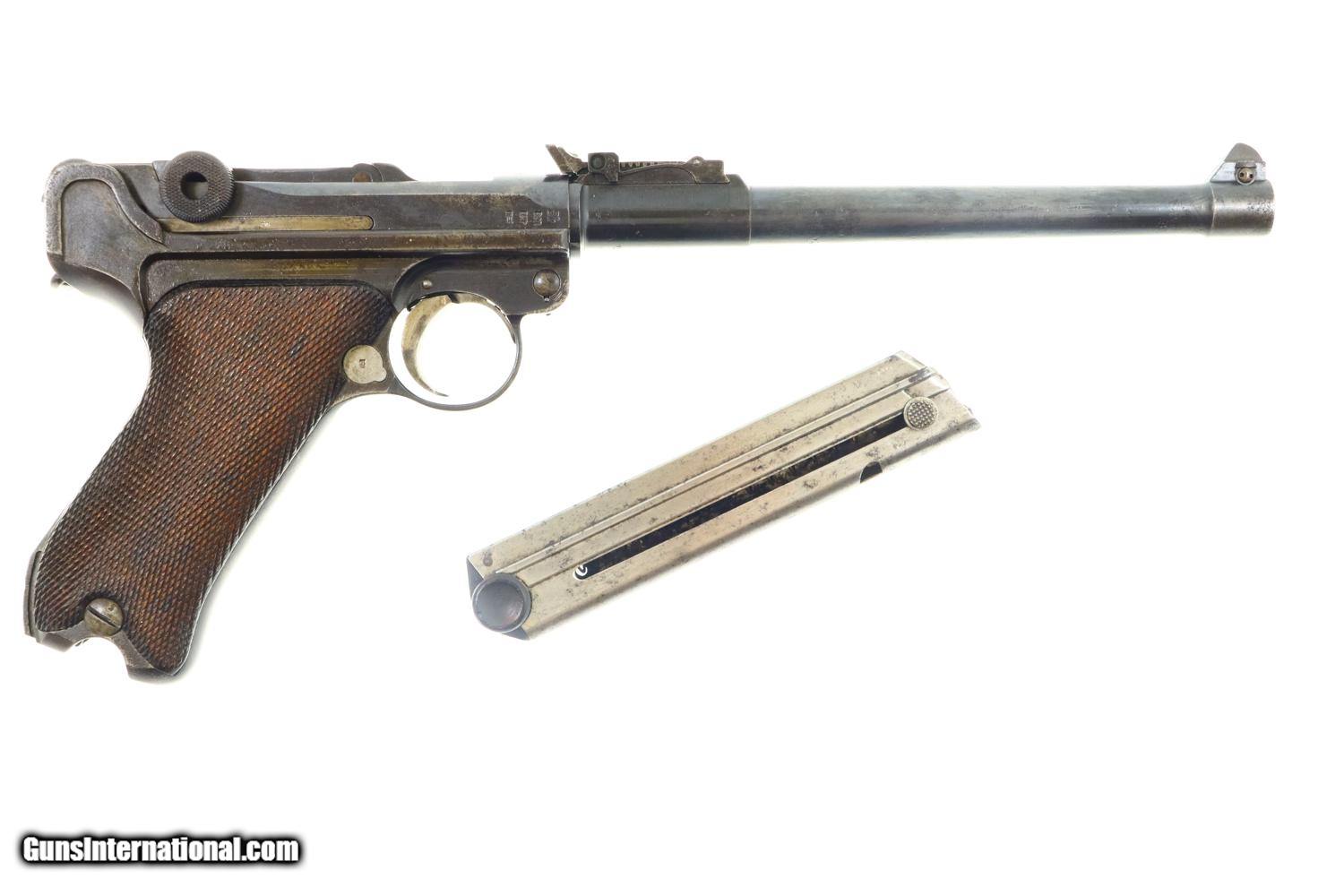 Description: Synopsis: Scarce Erfurt, 1914, German Artillery Luger, 2363, FB00765 Description: Standard configuration and all matching Erfurt Artillery Luger from WWI, caliber 9mmP, made 1914, with fine tune front and rear sight, the rear sight with the usual 1-8 stops for cursor elevation. Chamber dated 1914 with Erfurt on front toogle link. Usual proofs on right side of barrel extention. Full serial number on forward frame, under barrel, and left side of barrel extention. Last two digits on all usual small parts including the grips. Magazine plug with larger numberals, as struck the earliest military pistols, digits not discernable. Condition: Generously "G" orginal blue with considerable toning throughout as carefully photographed. Same consideration applies to the strawed small parts that show no evidence of enhancement. Dark grips with slightly blunted checkering, but no splits or significant losses. G magazine with numeration on plug not discernable. Bright bore, sharp rifling. Correct manual mechanics. The earliest of the standard artillery lugers from WWI and the only year in which the Artilleries were made by Erfurt. ~~Insured shipping fee of $65; most packages shipped using FedEx 2nd Day.~~ SOLD Manufacturer: Erfurt Serial Number: 2363 Caliber Info: 9mmP |