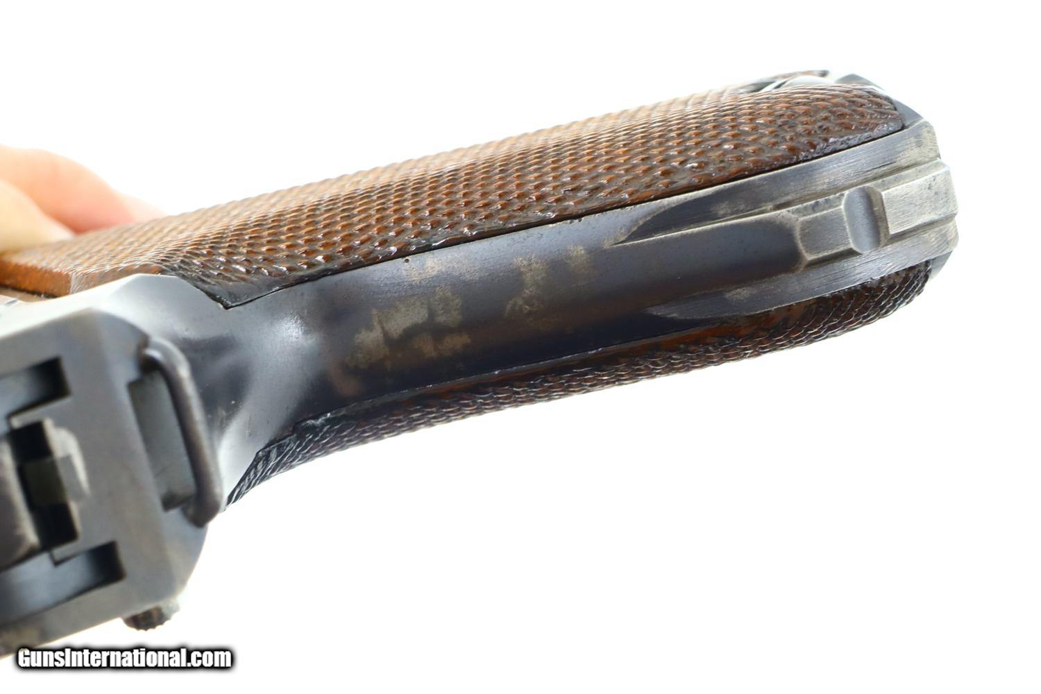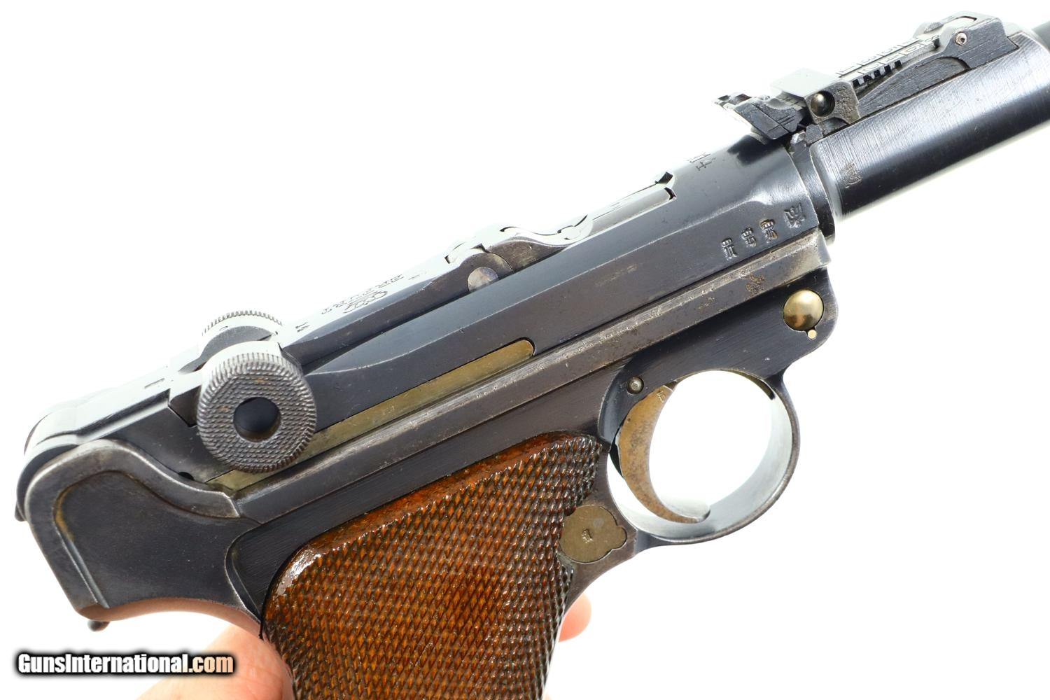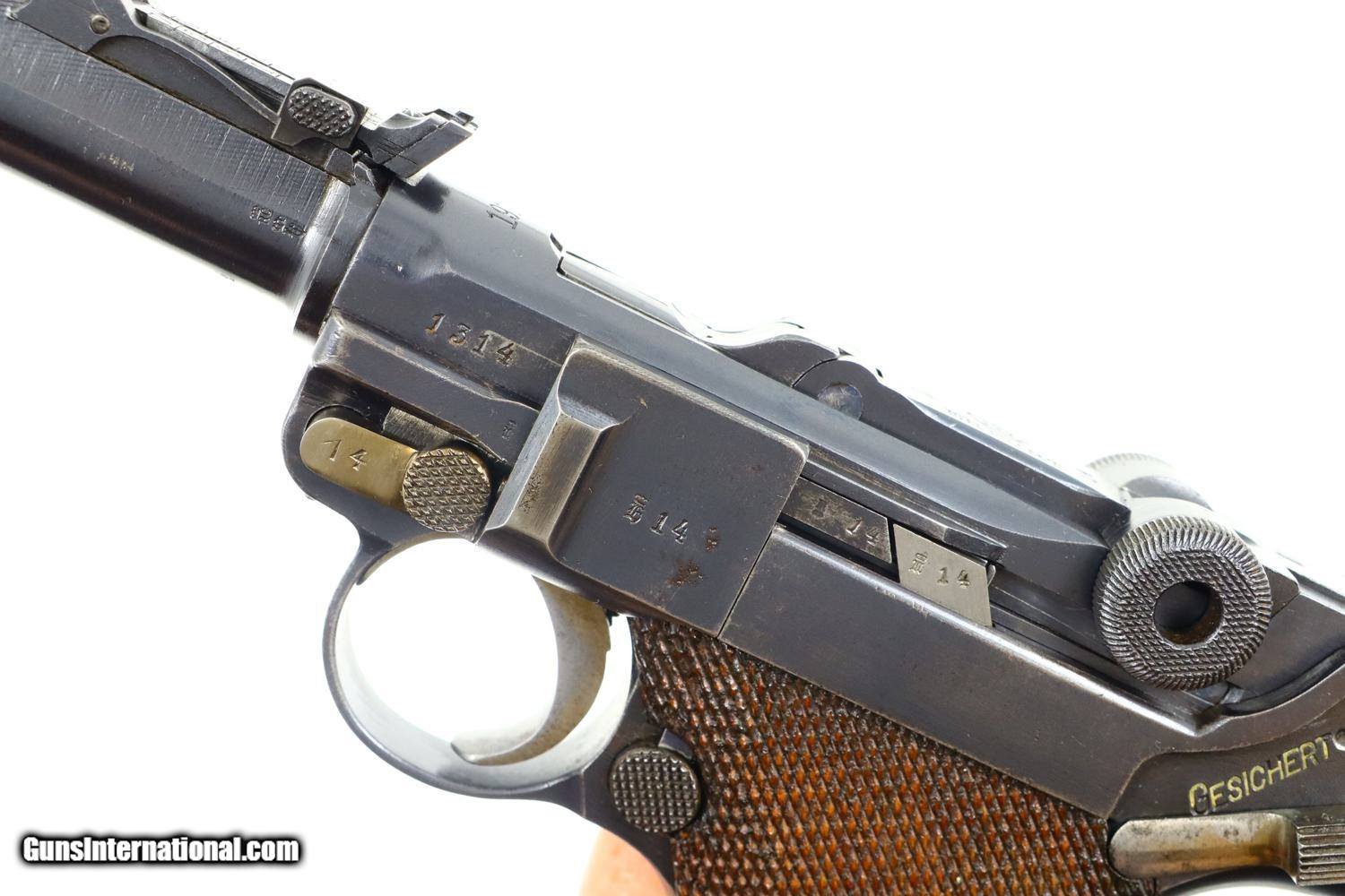 Description: Synopsis: Scarce Erfurt, 1914 German Artillery Luger, 1314a, FB00780 Description: Attractive and all matching Erfurt Artillery Luger from WWI, caliber 9mmP, made 1914, with fine tune front and rear sight, the rear sight with the usual 1-8 stops for cursor elevation. Chamber dated 1914 with Erfurt on front toogle link. Usual proofs on right side of barrel extention. Full serial number on forward frame, under barrel, and left side of barrel extention. Last two digits on all usual small parts including the grips. Erfurt magazine number 8189. Condition: G-VG original blue with comparable condition small parts except for the takedown lever that has been renumbered and strawed. Dark varnished grips with slightly blunted checkering, but no splits or significant losses. VG/EXC originial Erufut magazine. Bright bore, lightly etched with sharp rifling. Correct manual mechanics. A much better than average Erfurt Artillery Luger, difficult to find under any circumstance! ~~Insured shipping fee of $65; most packages shipped using FedEx 2nd Day.~~ SOLD Manufacturer: Erfurt Serial Number: 1314a Caliber Info: 9mmP |