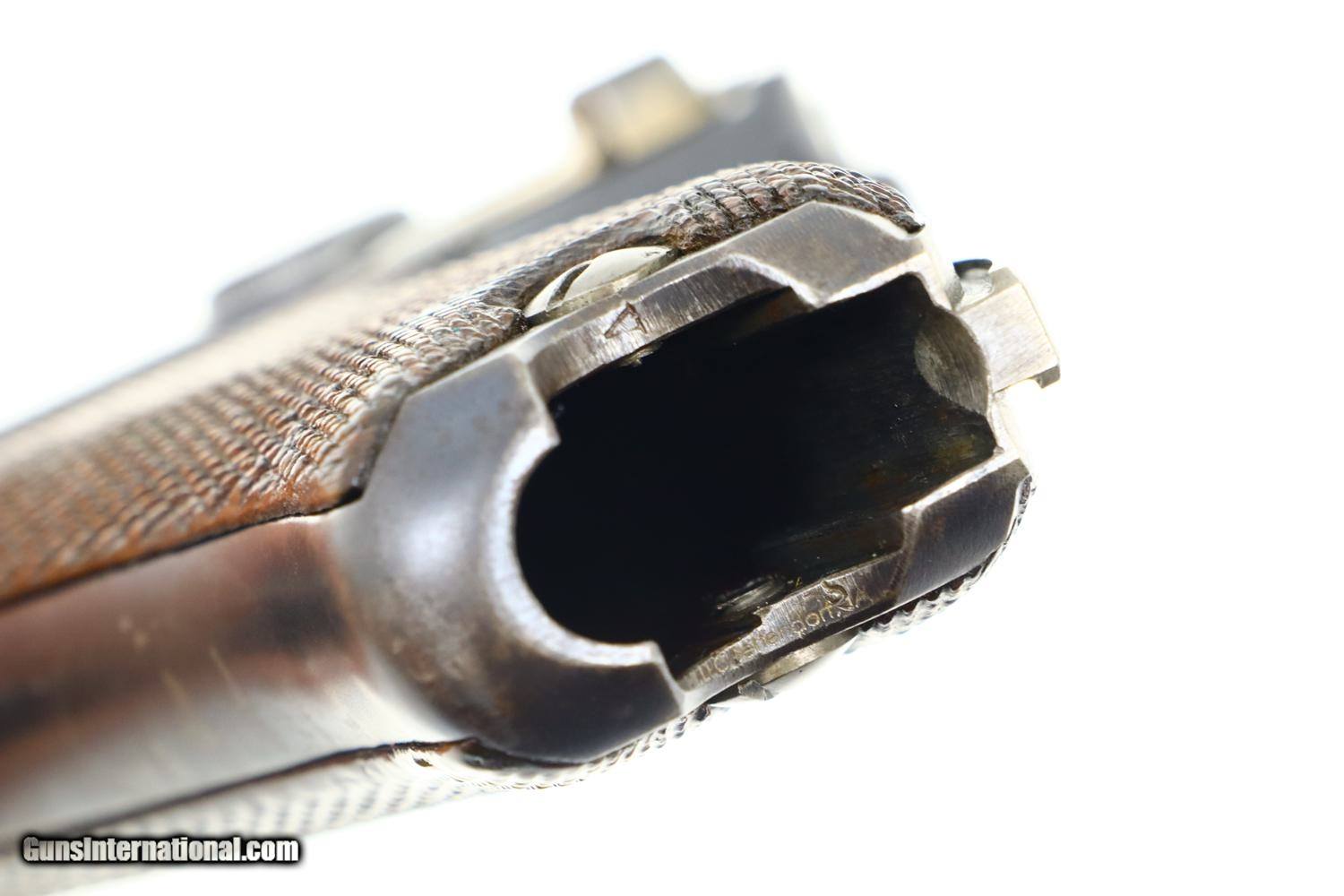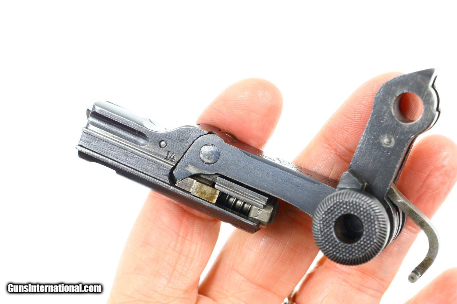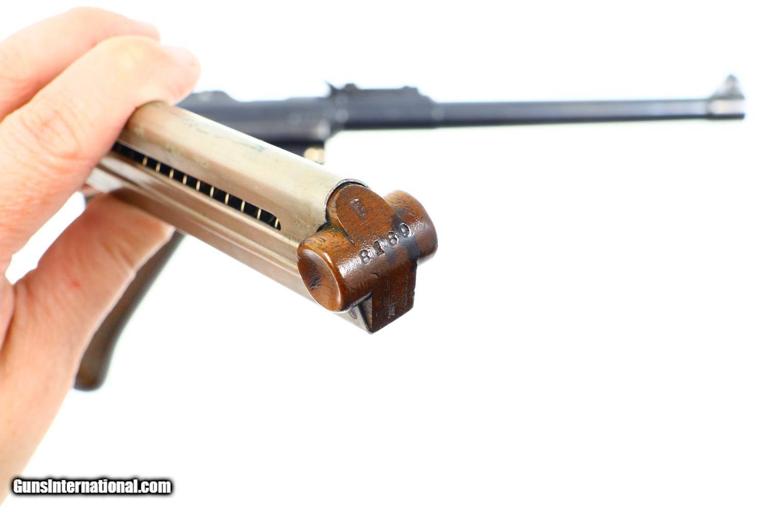 Description: Synopsis: Scarce Erfurt, 1914 German Artillery Luger, 1314a, FB00780 Description: Attractive and all matching Erfurt Artillery Luger from WWI, caliber 9mmP, made 1914, with fine tune front and rear sight, the rear sight with the usual 1-8 stops for cursor elevation. Chamber dated 1914 with Erfurt on front toogle link. Usual proofs on right side of barrel extention. Full serial number on forward frame, under barrel, and left side of barrel extention. Last two digits on all usual small parts including the grips. Erfurt magazine number 8189. Condition: G-VG original blue with comparable condition small parts except for the takedown lever that has been renumbered and strawed. Dark varnished grips with slightly blunted checkering, but no splits or significant losses. VG/EXC originial Erufut magazine. Bright bore, lightly etched with sharp rifling. Correct manual mechanics. A much better than average Erfurt Artillery Luger, difficult to find under any circumstance! ~~Insured shipping fee of $65; most packages shipped using FedEx 2nd Day.~~ SOLD Manufacturer: Erfurt Serial Number: 1314a Caliber Info: 9mmP |