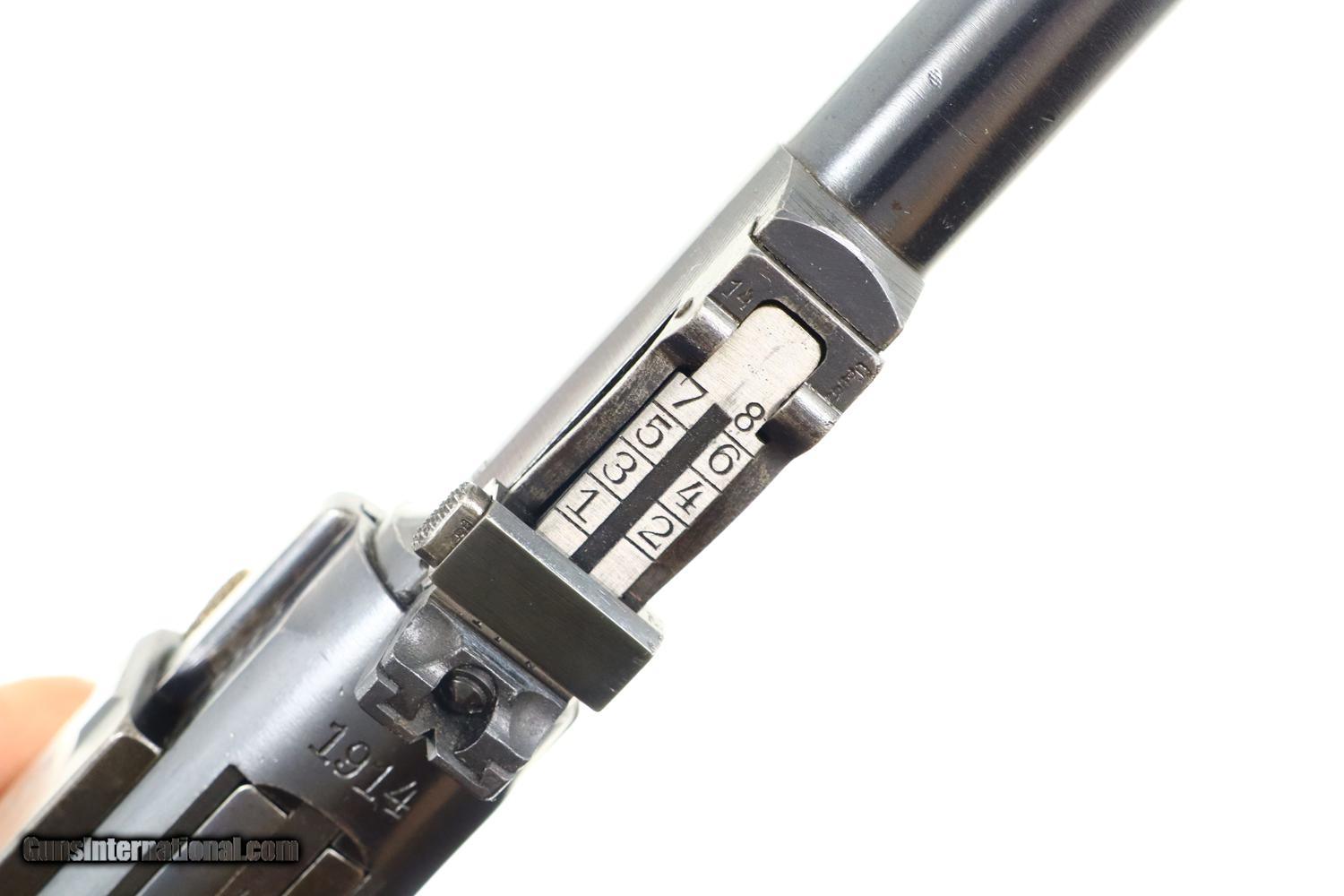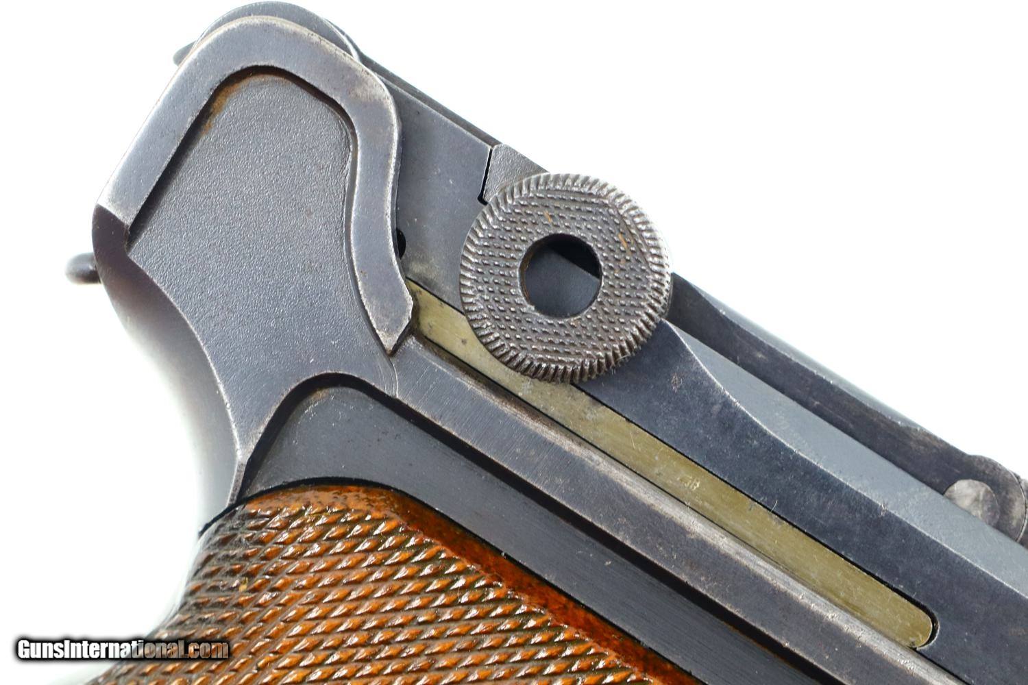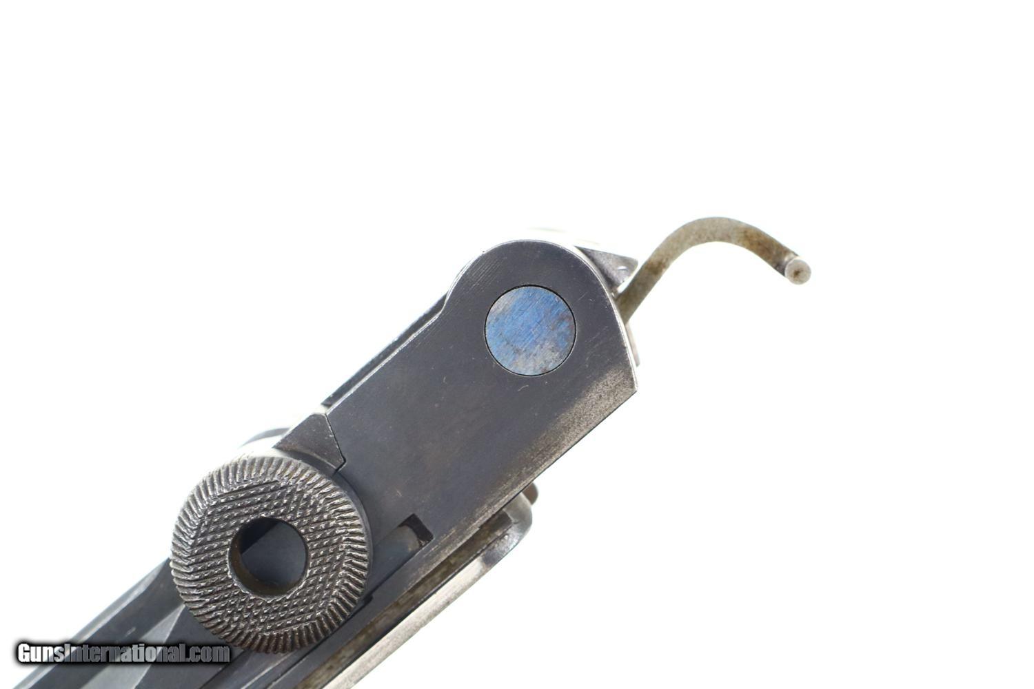 Description: Synopsis: Scarce Erfurt, 1914 German Artillery Luger, 1314a, FB00780 Description: Attractive and all matching Erfurt Artillery Luger from WWI, caliber 9mmP, made 1914, with fine tune front and rear sight, the rear sight with the usual 1-8 stops for cursor elevation. Chamber dated 1914 with Erfurt on front toogle link. Usual proofs on right side of barrel extention. Full serial number on forward frame, under barrel, and left side of barrel extention. Last two digits on all usual small parts including the grips. Erfurt magazine number 8189. Condition: G-VG original blue with comparable condition small parts except for the takedown lever that has been renumbered and strawed. Dark varnished grips with slightly blunted checkering, but no splits or significant losses. VG/EXC originial Erufut magazine. Bright bore, lightly etched with sharp rifling. Correct manual mechanics. A much better than average Erfurt Artillery Luger, difficult to find under any circumstance! ~~Insured shipping fee of $65; most packages shipped using FedEx 2nd Day.~~ SOLD Manufacturer: Erfurt Serial Number: 1314a Caliber Info: 9mmP |
