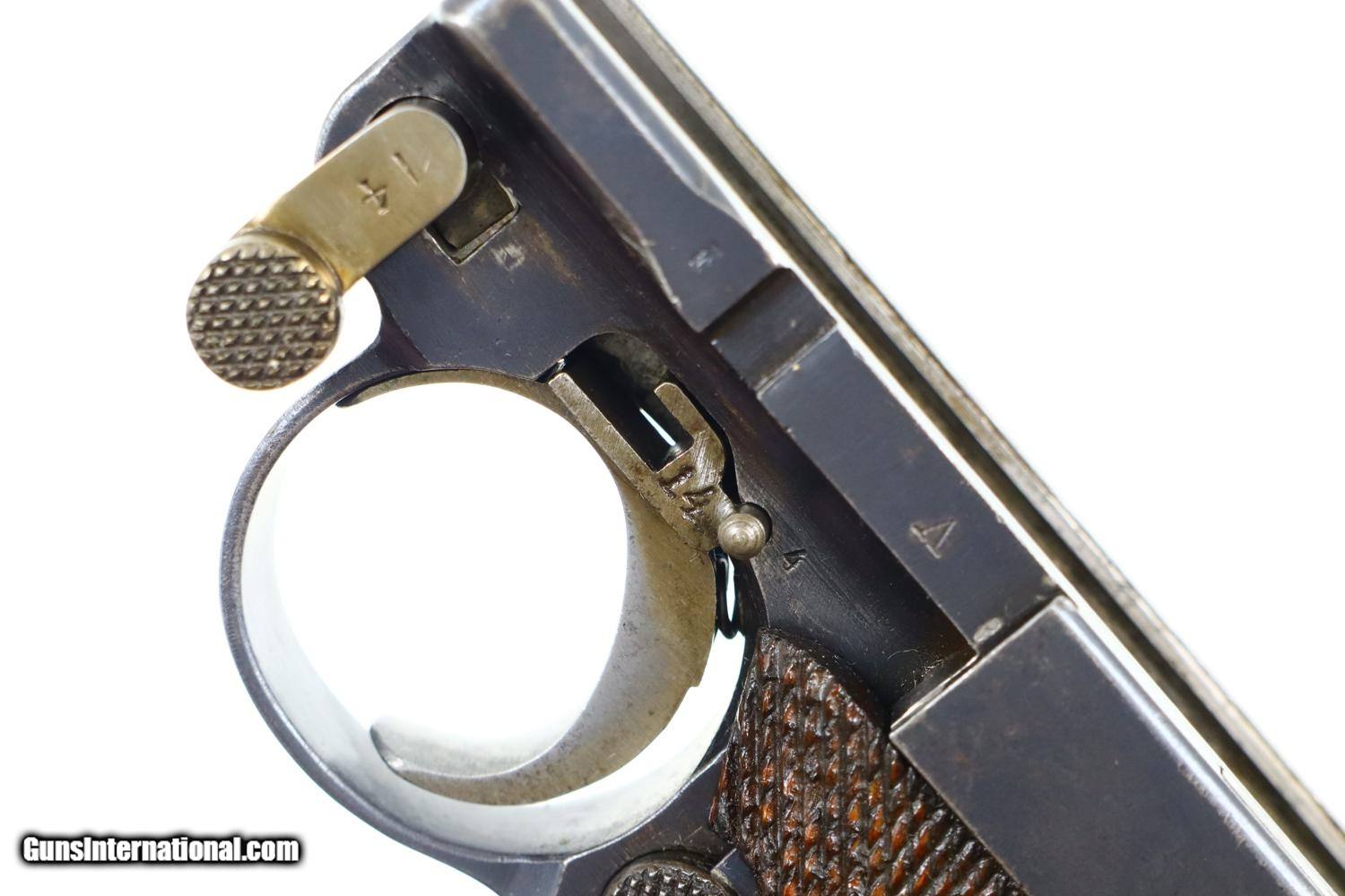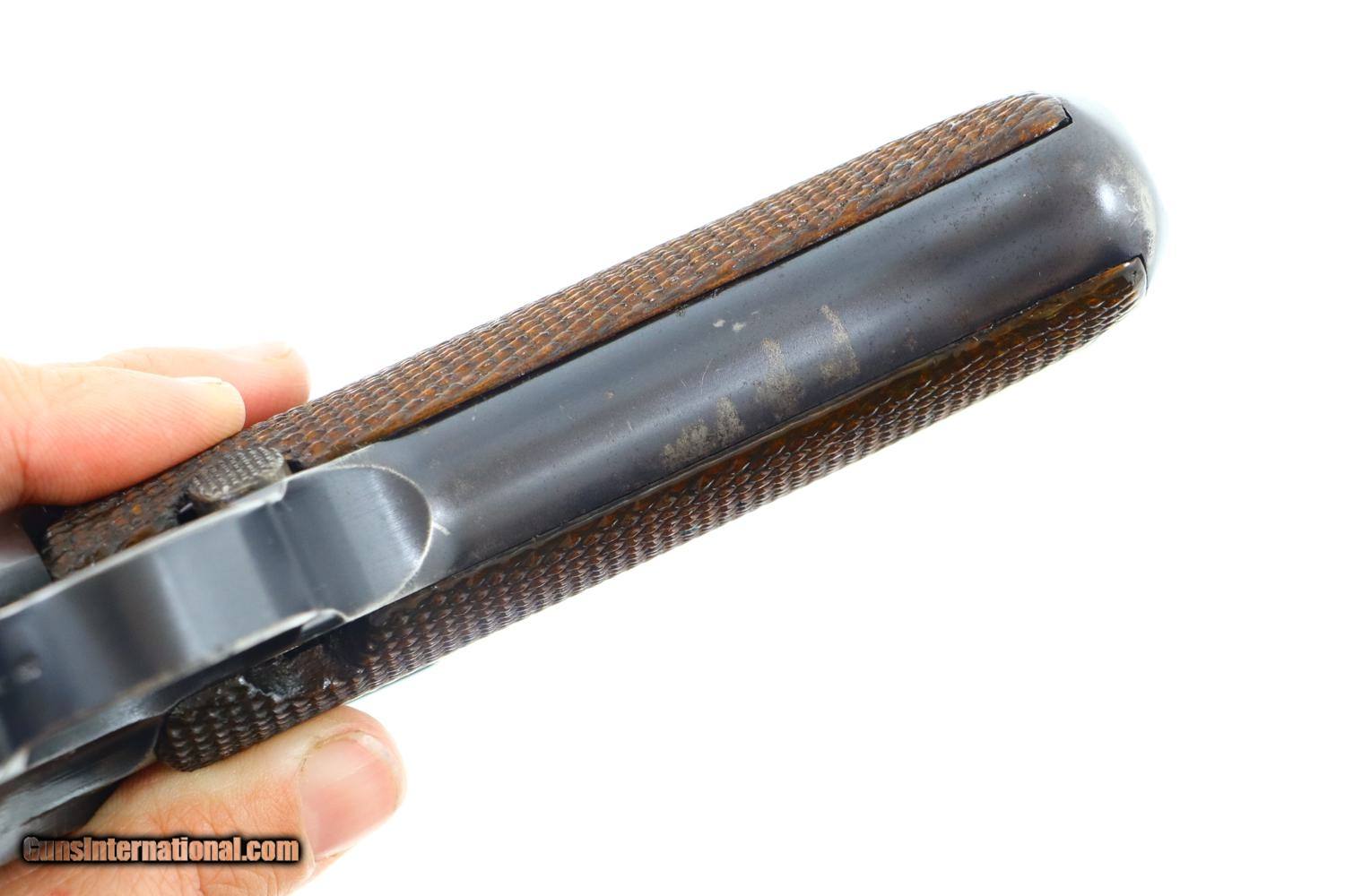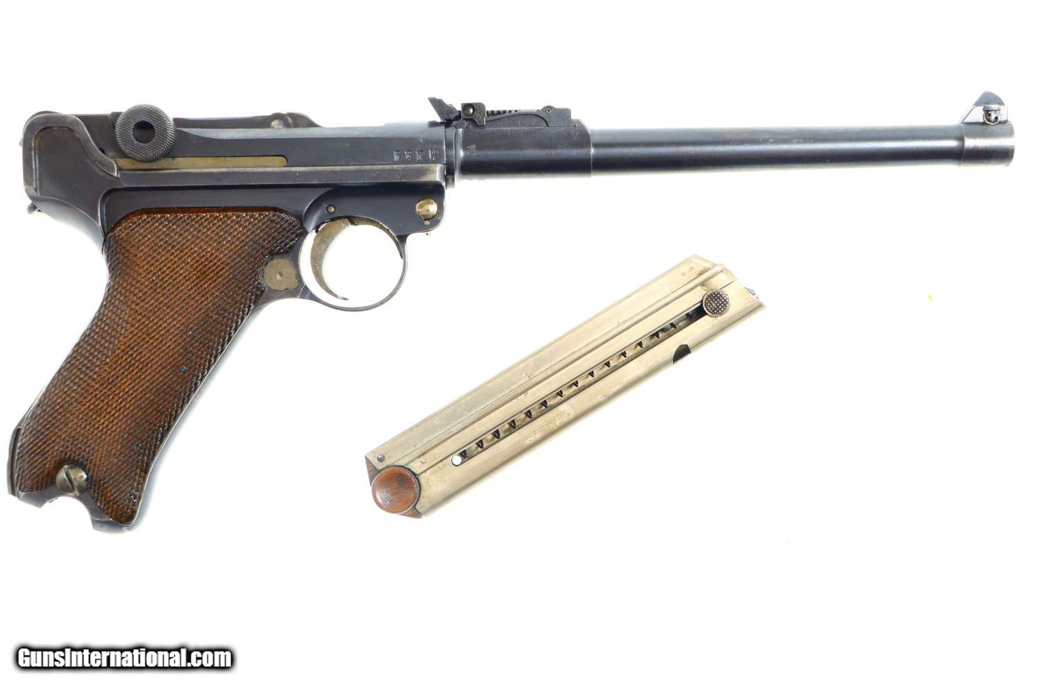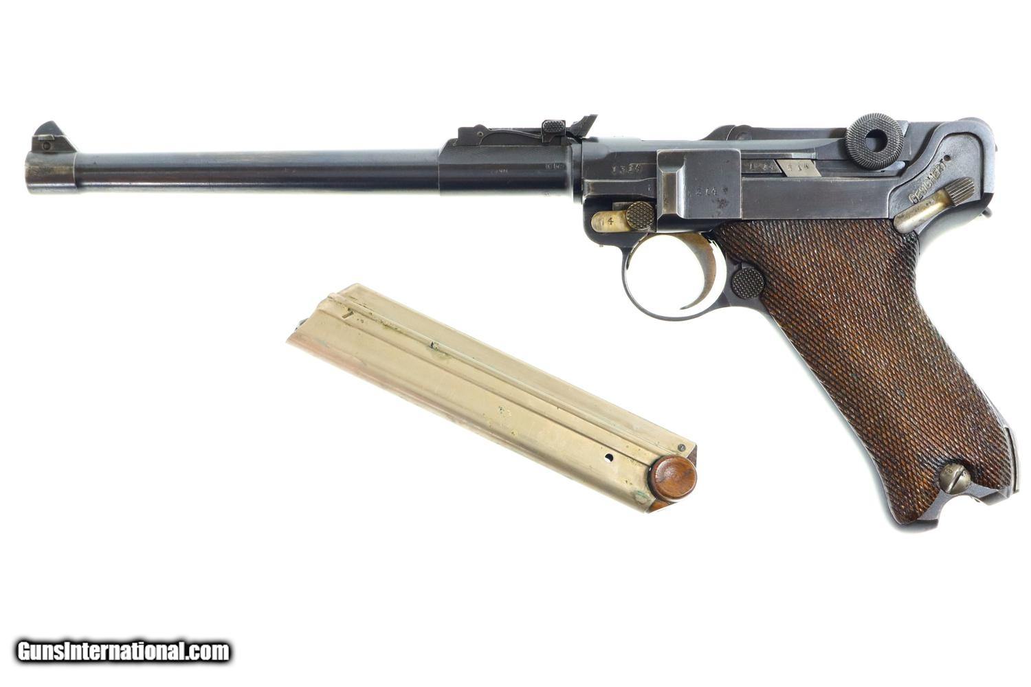 Description: Synopsis: Scarce Erfurt, 1914 German Artillery Luger, 1314a, FB00780 Description: Attractive and all matching Erfurt Artillery Luger from WWI, caliber 9mmP, made 1914, with fine tune front and rear sight, the rear sight with the usual 1-8 stops for cursor elevation. Chamber dated 1914 with Erfurt on front toogle link. Usual proofs on right side of barrel extention. Full serial number on forward frame, under barrel, and left side of barrel extention. Last two digits on all usual small parts including the grips. Erfurt magazine number 8189. Condition: G-VG original blue with comparable condition small parts except for the takedown lever that has been renumbered and strawed. Dark varnished grips with slightly blunted checkering, but no splits or significant losses. VG/EXC originial Erufut magazine. Bright bore, lightly etched with sharp rifling. Correct manual mechanics. A much better than average Erfurt Artillery Luger, difficult to find under any circumstance! ~~Insured shipping fee of $65; most packages shipped using FedEx 2nd Day.~~ SOLD Manufacturer: Erfurt Serial Number: 1314a Caliber Info: 9mmP |