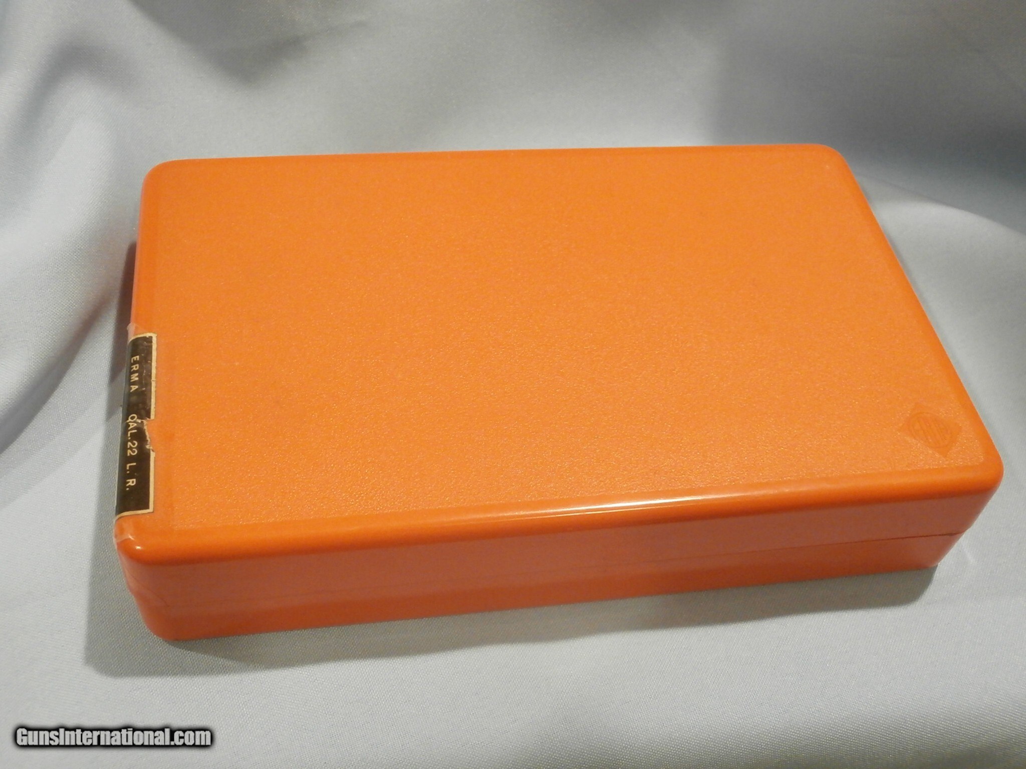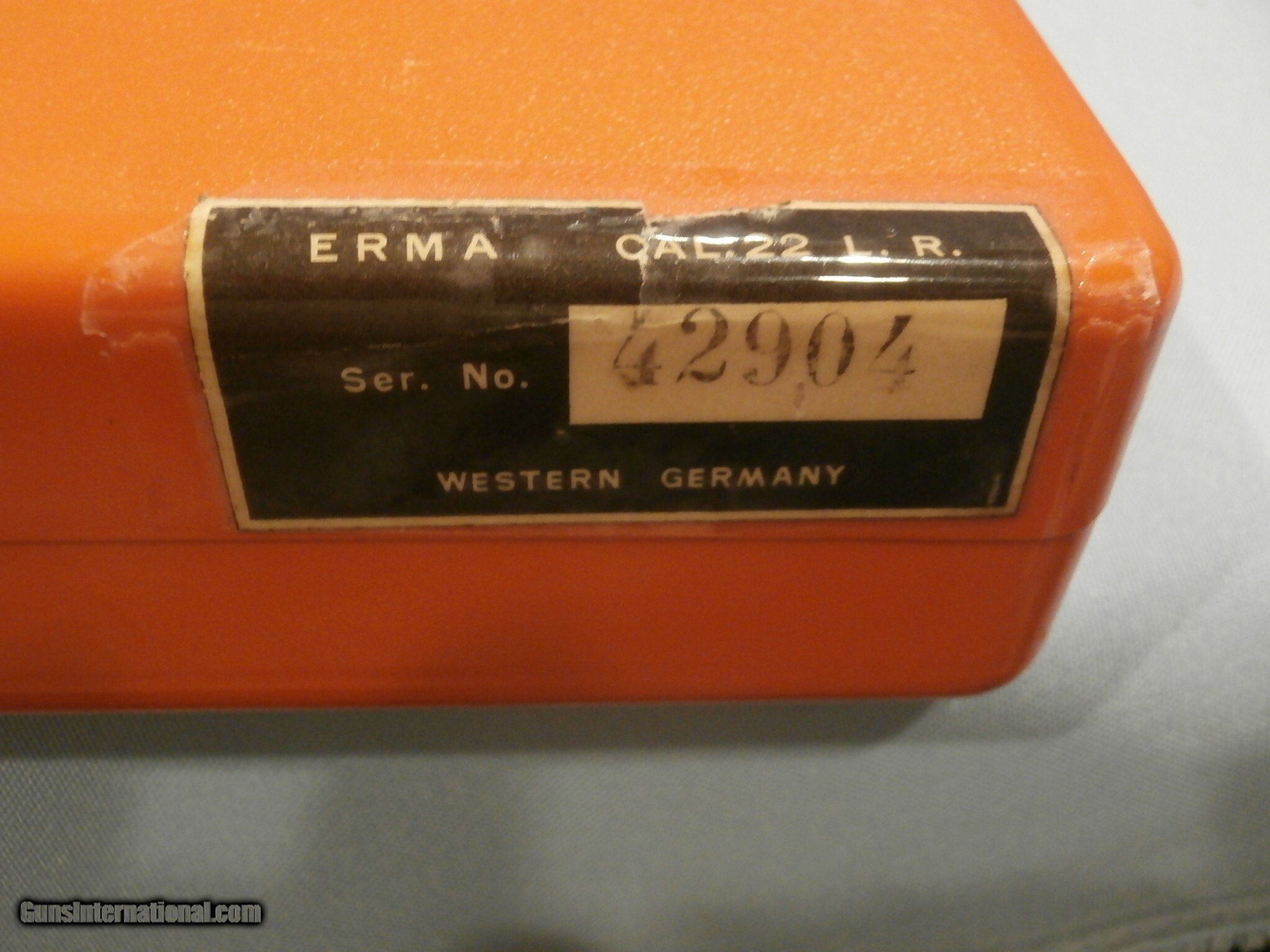Description: ERMA LA-22 P-08 STYLE .22LR PISTOL THREE MAGAZINES! ORIGINAL, ERMA, FACTORY MANUAL...SEE PICS. EXCELLENT CONDITION!...SEE PICS. TWO (2) ORIGINAL 8-ROUND, FACTORY MAGAZINES, PLUS ONE (1) AFTERMARKET MAGAZINE...SEE PICS. ORIGINAL, CHECKERED WALNUT GRIPS IN EXCELLENT CONDITION!...SEE PICS. MADE IN 1966 IN GERMANY...SEE PICS. ORIGINAL, MATCHING, ERMA, FACTORY, SERIAL-NUMBERED CASE!!...SEE PICS. THIS IS A SOLID .22 PISTOL AT 24oz!! Handgun Caliber: .22 Long Rifle Manufacturer: ERMA WERKE Model: LA-22 Serial Number: 429XX Barrel Length: 8cm 3 1/4 Bore Info: BRIGHT & SHINY WITH SHARP RIFLING! Condition: VINTAGE EXCELLENT!! Metal Condition: VINTAGE EXCELLENT! Wood Condition: EXCELLENT CHECKERED WALNUT GRIPS Bore Condition: EXCELLENT! BRIGHT & SHINY! Barrels: 3 1/4 Action: D/A TOGGLE Stock: CHECKERED WALNUT, EXCELLENT. Finish: FACTORY BLUE Weight: APPROX. 24oz Sights: FIXED Manufacture Date: 1966 Grips: FACTORY CHECKERED WALNUT Price: $769.95 Contact Seller |